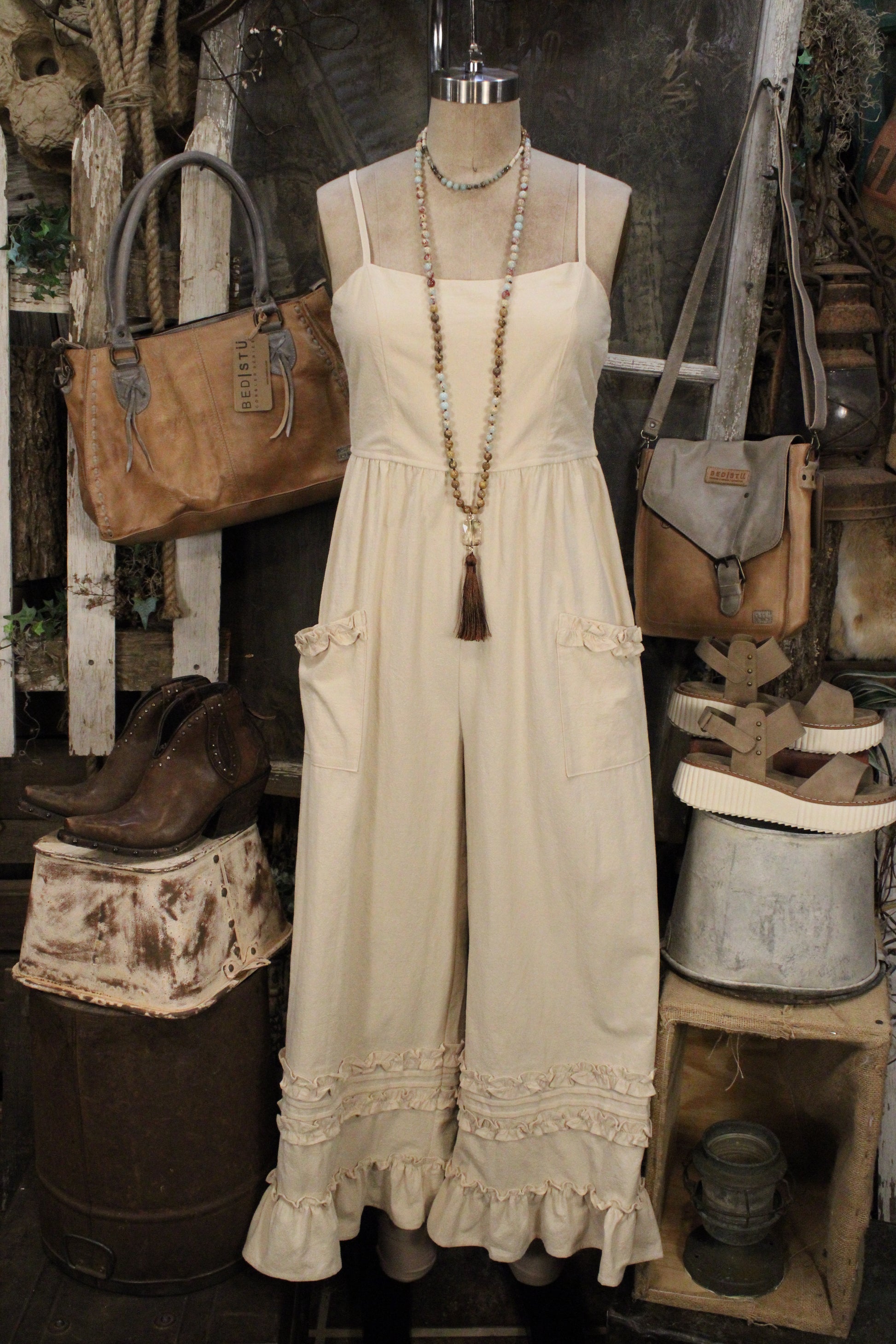 Introducing our Easy Elegance Romper - This soft, feminine romper is an effortless blend of comfort and charm. Designed with a flattering square neckline and delicate adjustable straps, it features a smocked back for an easy, comfortable fit that moves with you throughout the day. The relaxed silhouette flows into wide legs with sweet ruffle detailing at the hem for a touch of playful texture.