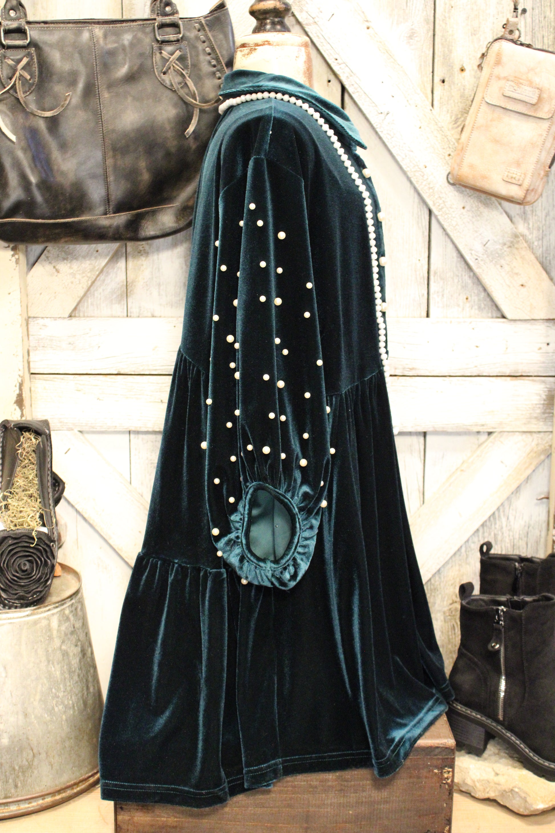 Indulge in the enchanting elegance of the Enchanted Green And Pearls Velvet Tunic- Elevate your everyday style with this stunning velvet pearl-accent top. Crafted in a rich green, this piece blends cozy elegance with a touch of glam. The soft velvet drapes beautifully, while the relaxed babydoll silhouette adds effortless comfort and movement.