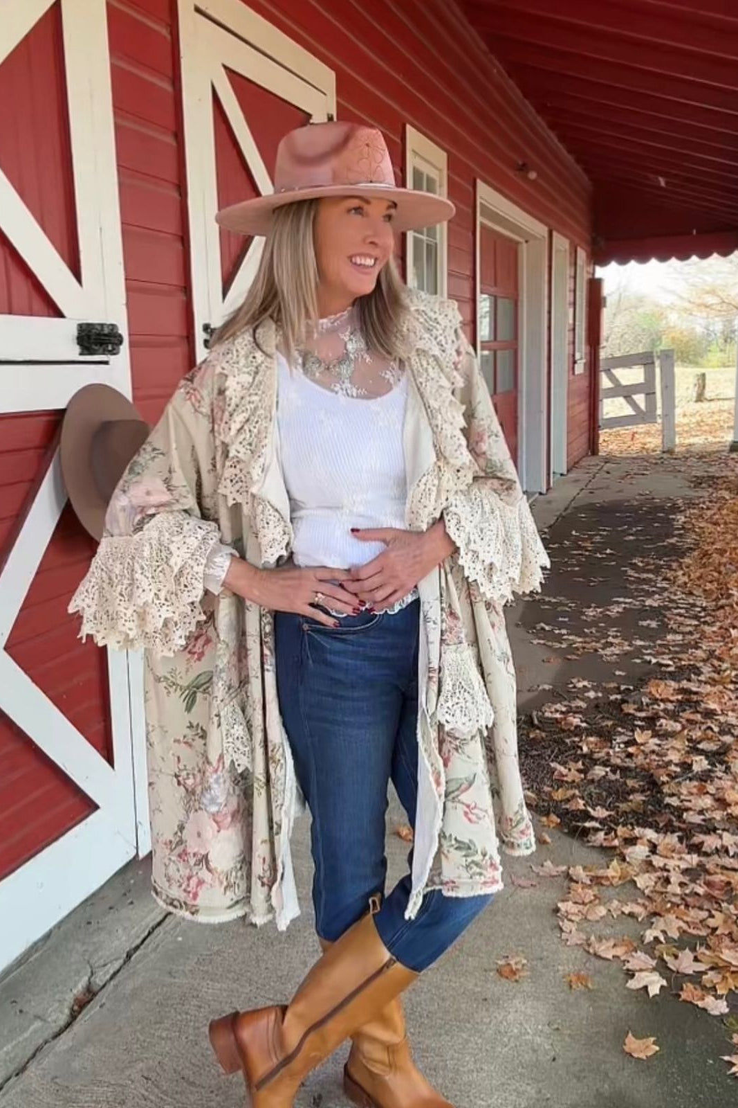 Introducing the charming English Rose Kimono- Step into all-day prettiness with this dreamy floral kimono—an absolute must-have for every Farm Girl at heart. Soft, romantic florals dance across a vintage-washed background, while the most beautiful crochet lace trims the collar and sleeves for that extra touch of heirloom charm.