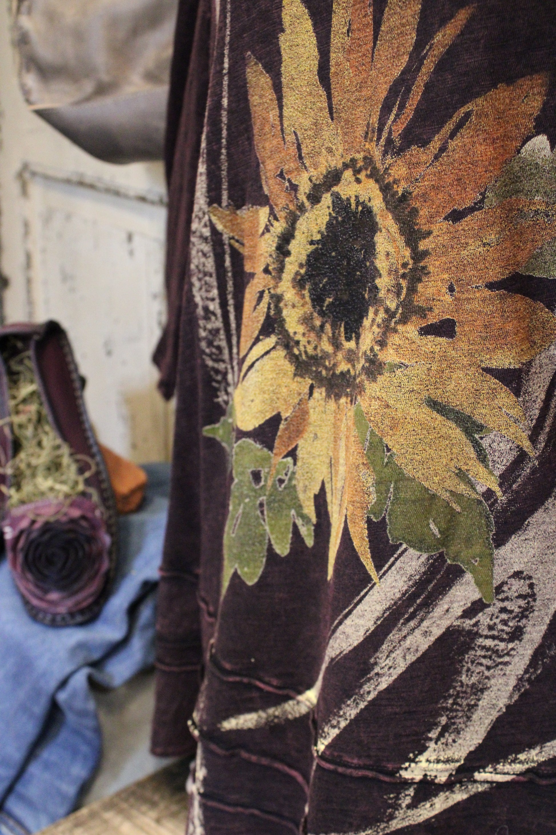 Introducing the Evening Bloom Tunic- Meet the kind of piece that turns heads for all the right reasons — this tunic top is where comfort meets craftsmanship. Every detail feels intentionally elevated: the rich, mineral-washed fabric that drapes beautiful sunflower design that feels like wearable art, and the subtle tiered hem that adds quiet sophistication.