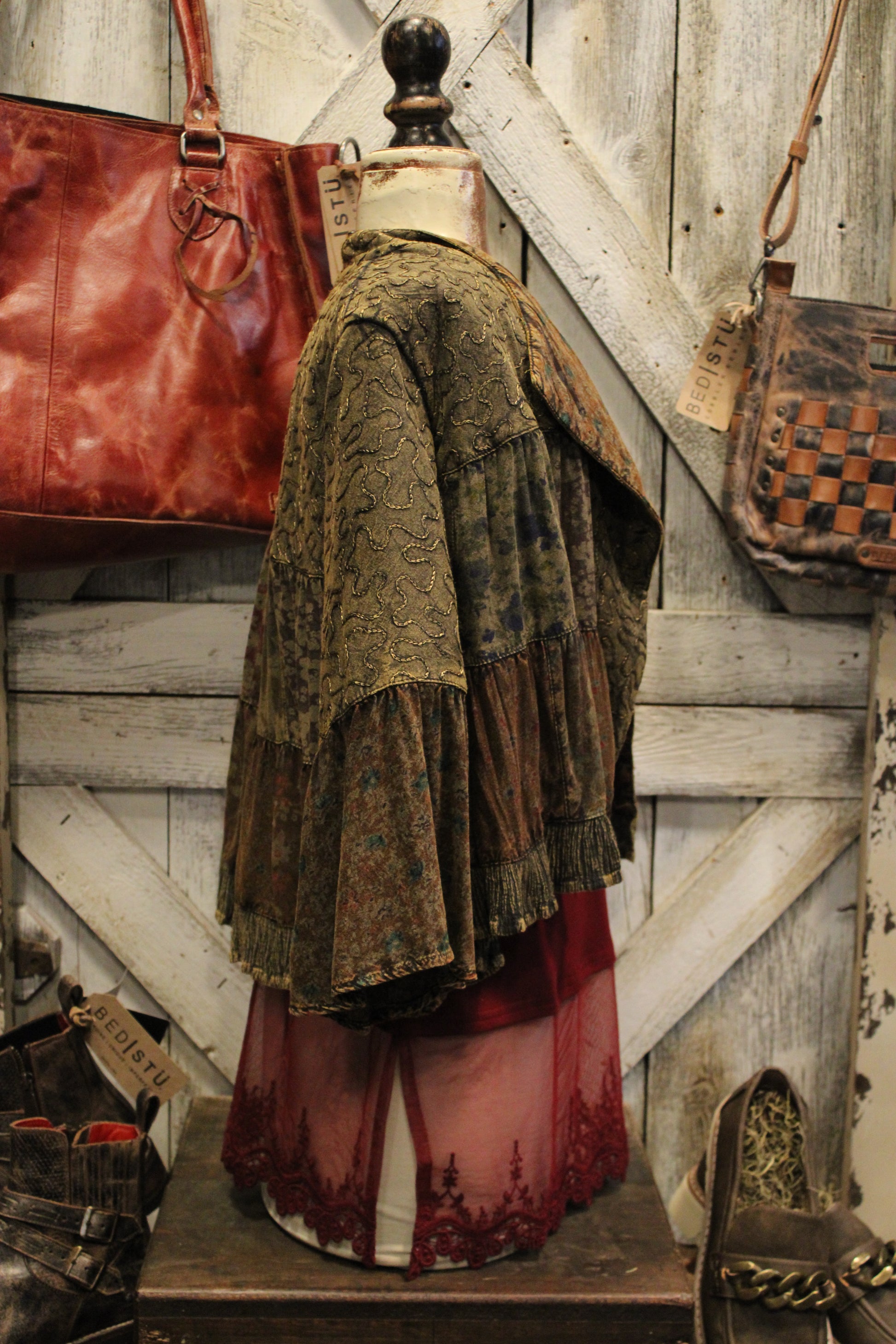 The ruffled hem and wide sleeves give it that touch of free-spirited flair, while the shorter cut makes it perfect for pairing with high-waisted jeans or skirts. Whether you’re headed to brunch, strolling the market, or just want to add a little artsy vibe to your look, this cardigan is all about cozy boho charm.