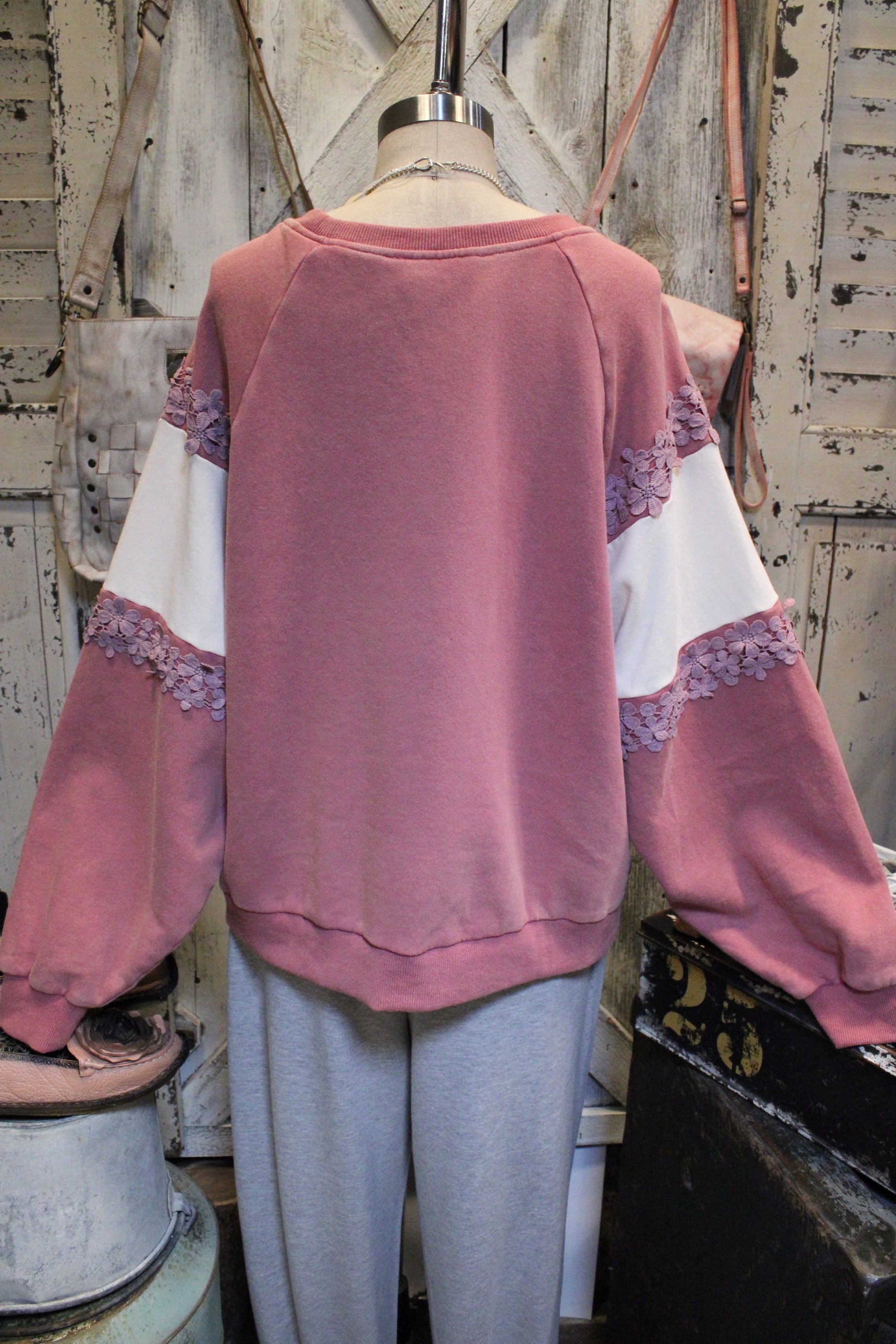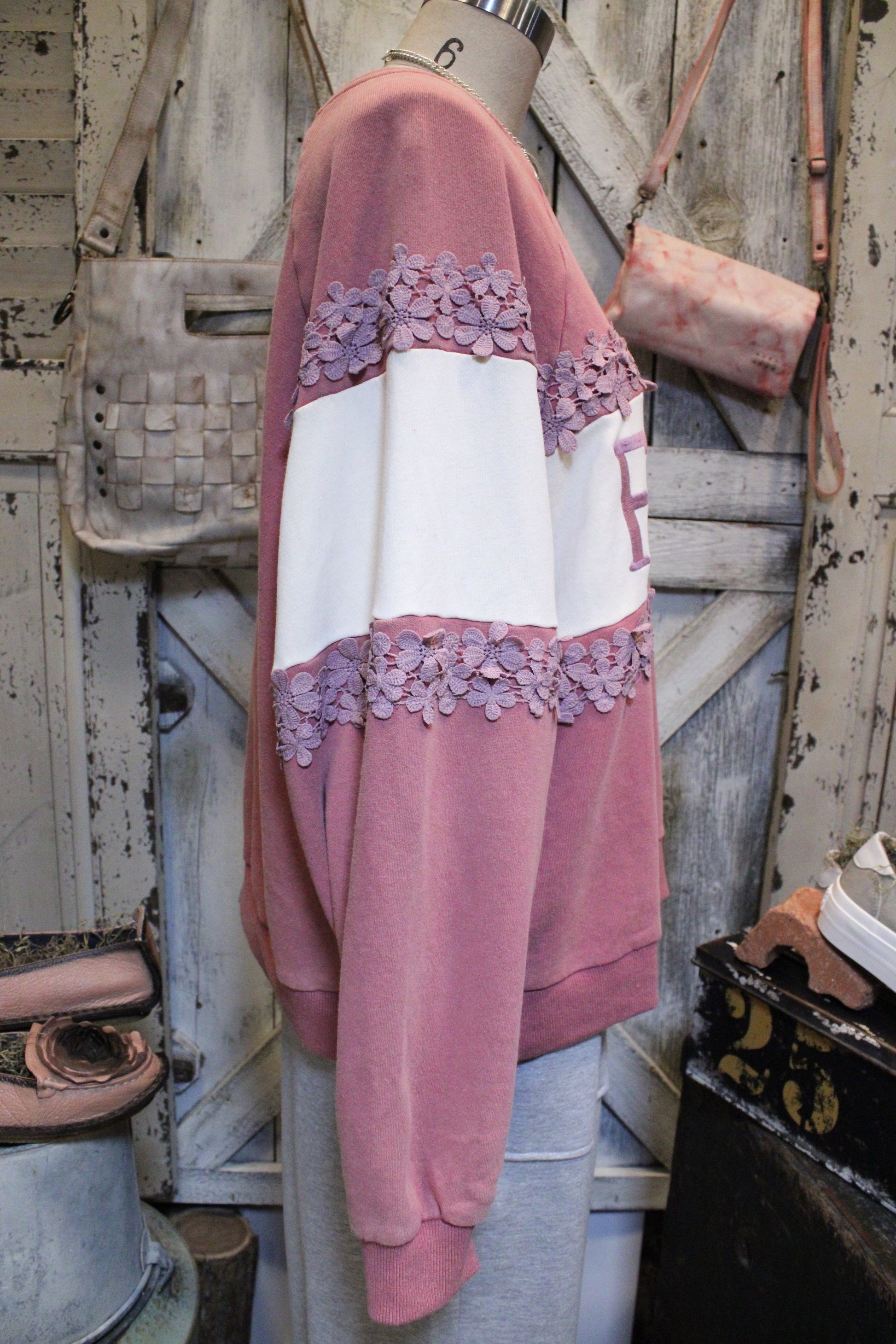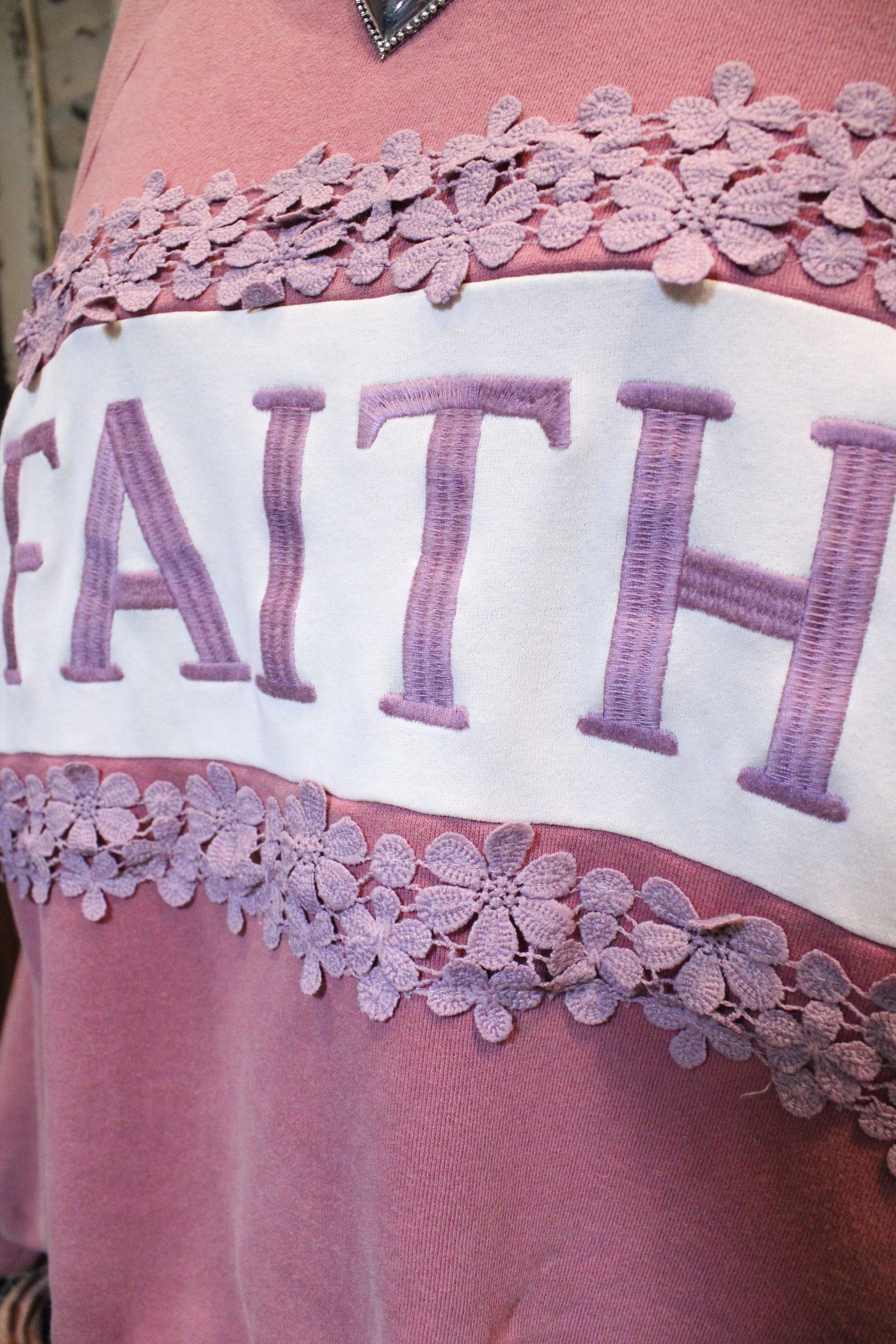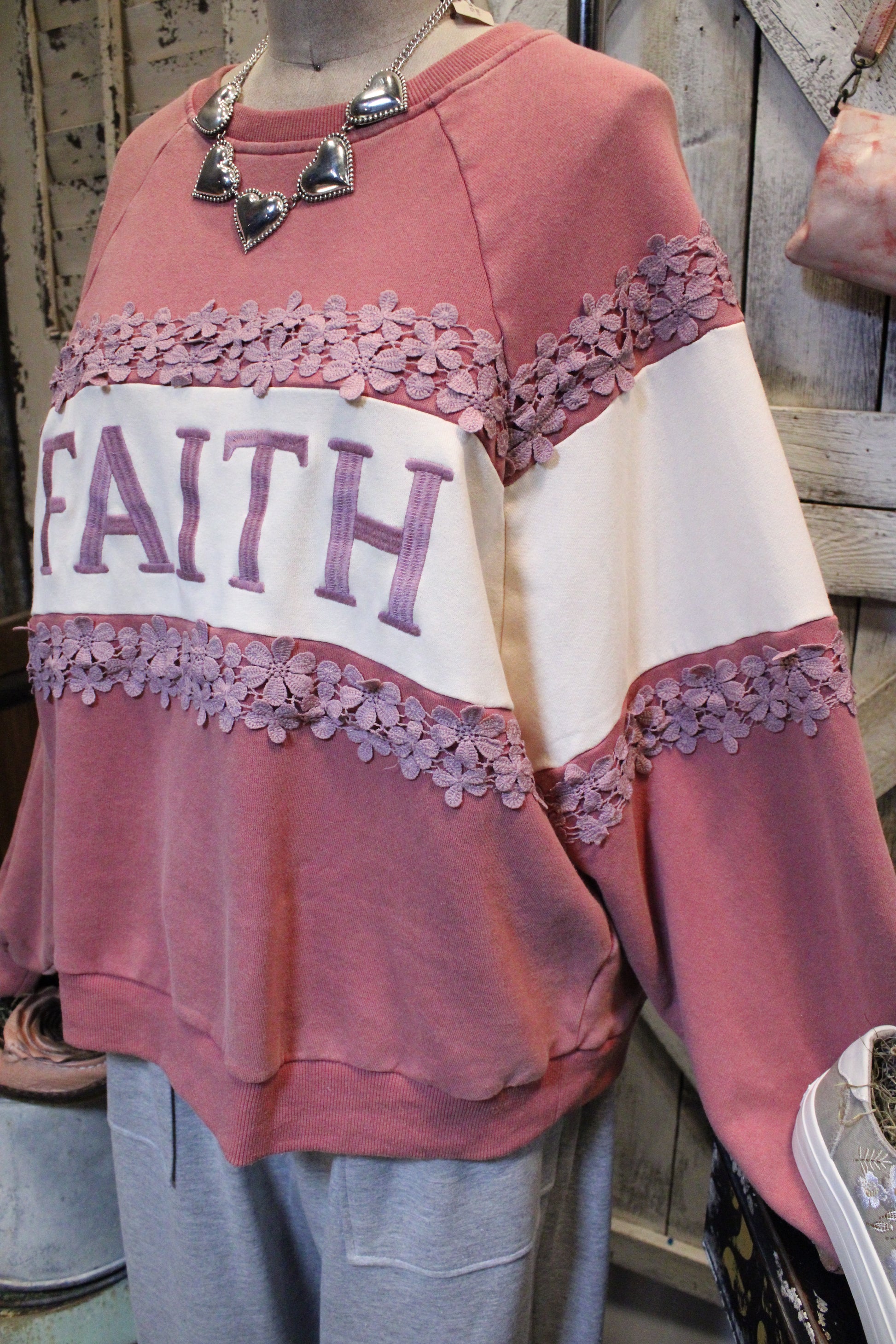 Crafted in a soft blush and ivory color block, this sweatshirt features raised “FAITH” lettering across the front and delicate daisy lace trim that adds a touch of feminine sweetness. The relaxed fit and crew neckline make it perfect for pairing with jeans, leggings, or your favorite lounge pants.