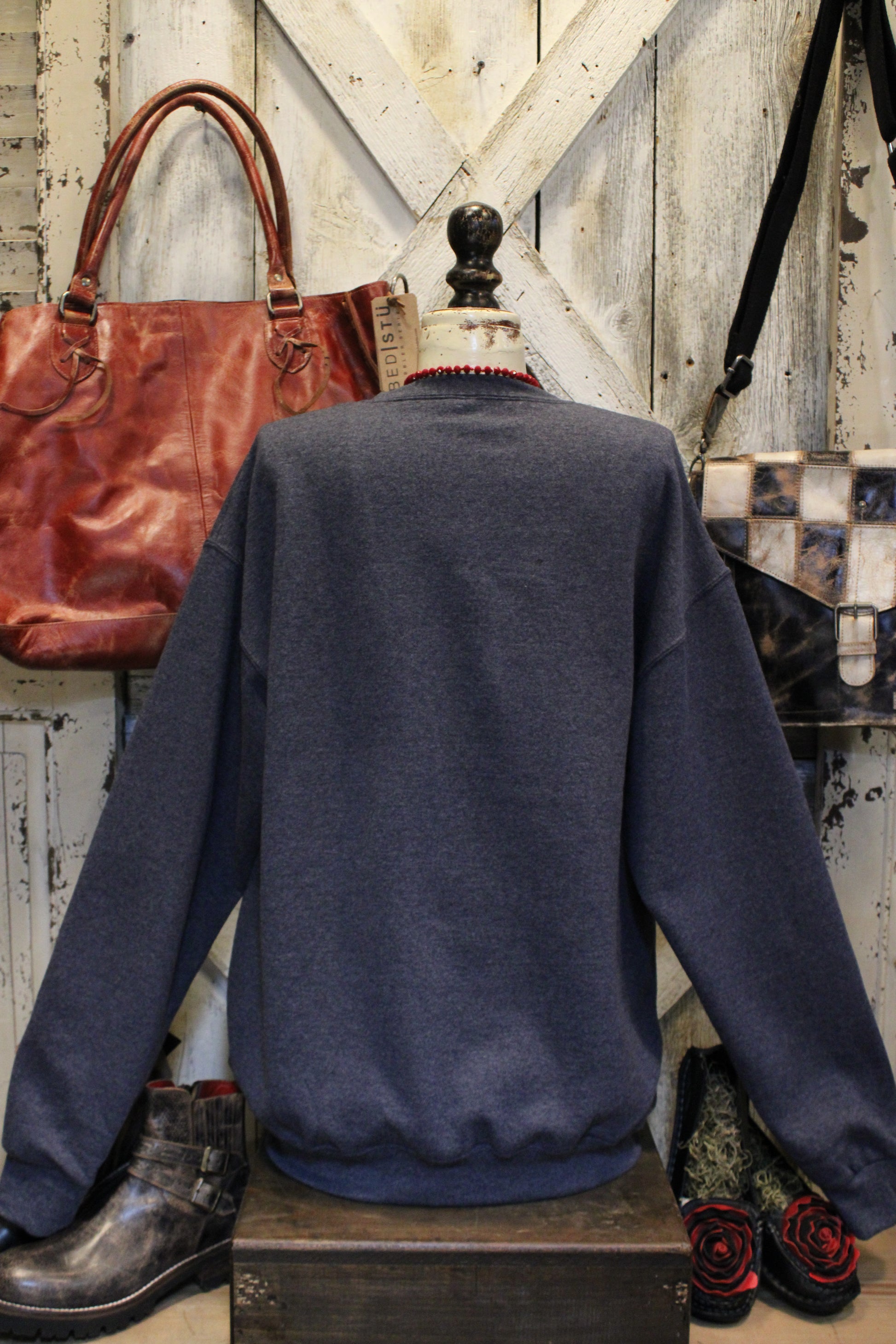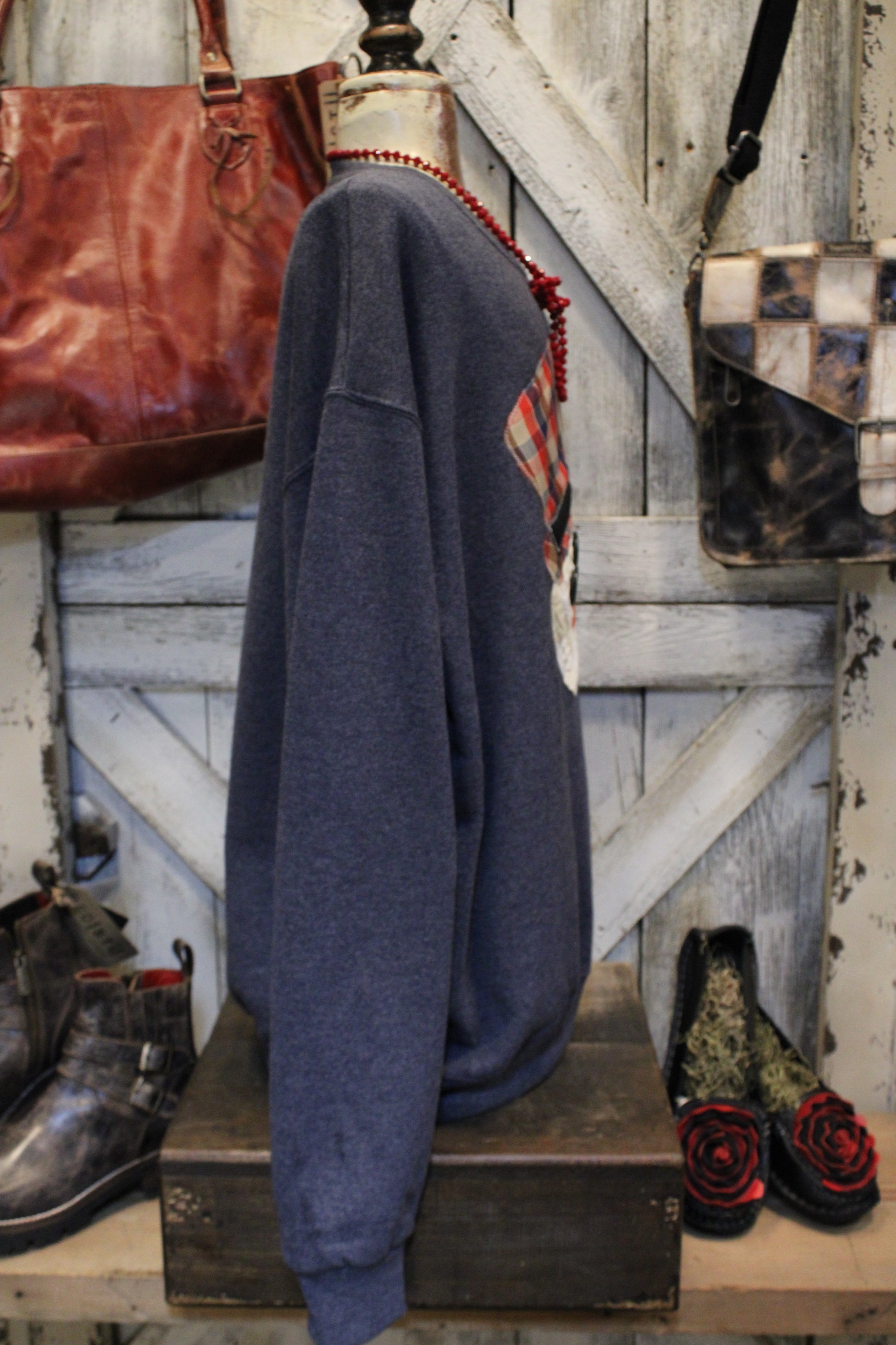 Introducing the FGO Feeling Frosty Vintage Quilt Sweatshirt- This one-of-a-kind piece features a handmade quilt-appliqué snowman, each one stitched with love and a touch of vintage flair. His plaid hat and button eyes give off that perfect homespun, porch-by-the-fire feel — just the way we like it out here on the farm.