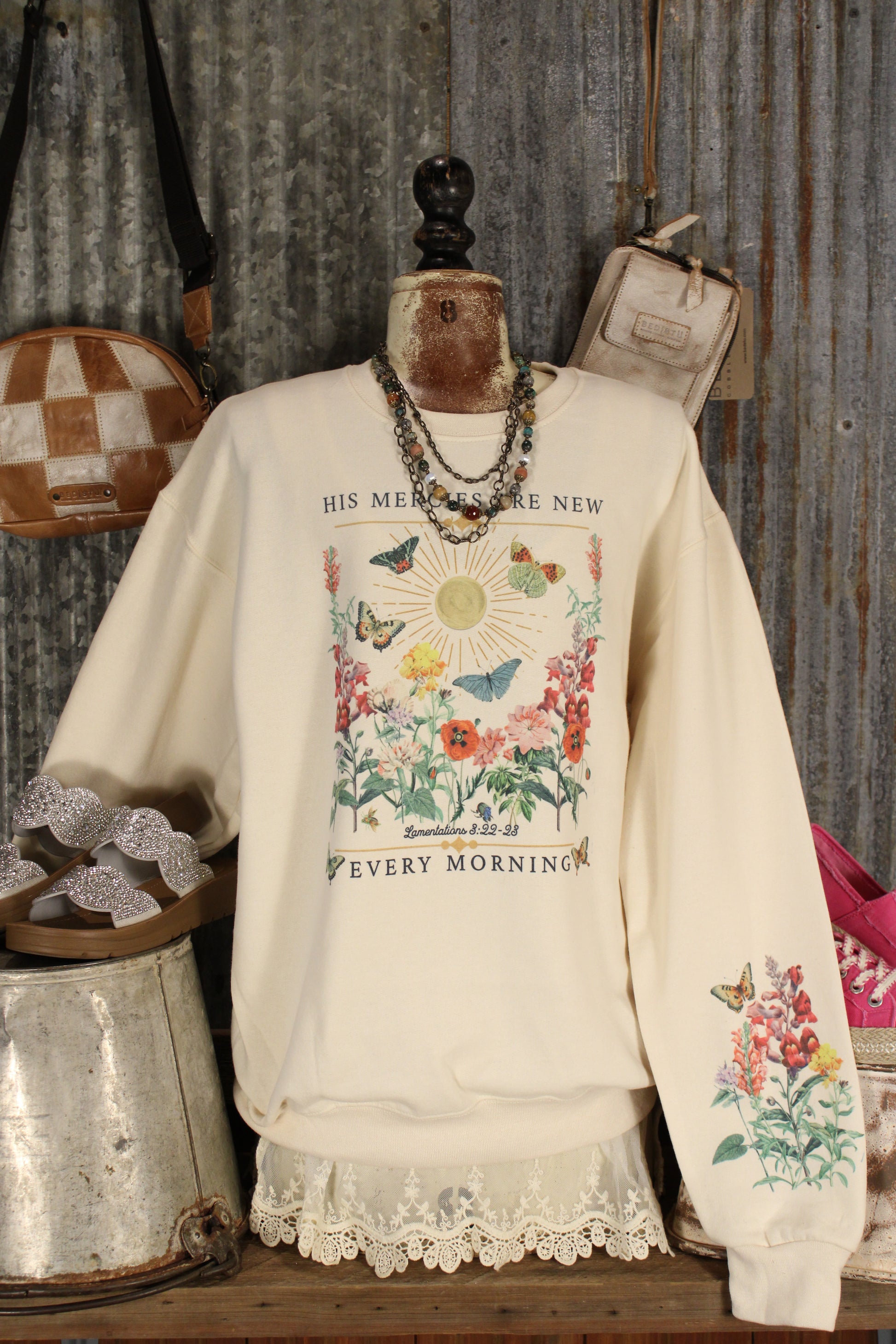 Introducing the FGO His Mercies Are New Sweatshirt, a perfect addition to your wardrobe! This cozy sweatshirt features a round neck and long sleeves, making it ideal for both casual days out and relaxing at home. Made right here in the USA, this sweatshirt boasts a true-to-size fit, ensuring it looks great on everyone. Crafted from a blend of cotton and polyester, it offers both comfort and durability. To keep it looking its best, simply hand wash cold. With its stylish prints and bohemian flair, this sweatshirt is a must-have for the upcoming seasons. Available in a range of colors including Ivory/Cream, Pink, Yellow, Orange, Red, Purple, and Green, there's a shade to suit every taste. Plus, with a nod to holidays like Mother's Day and Easter, it also makes a thoughtful gift for your loved ones. Don't miss out on the FGO His Mercies Are New Sweatshirt - get yours today and enjoy both style and comfort in one fabulous package!