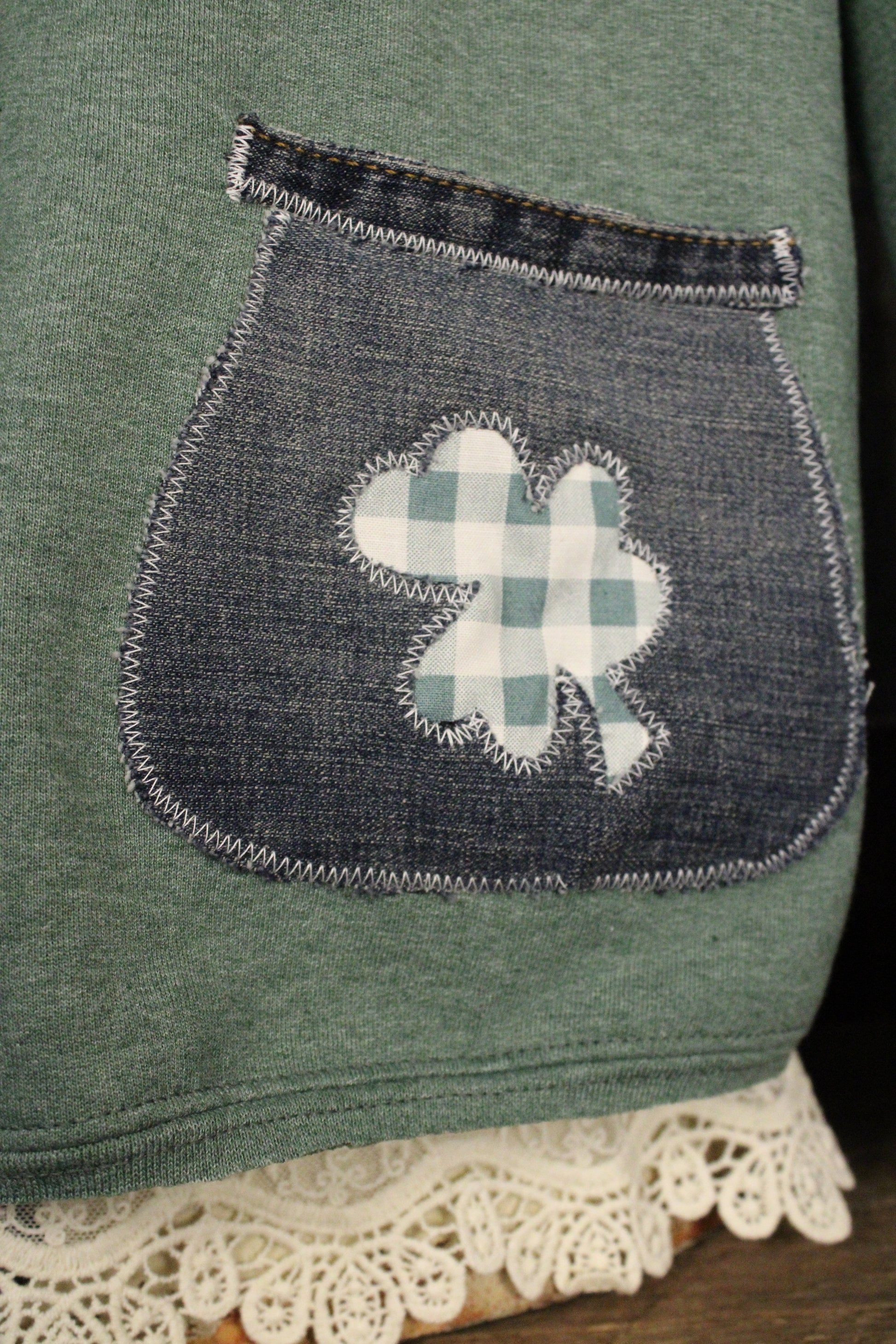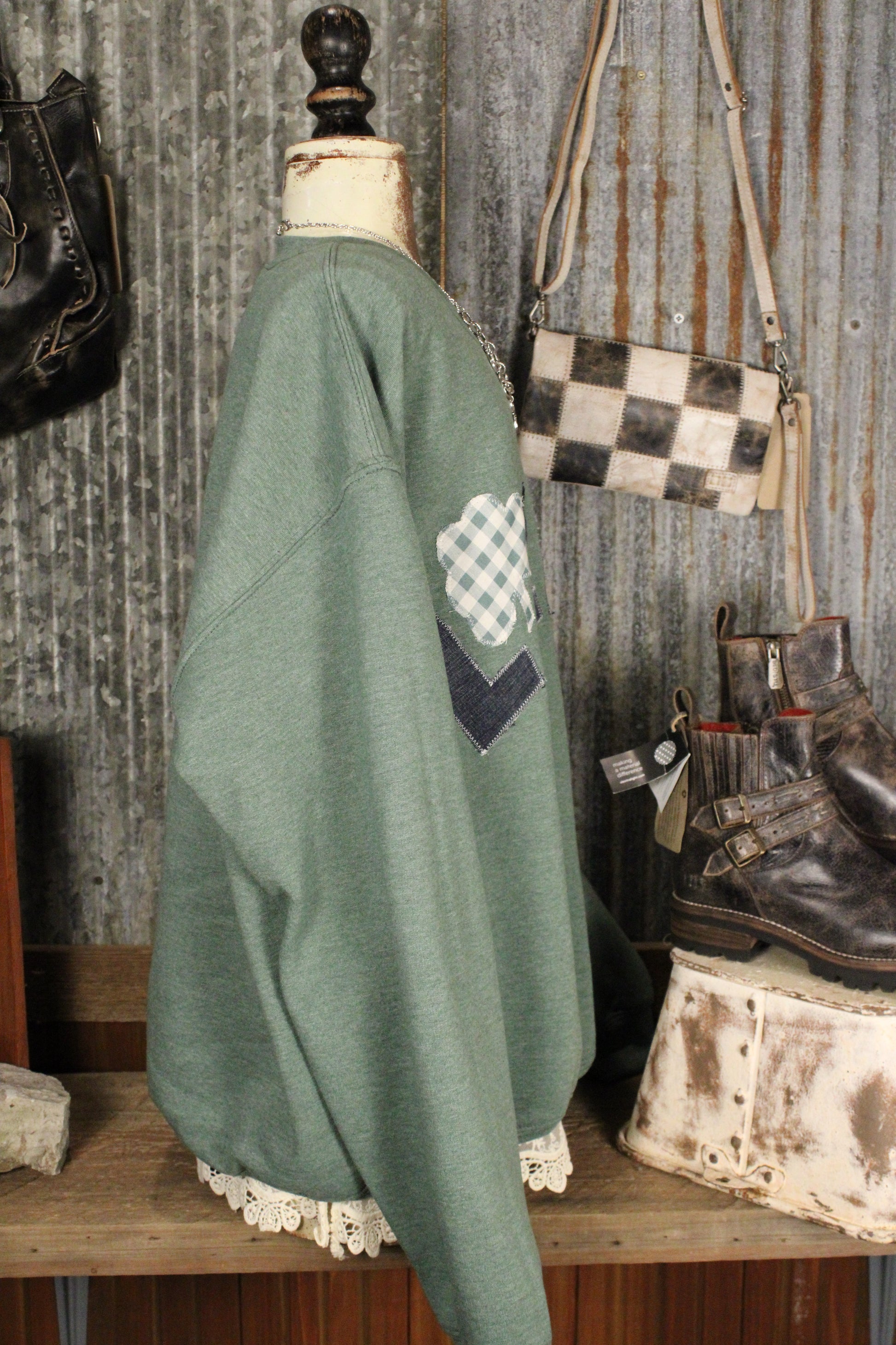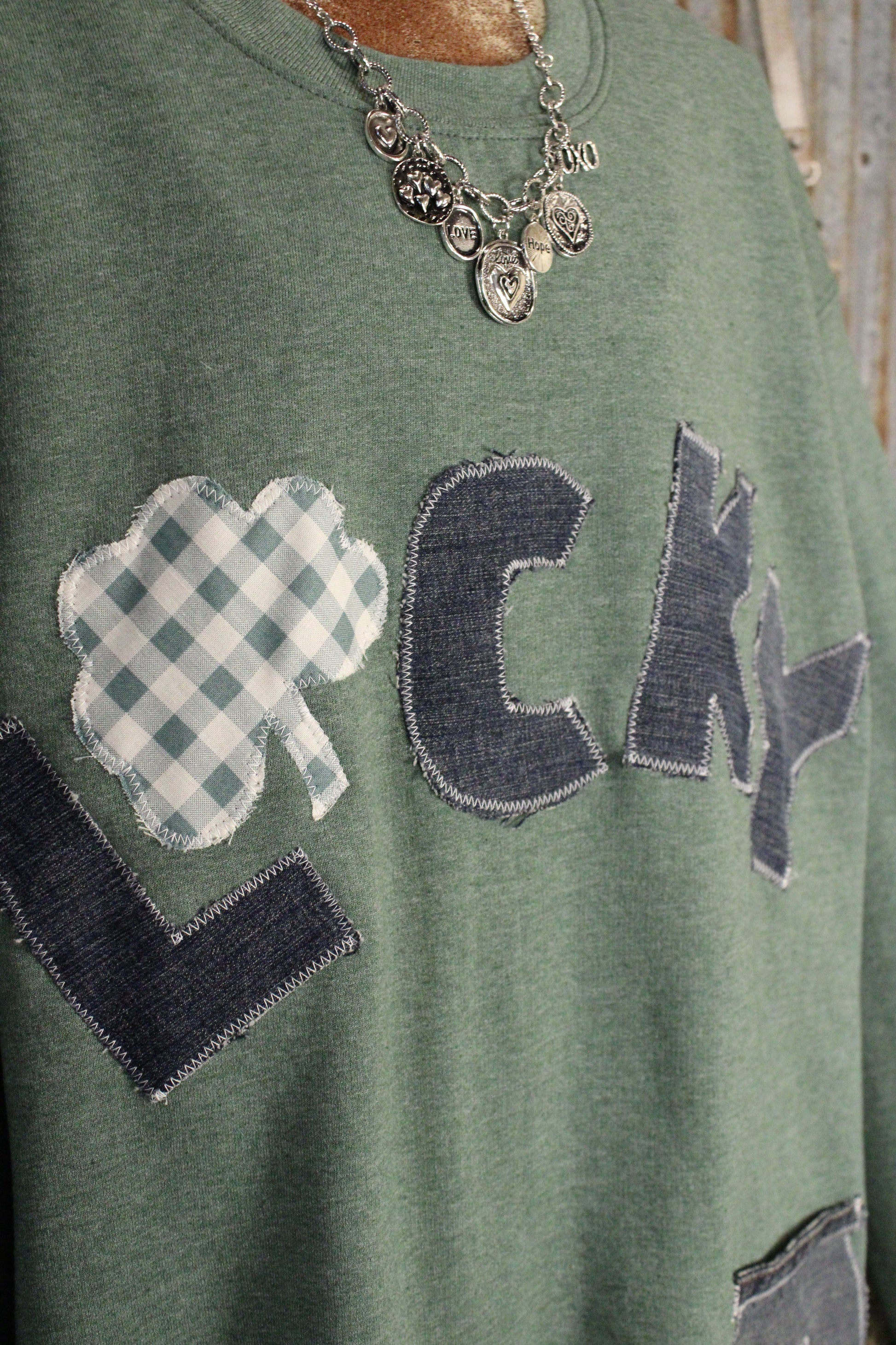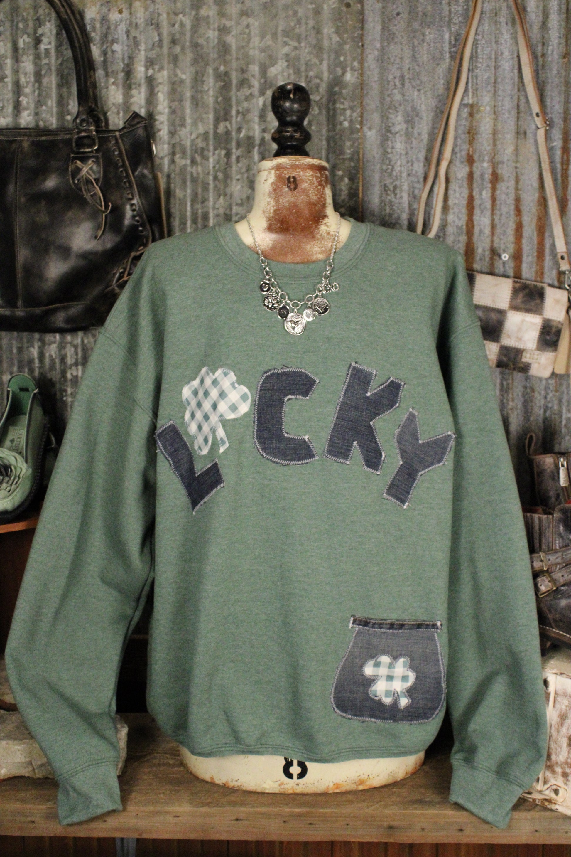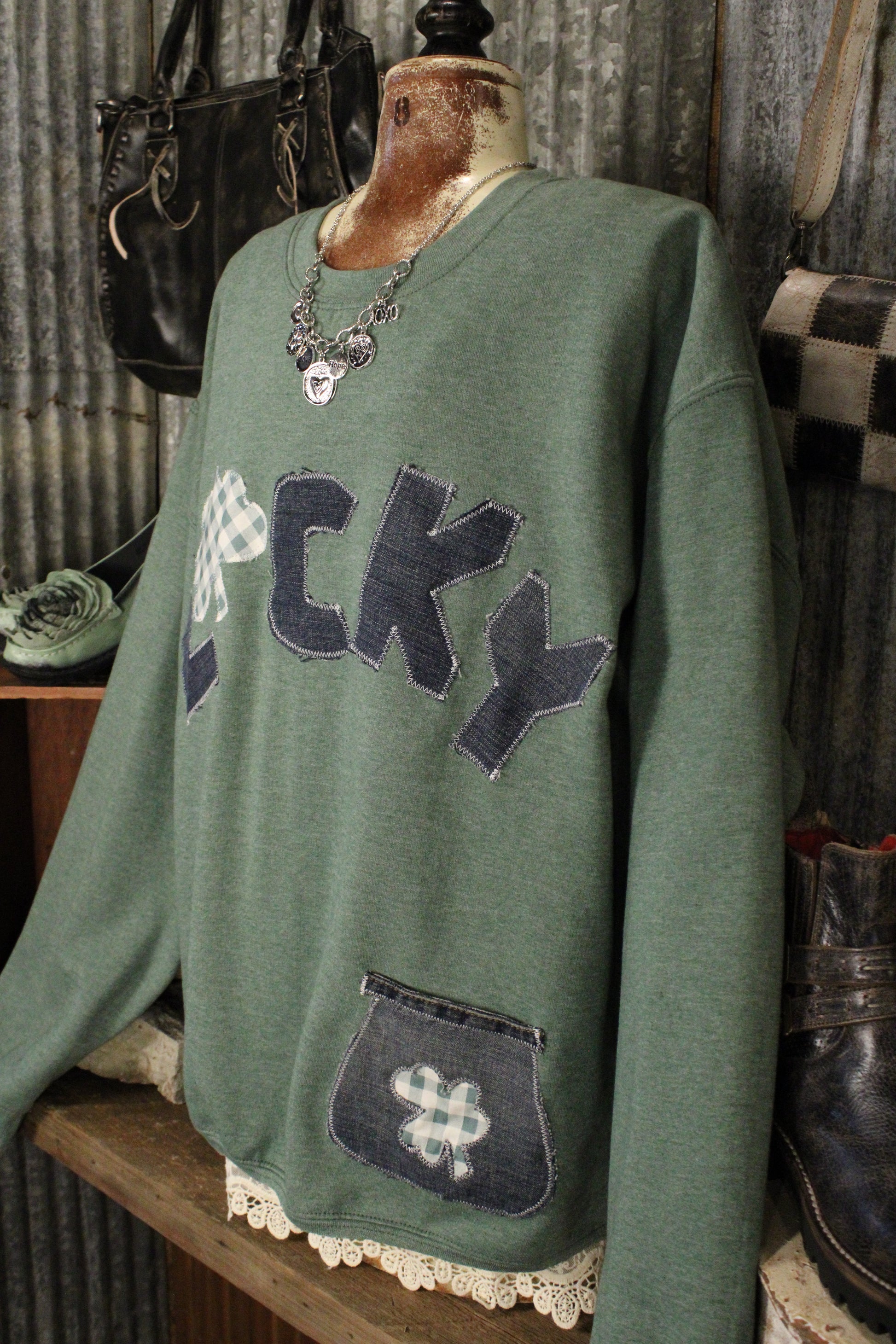 Get ready to cozy up in style with the FG Original Pocket Full of Luck Sweatshirt- This Farm Girls Original Sweatshirt is one of those pieces that just makes you smile. Handmade with care, it features a playful LUCKY appliqué with sweet shamrock details and a coordinating patch pocket for an extra touch of charm. The soft green base gives it that easy, everyday feel while still feeling special and one-of-a-kind.