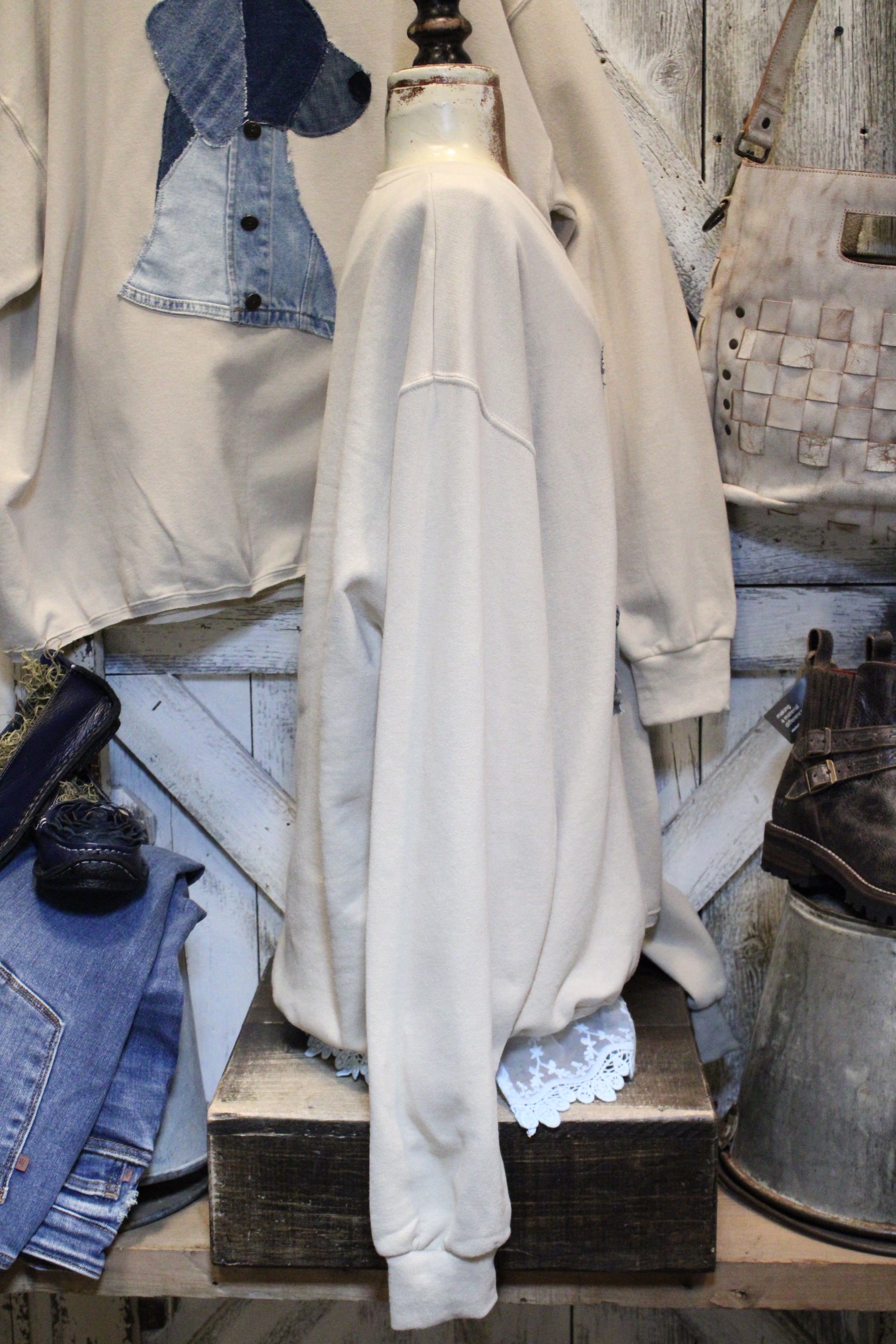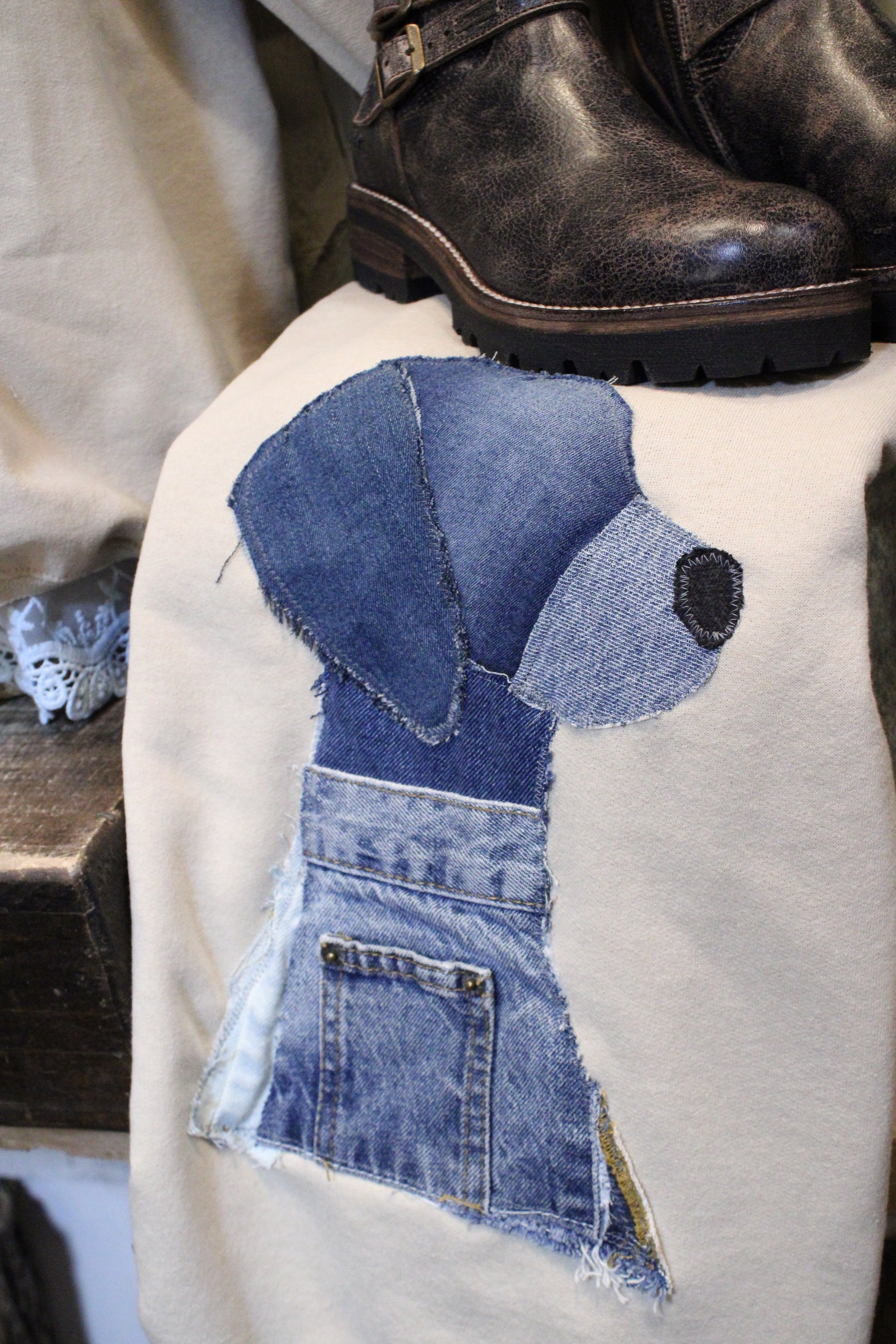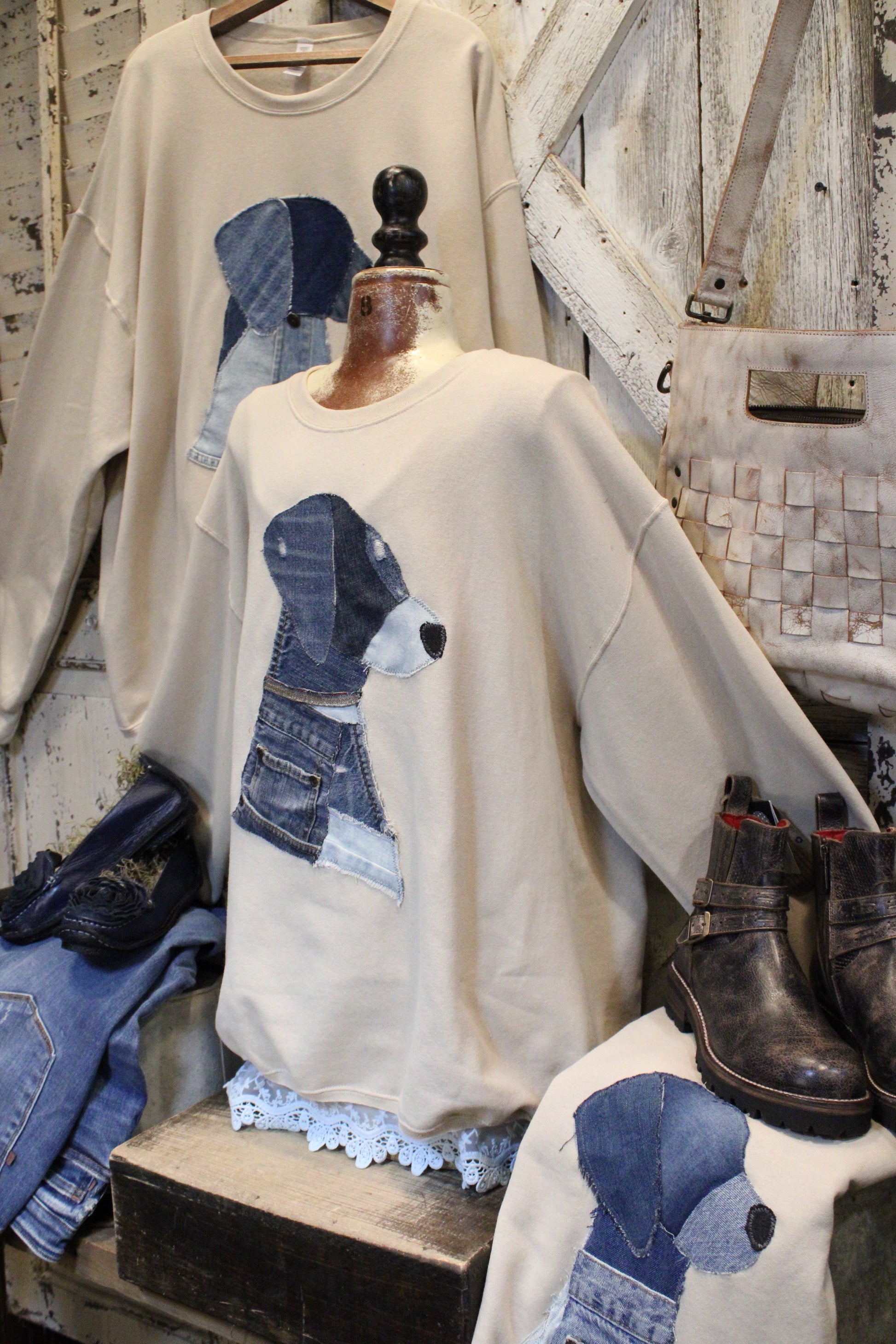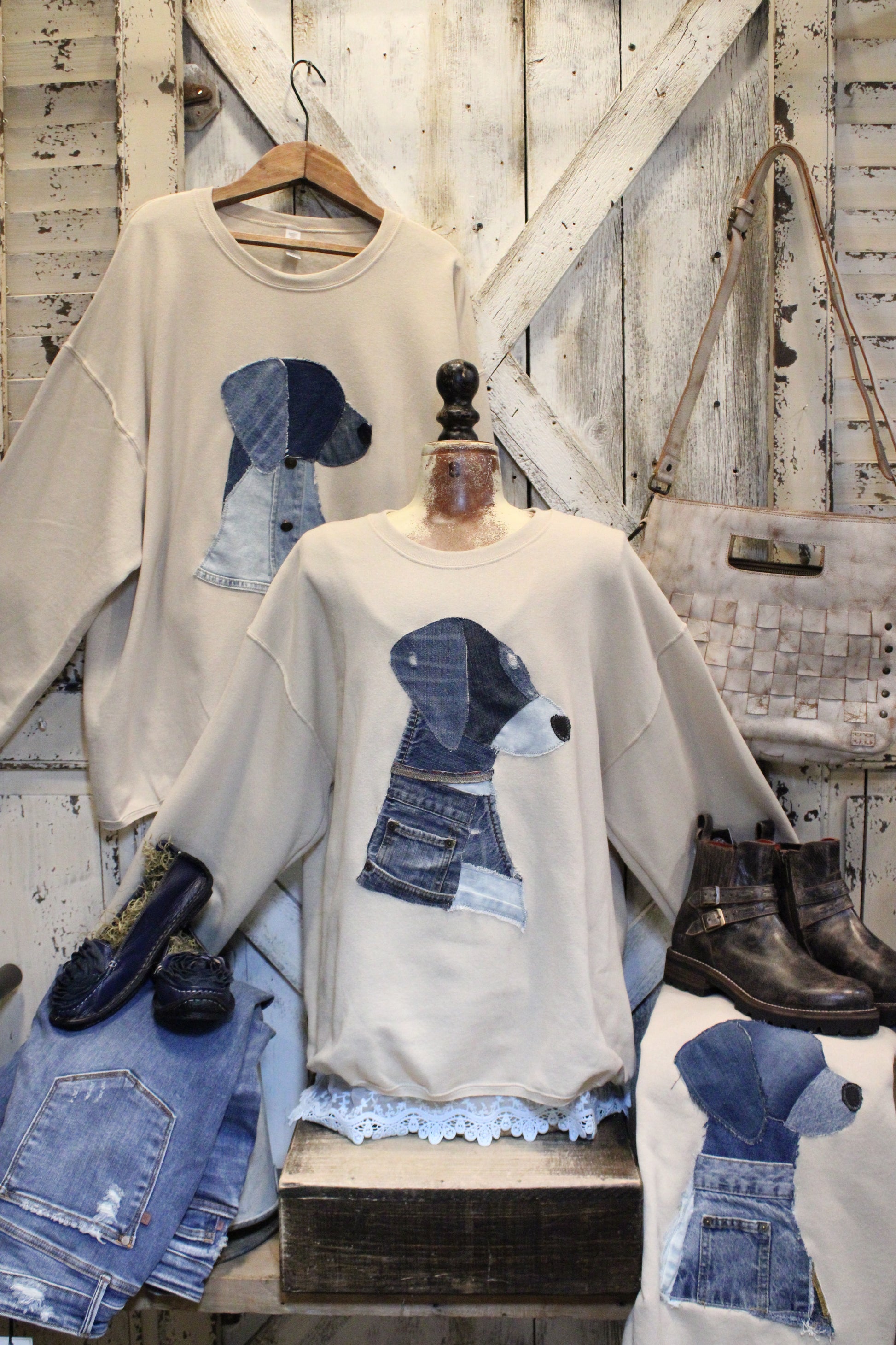 This cozy sweatshirt features an adorable denim dog appliqué, handcrafted from repurposed denim pieces for that one-of-a-kind look we just can’t get enough of. Each pup is slightly unique — just like your favorite four-legged friend!