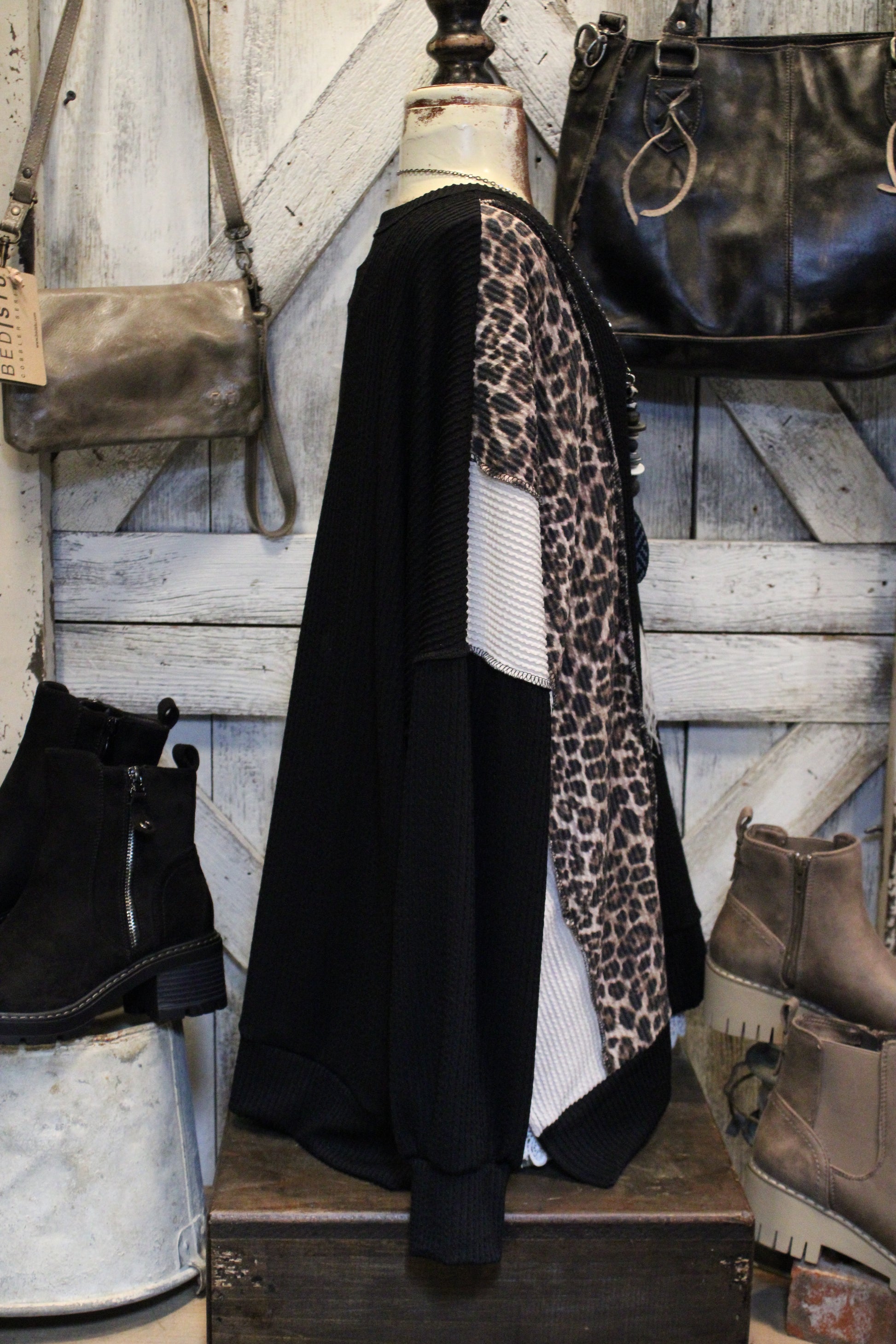 Introducing our Fiercely Ribbed Black Top- This fierce yet cozy piece brings together all your favorite things — soft waffle-knit comfort, bold leopard print panels, and the perfect pop of contrast in classic black and cream.