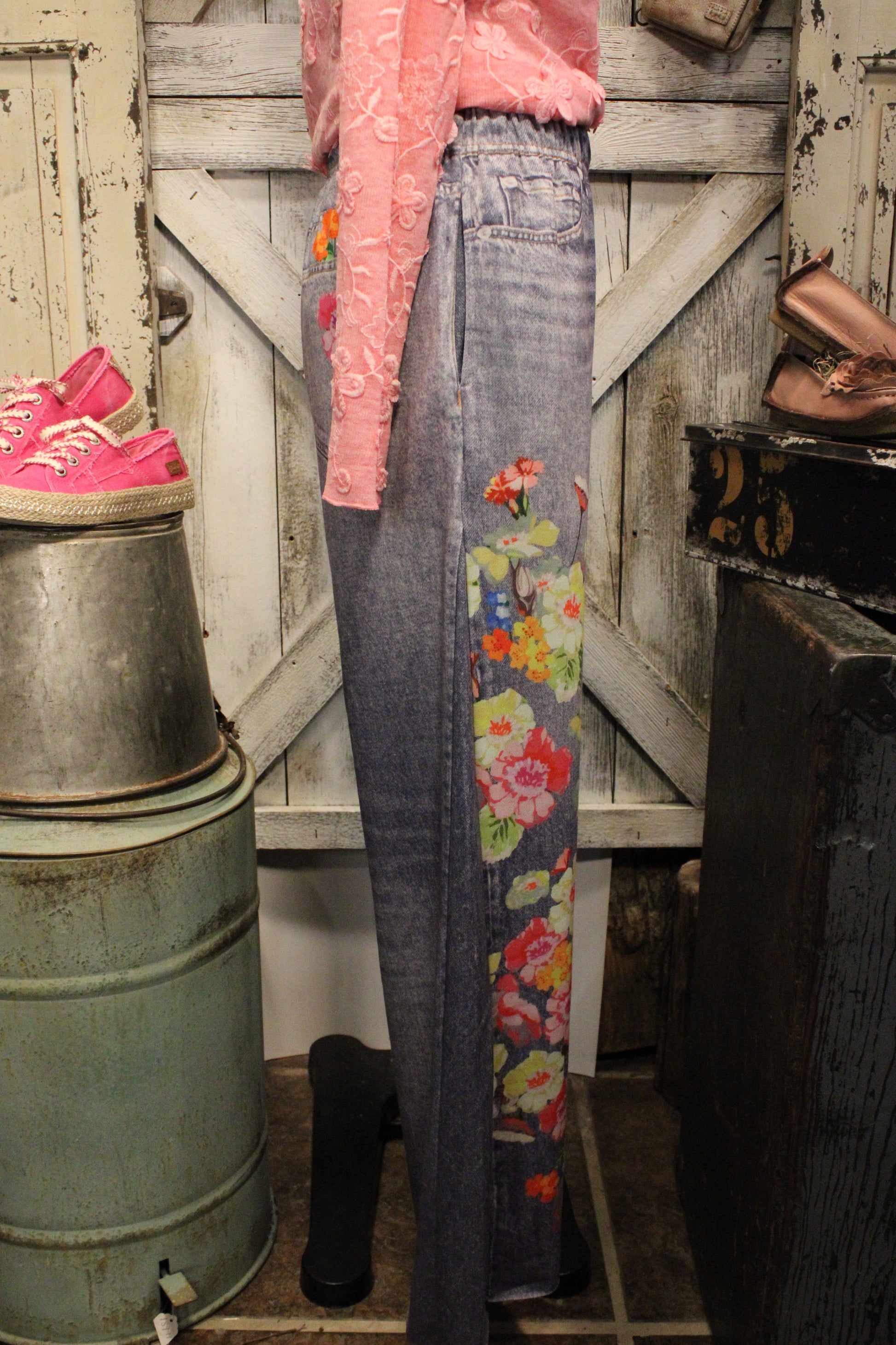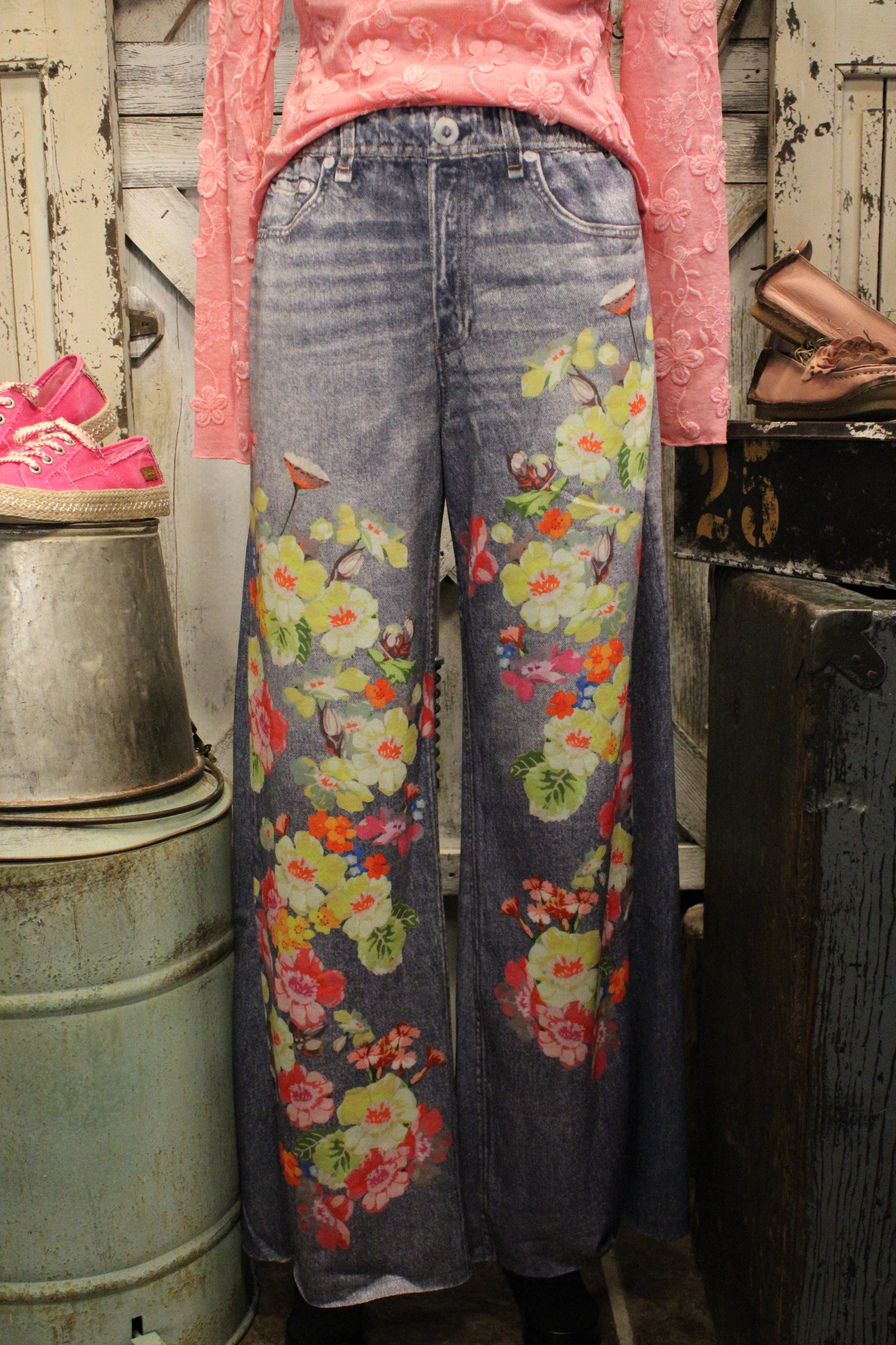 Welcome to the floral paradise with our Floral Fantasy Wide Leg Faux Denim Pants- These floral wide-leg pants are a true statement piece, blending an easy denim look with beautiful pops of color. Designed with a relaxed, flowy silhouette, they feature vibrant floral detailing that brings a fresh, artistic feel to a classic jean-inspired style.