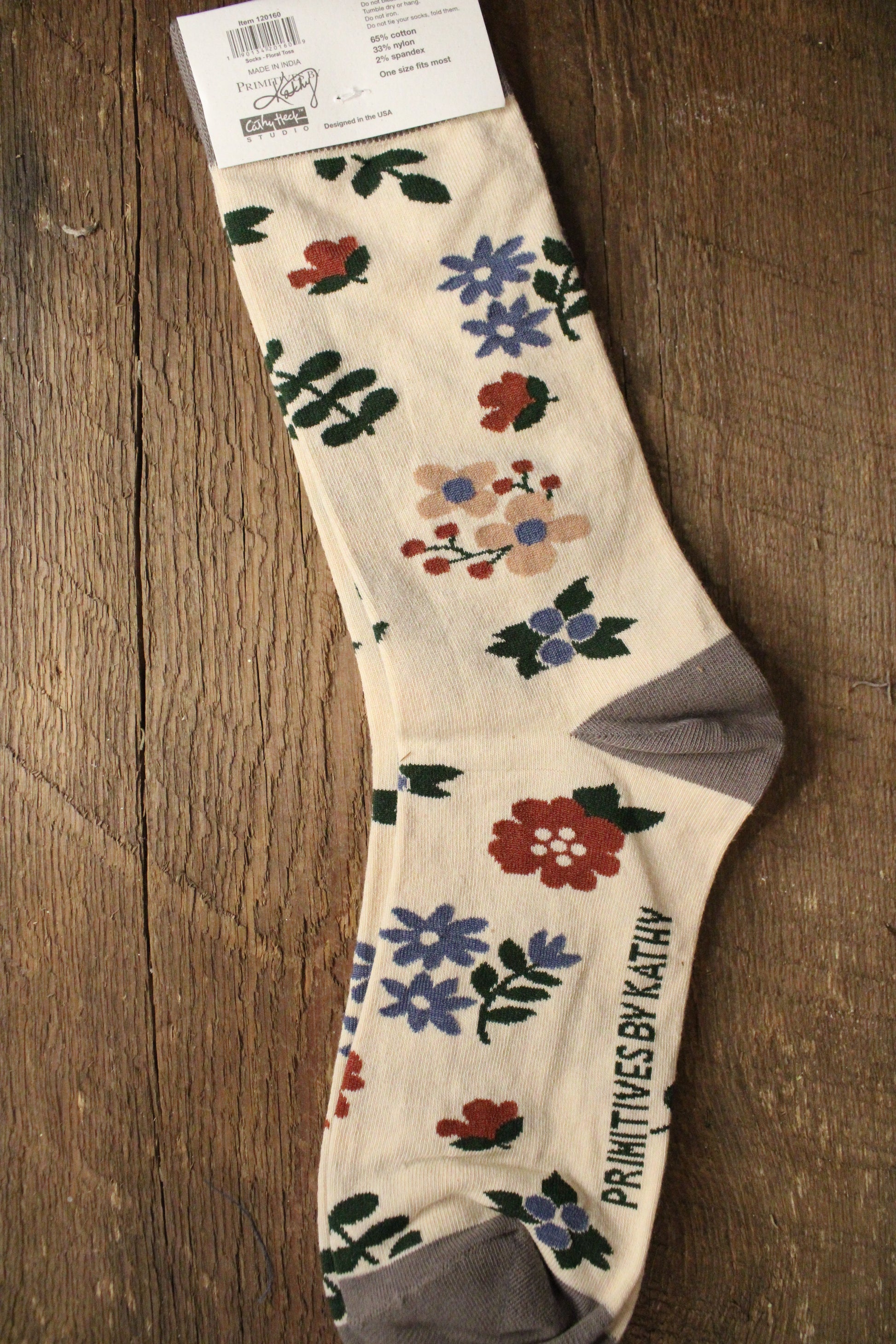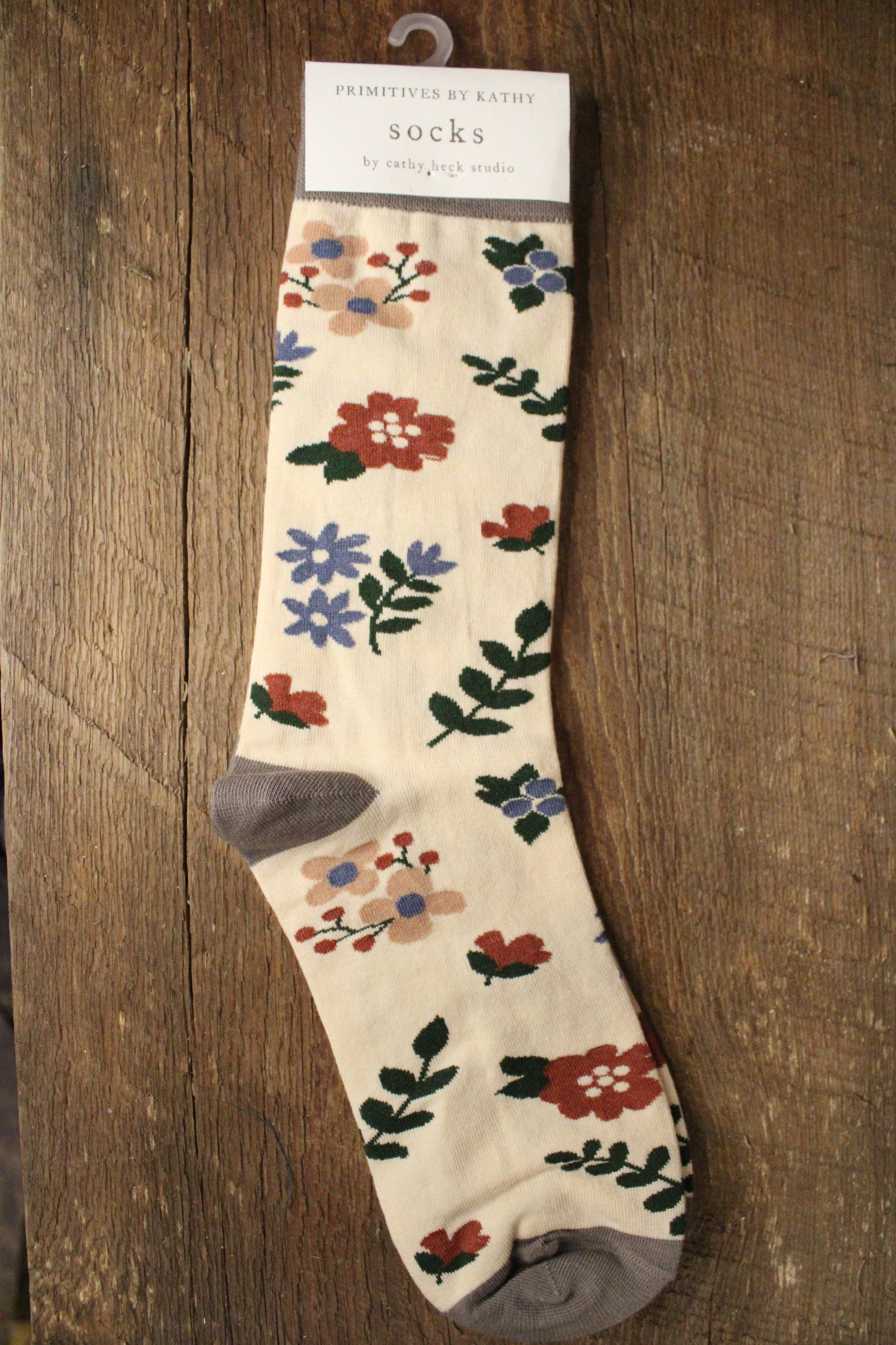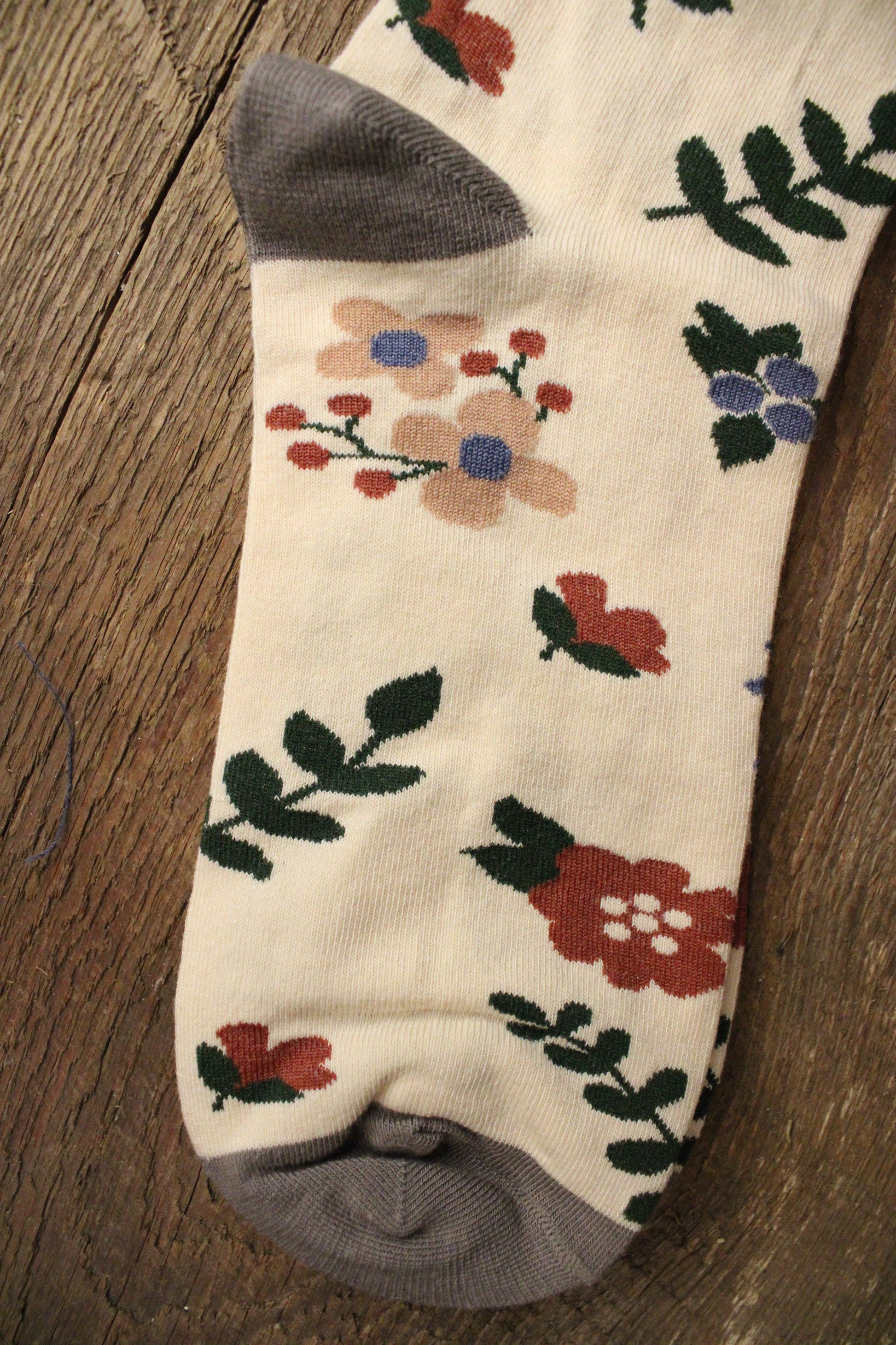 Introducing our Floral Toss Socks, These cream-colored cuties are sprinkled with vintage-inspired floral prints in warm hues of rust, sage, and soft blue—like a garden stroll for your feet.