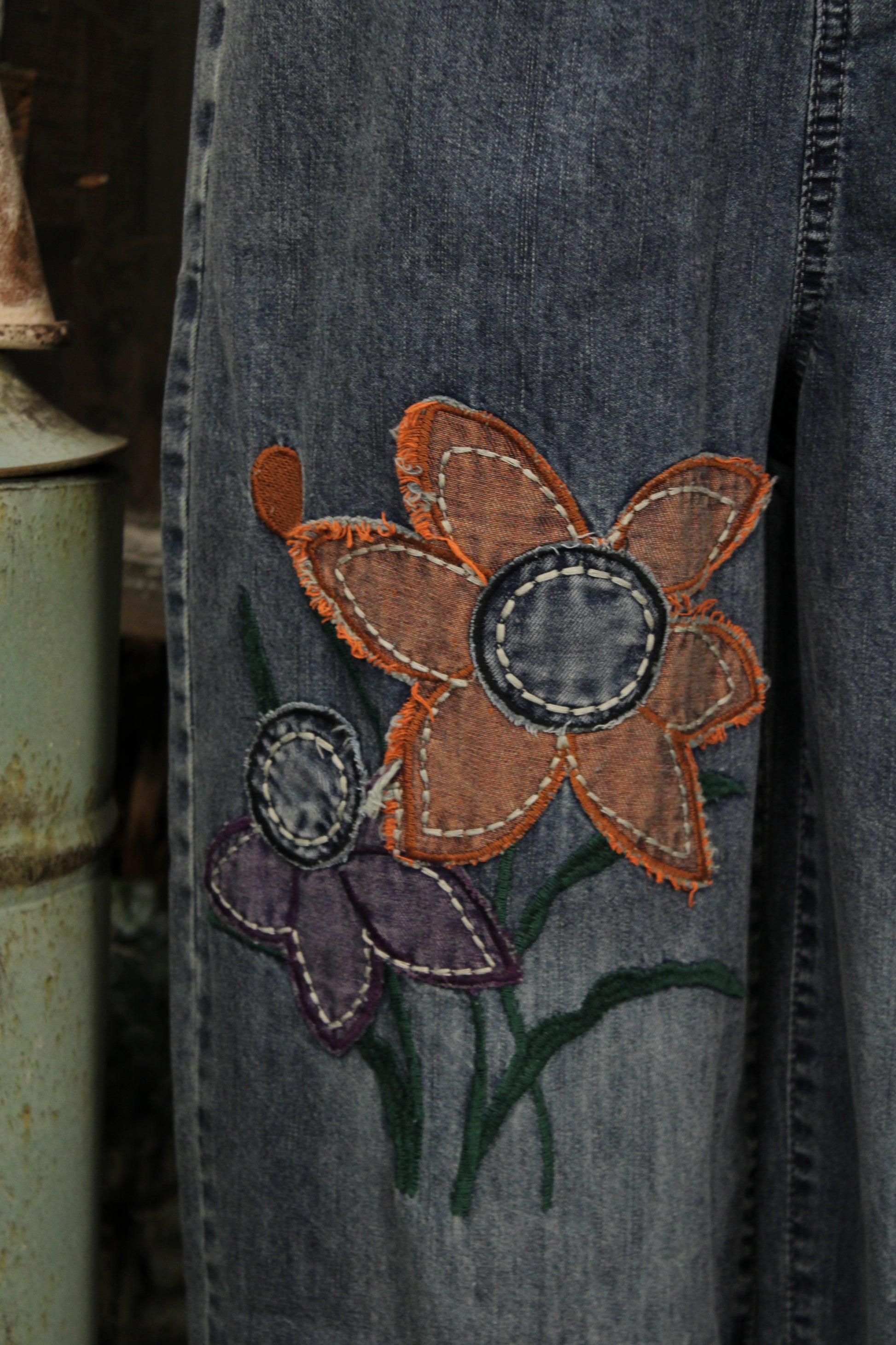 Introducing our Flower Patch Jeans -These relaxed denim patchwork pants bring playful farmhouse charm to everyday style. Designed with a soft elastic waistband and an easy, wide-leg silhouette, they feature mixed-wash denim with a standout floral appliqué and utility pocket detail that adds just the right amount of personality. The lightweight feel and cropped length make them perfect for year-round layering with tees, tanks, and cozy sweaters. A fun statement piece that still feels effortless, these denim pants are made for days when you want comfort and character in one outfit.