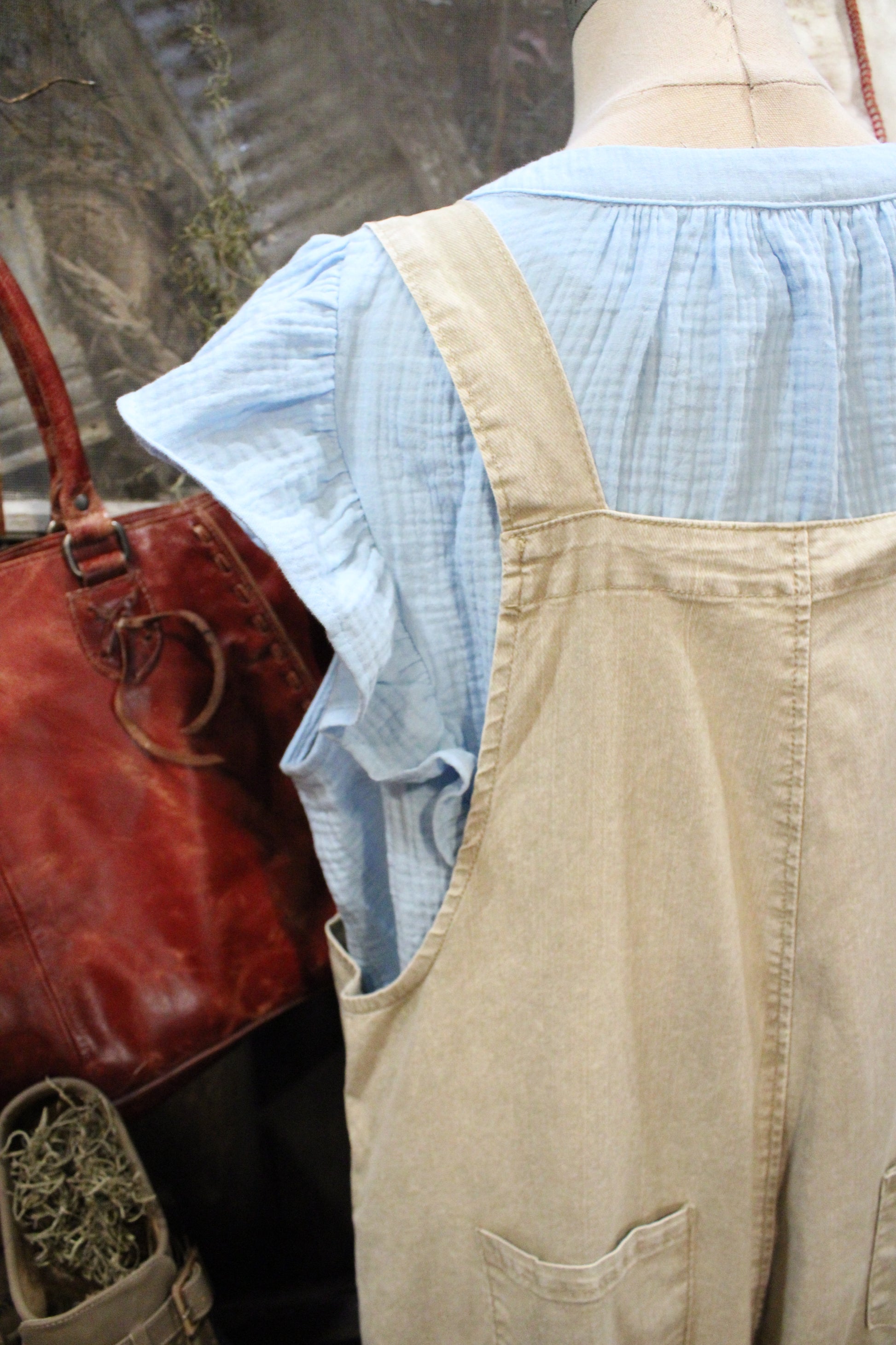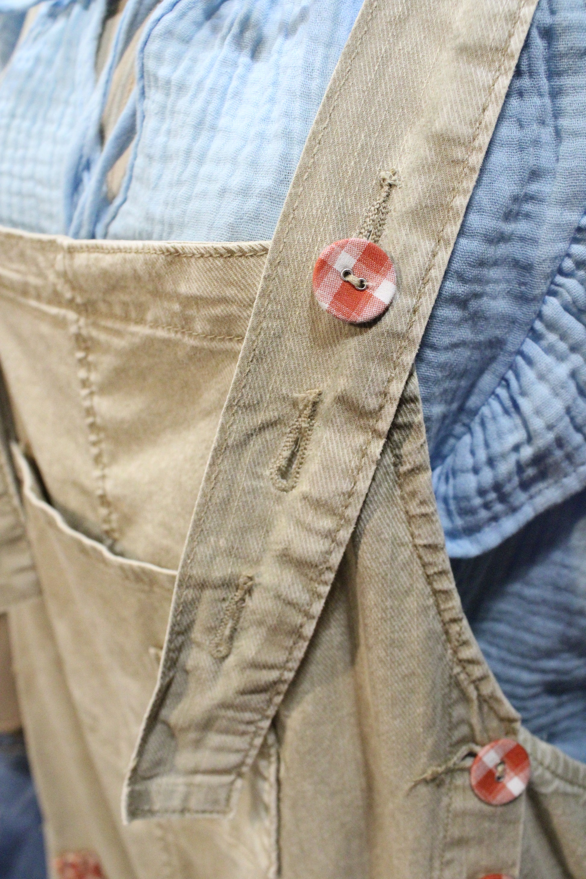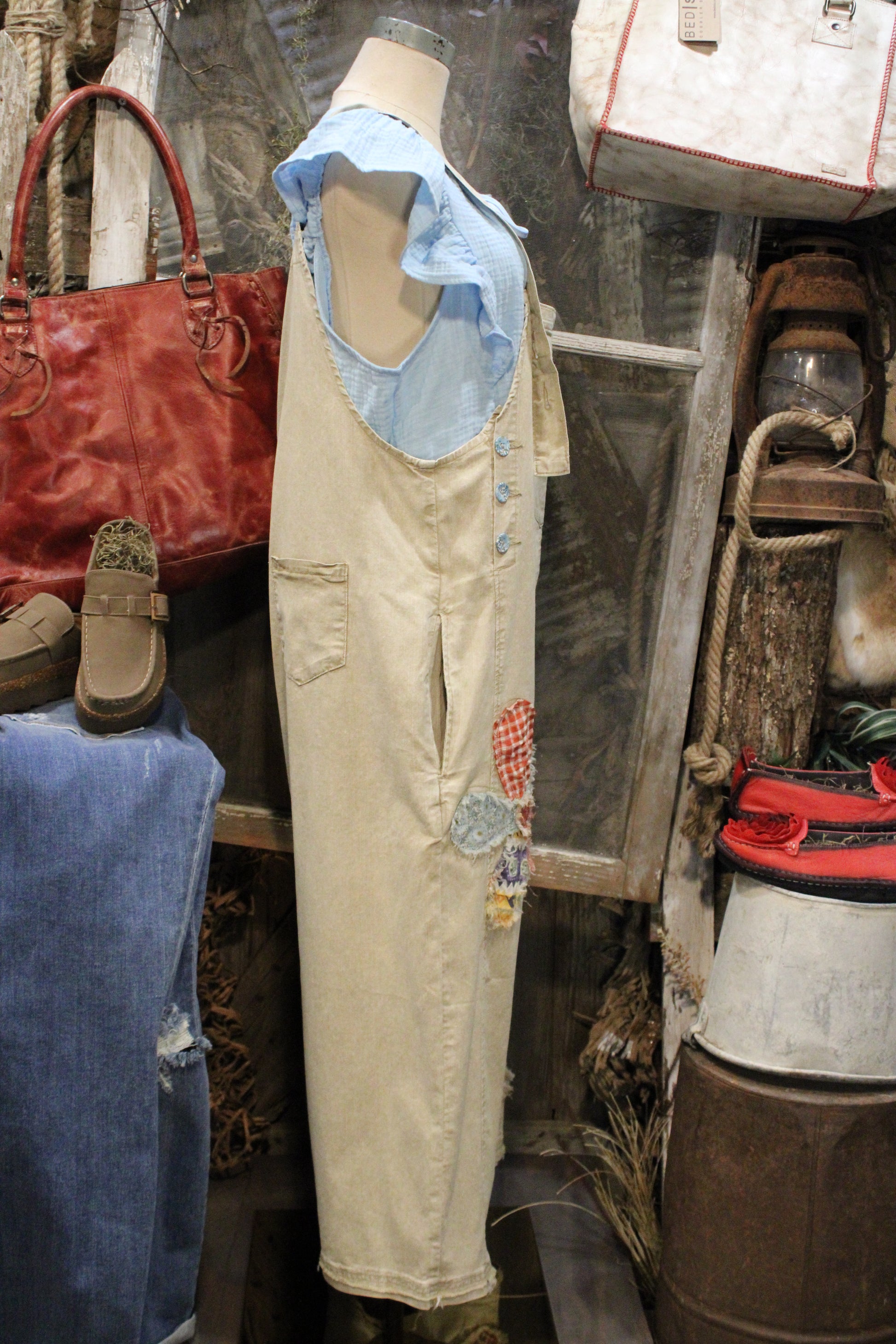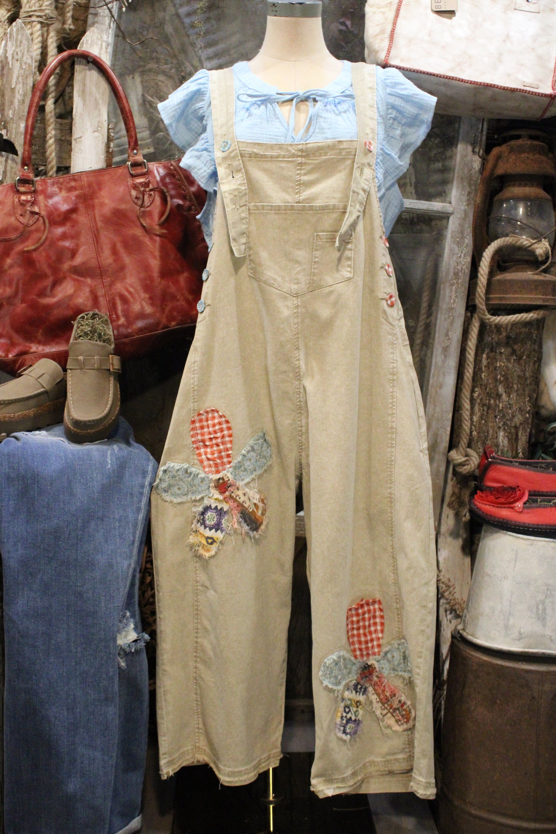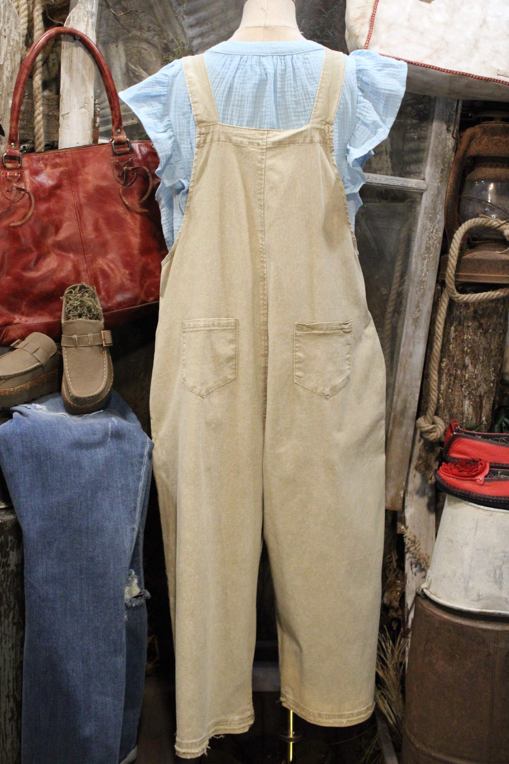 Welcome the Flower Patch Khaki Overalls - a playful nod to vintage farmhouse charm with a modern boho twist. These roomy overalls are made for slow mornings, weekend markets, and dancing barefoot in the grass.