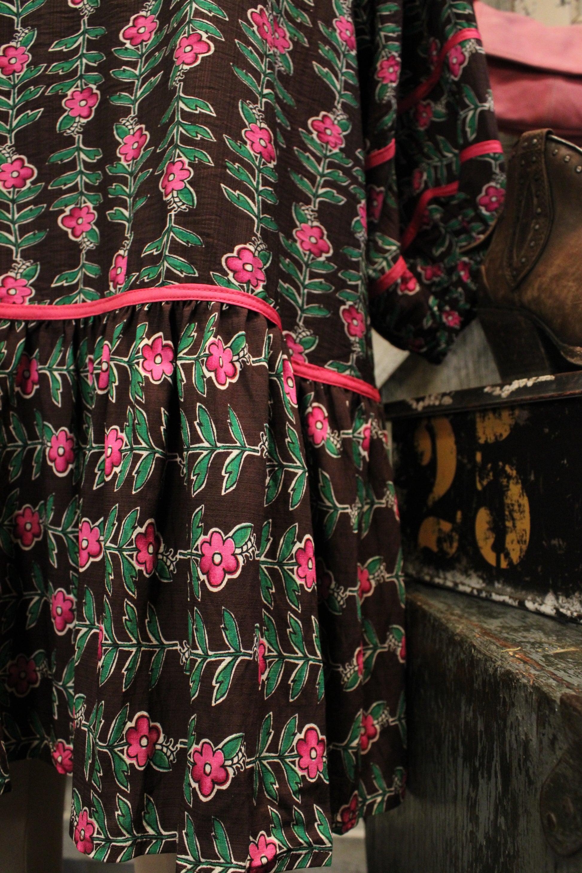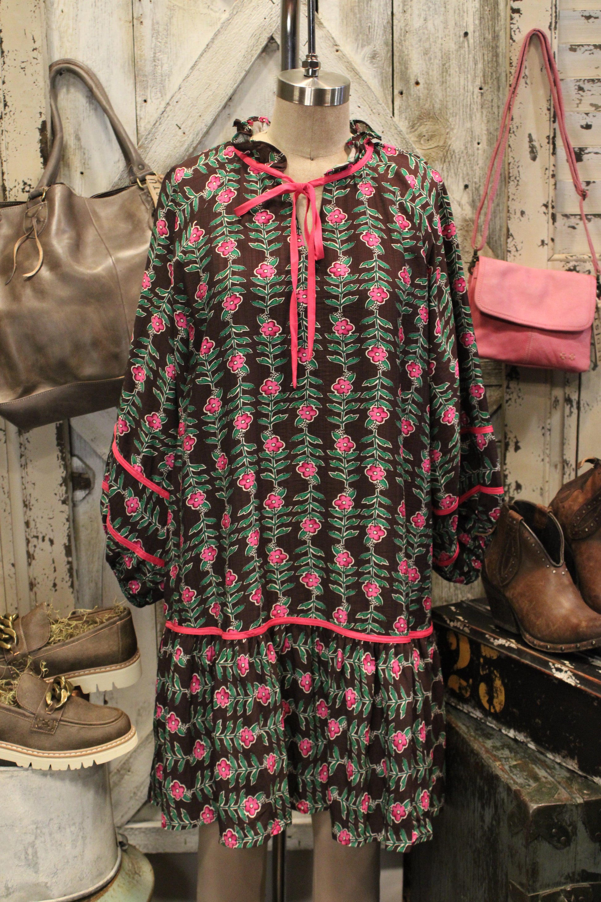Introducing the Forever in Bloom Dress- This dress is playful, bold, and made to stand out. Featuring a rich chocolate-brown base covered in vibrant pink florals and leafy green vines, it brings all the charm of a blooming garden into your wardrobe. The tiered skirt and flowy fit keep it comfortable and easy to wear, while the ruffled neckline with tie detail adds a sweet, feminine touch. Puff sleeves trimmed in pink piping give it just the right amount of farm-girly flair.