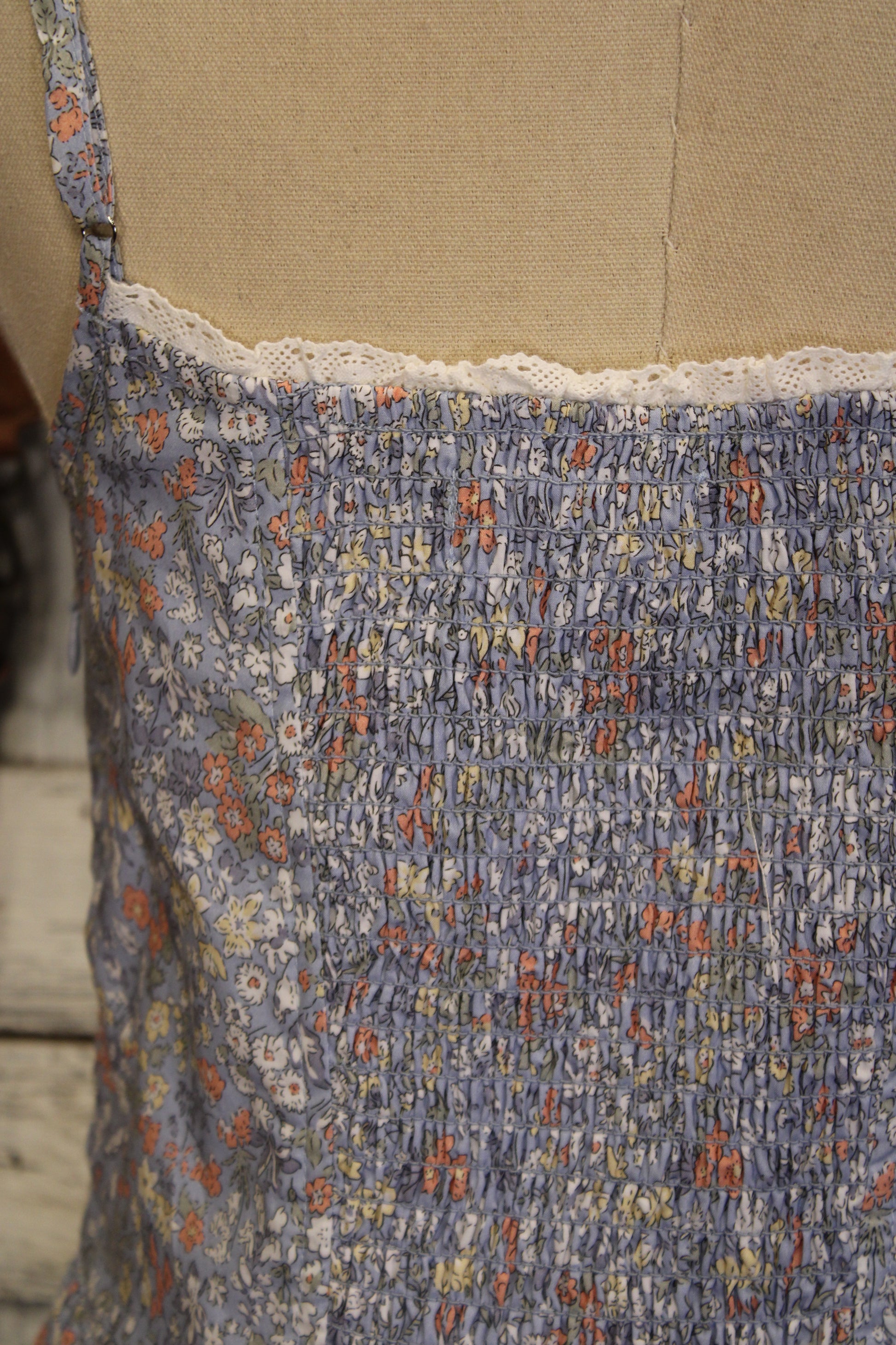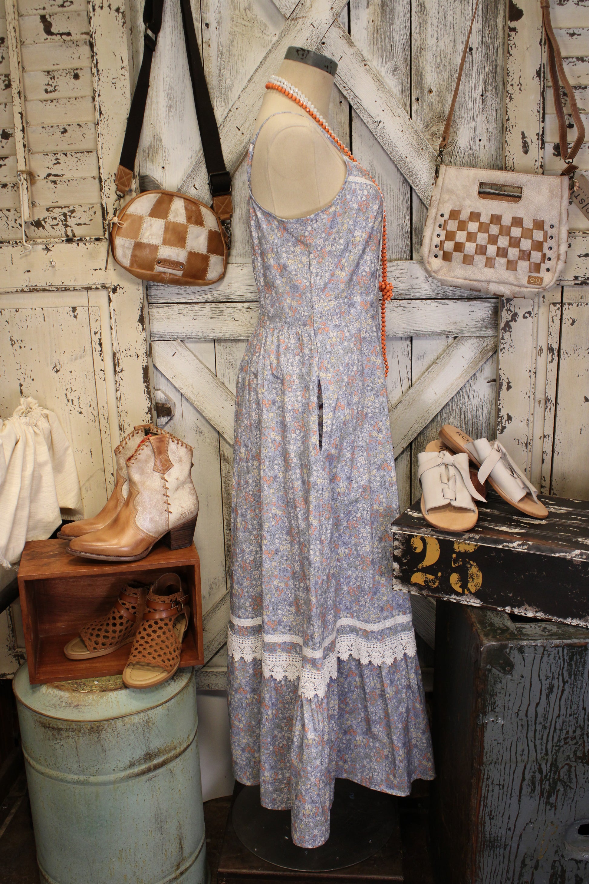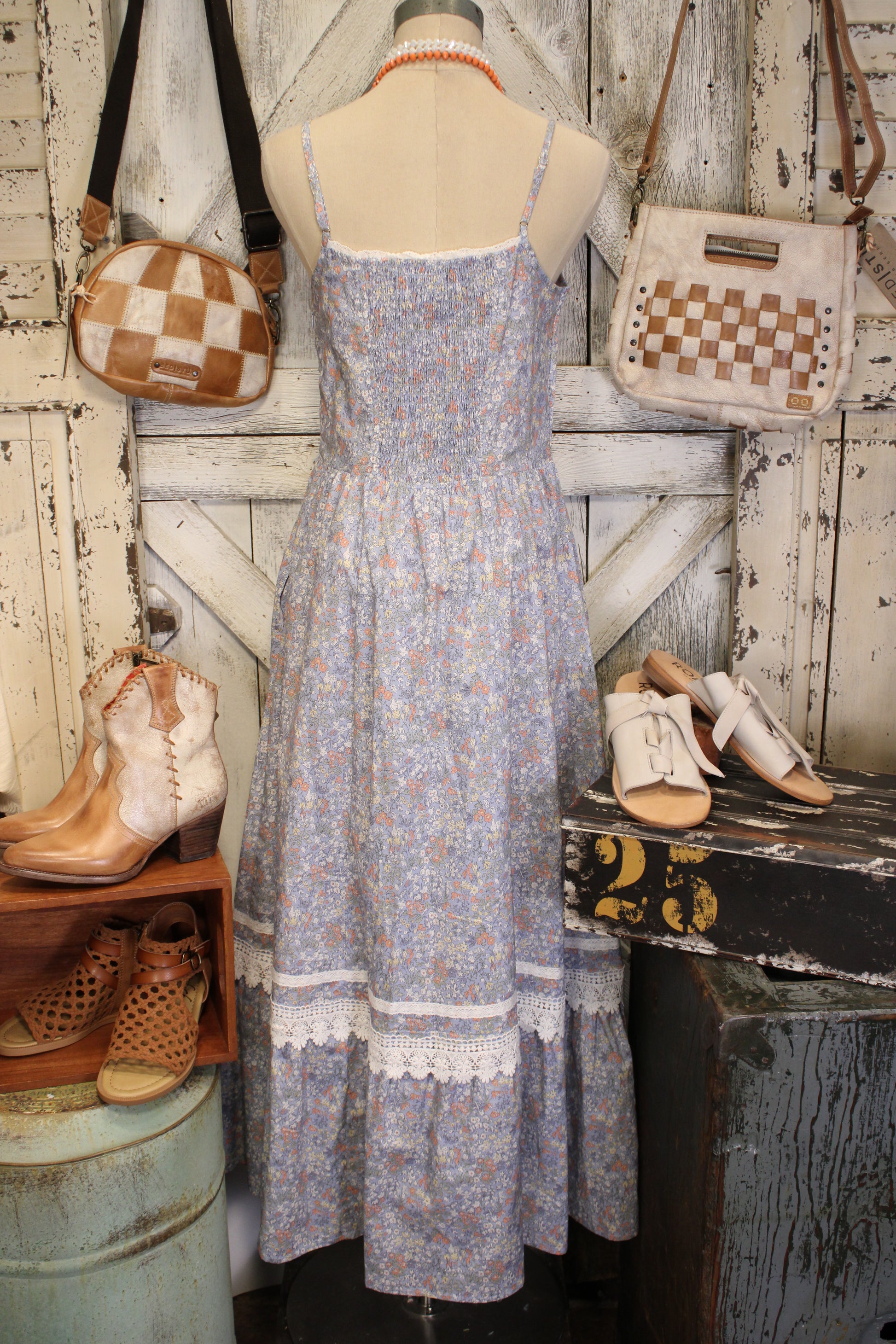 Introducing our charming Forget Me Not Lace Dress- This soft floral maxi dress is a dreamy blend of vintage charm and easy everyday comfort. Designed in a delicate blue floral print, it features a fitted bodice with button detail, adjustable straps, and a flowy skirt trimmed with pretty lace for an extra feminine touch. The flattering silhouette moves beautifully and even has pockets for added practicality. Light, graceful, and effortless to style, this dress is perfect for sunny days, weekend outings, and everything in between.