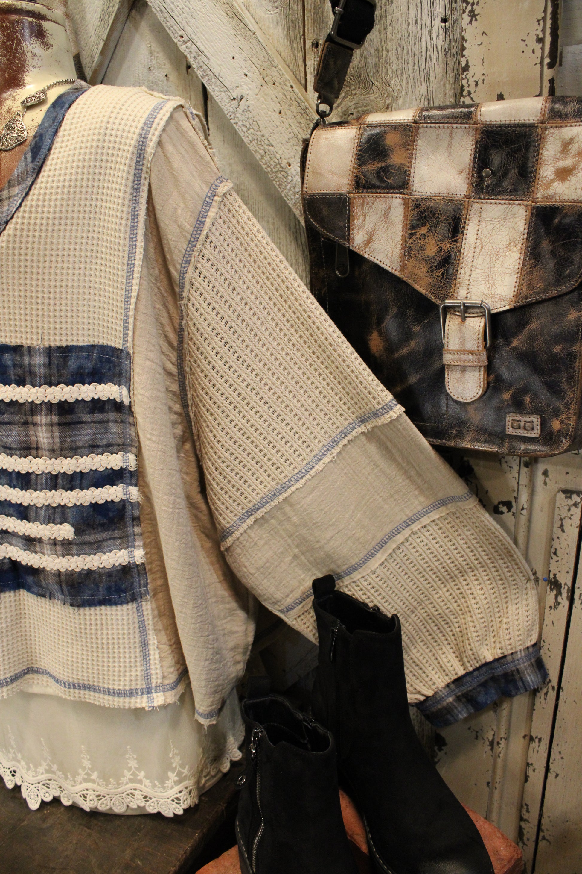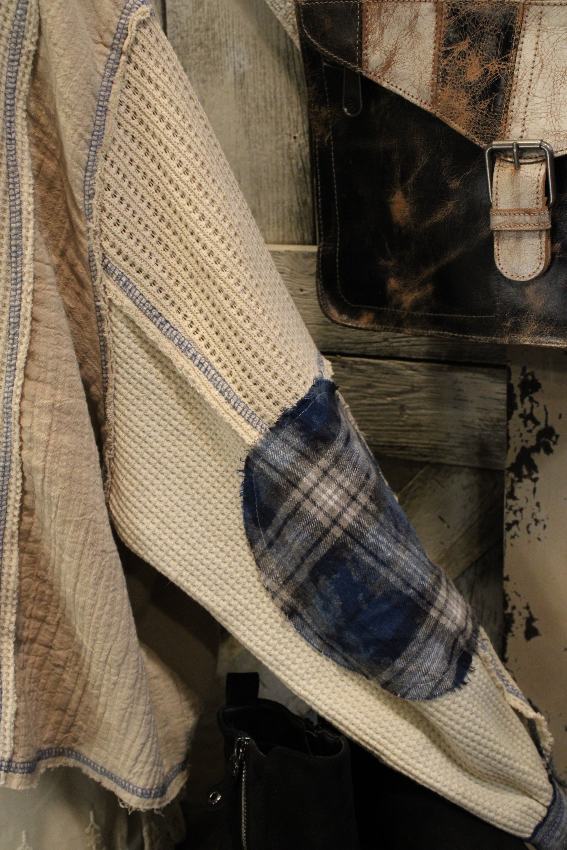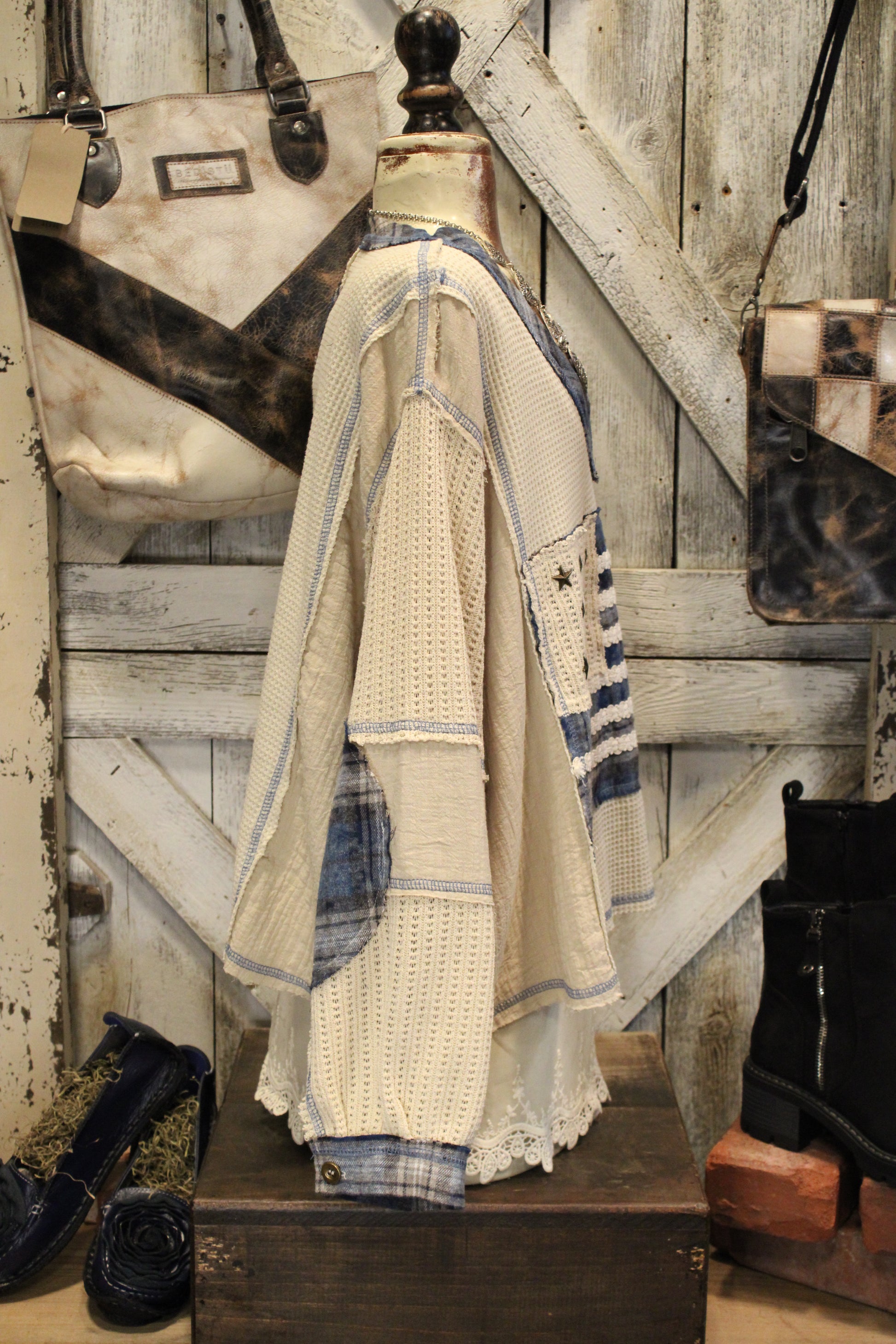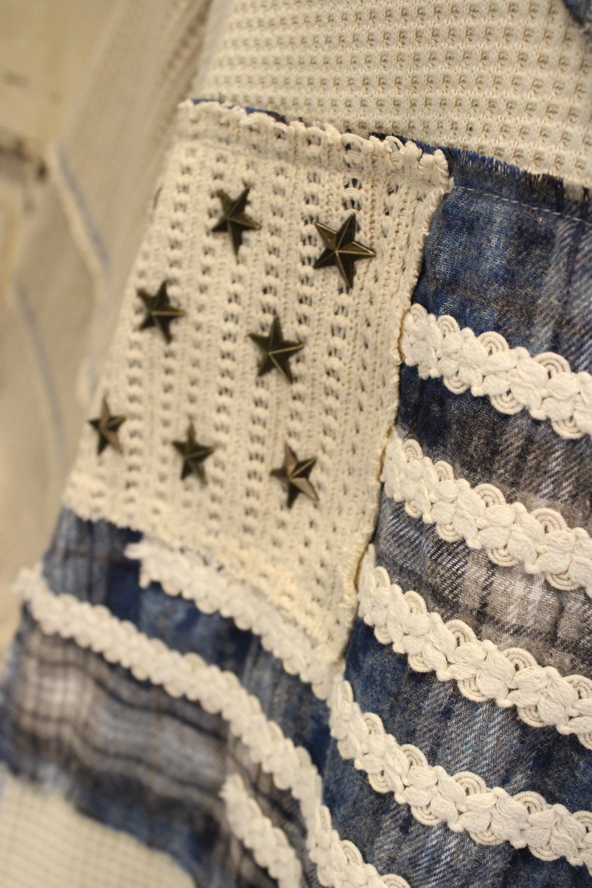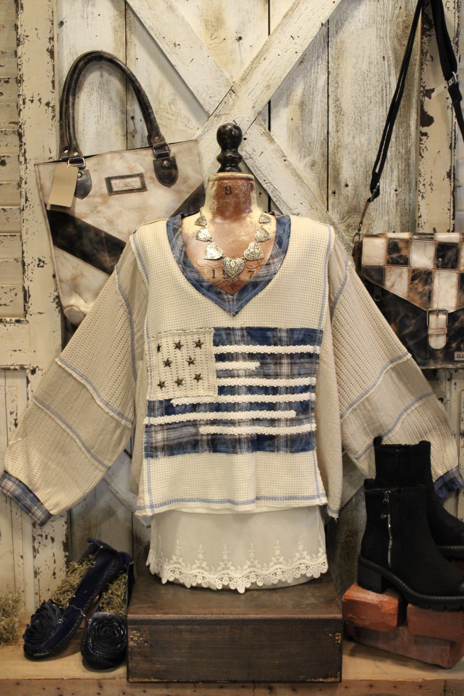 Introducing the ultra-cozy Free to be Comfy Sweater- Show off your laid-back, free-spirited style with this patchwork flag casual top. Featuring a mix of textured fabrics, raw-edge details, and a distressed patchwork American flag design, this piece blends cozy comfort with a vintage, all-American vibe. The relaxed fit and wide sleeves make it an easy throw-on for cooler days, while the unique handcrafted look ensures you’ll stand out from the crowd.