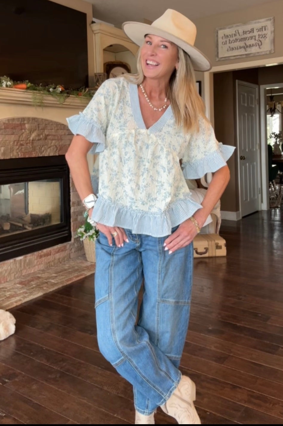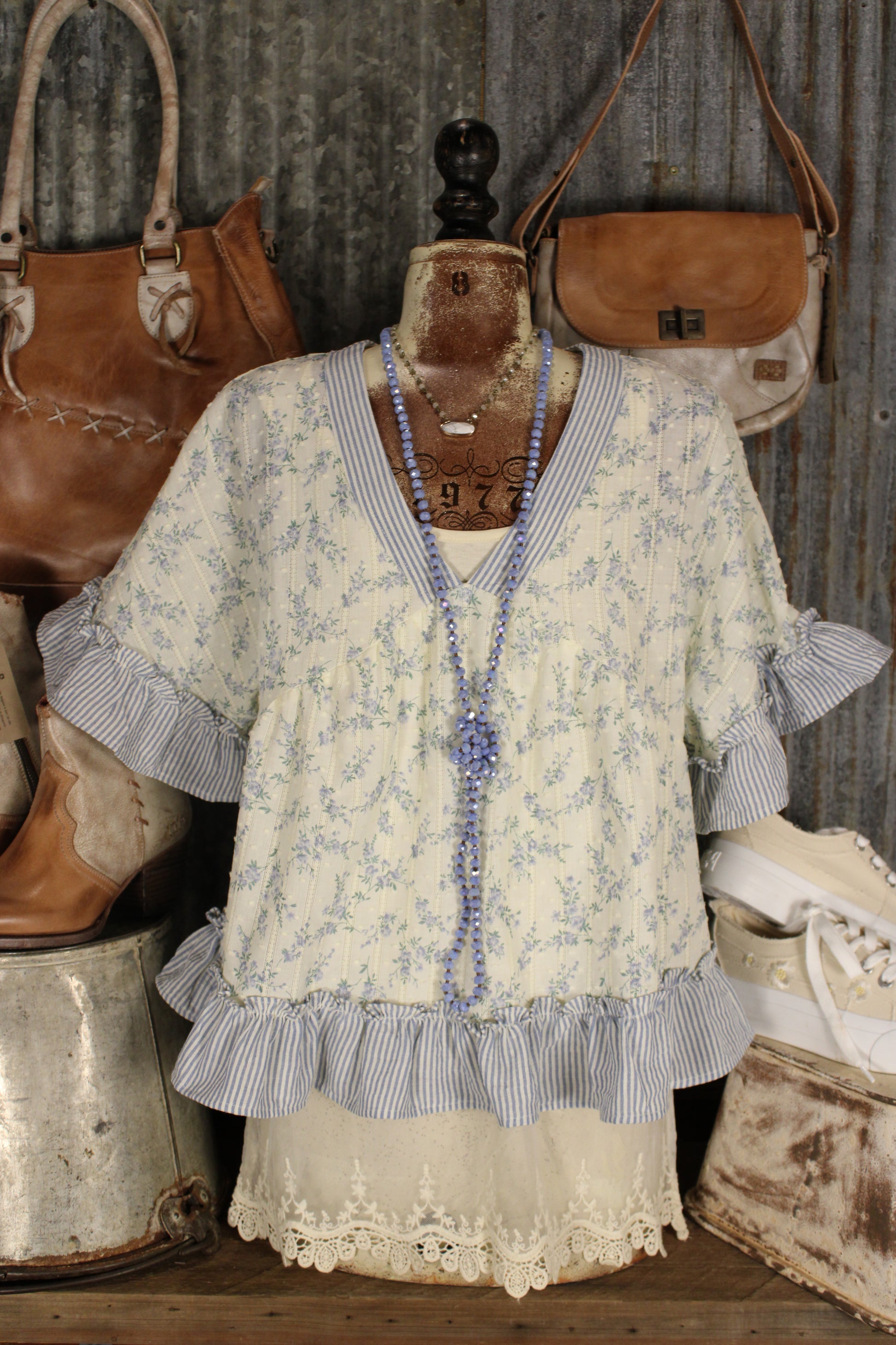 Introducing our French Meadow Periwinkle Ruffle Blouse, This sweet floral top is full of easy, farm-girl charm. Designed with a soft V-neckline trimmed in subtle stripe detailing, it features a delicate allover floral print that feels light, feminine, and timeless. The short sleeves are finished with ruffled striped cuffs, adding just the right touch of texture and detail.
