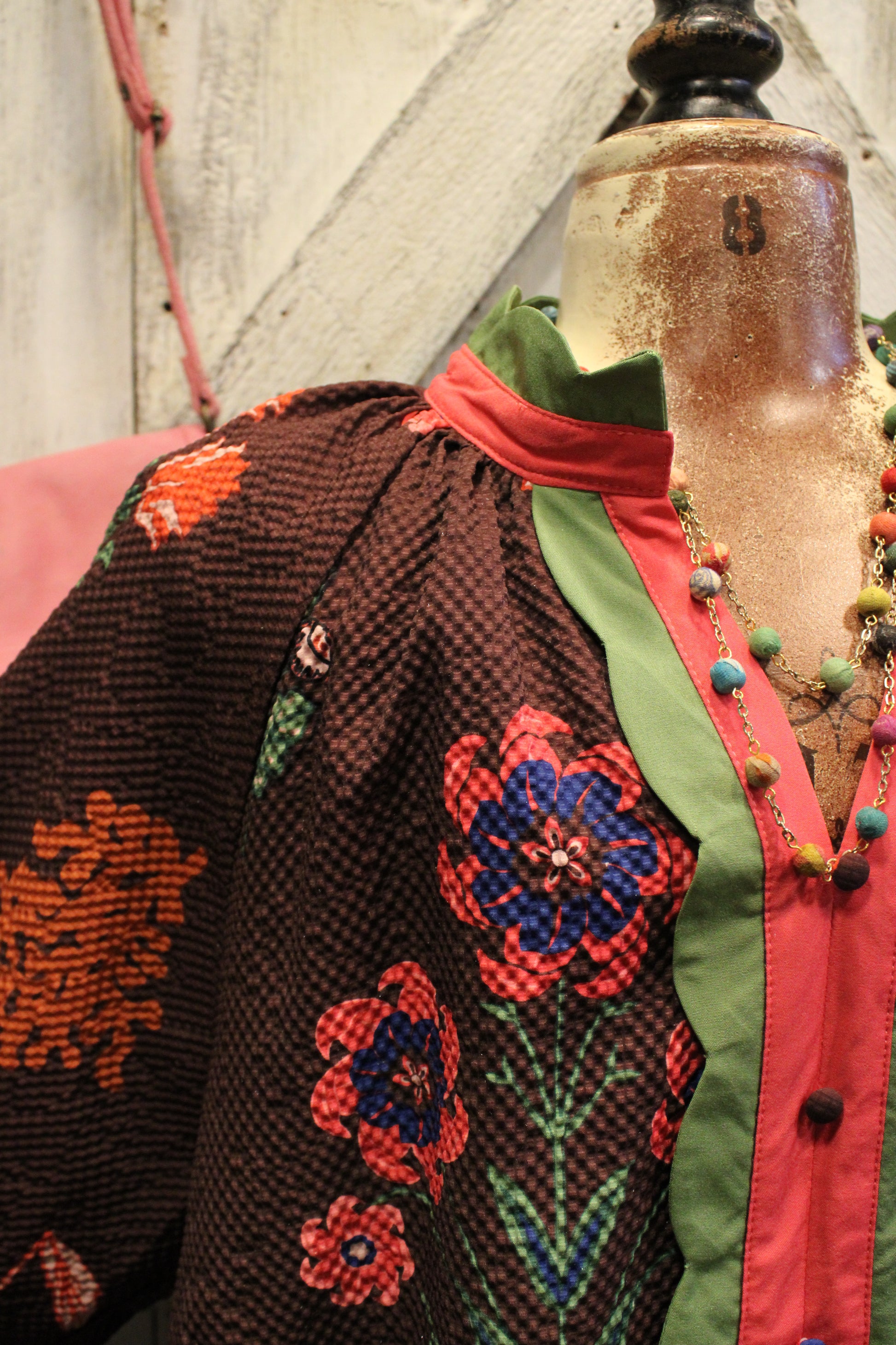 Introducing the Front Porch Florals Blouse- This red-brown mix top is full of farmhouse charm with its bold floral print, scalloped trim, and playful pops of green and pink. The relaxed fit, lightweight fabric, and button-front design make it as comfy as it is eye-catching.