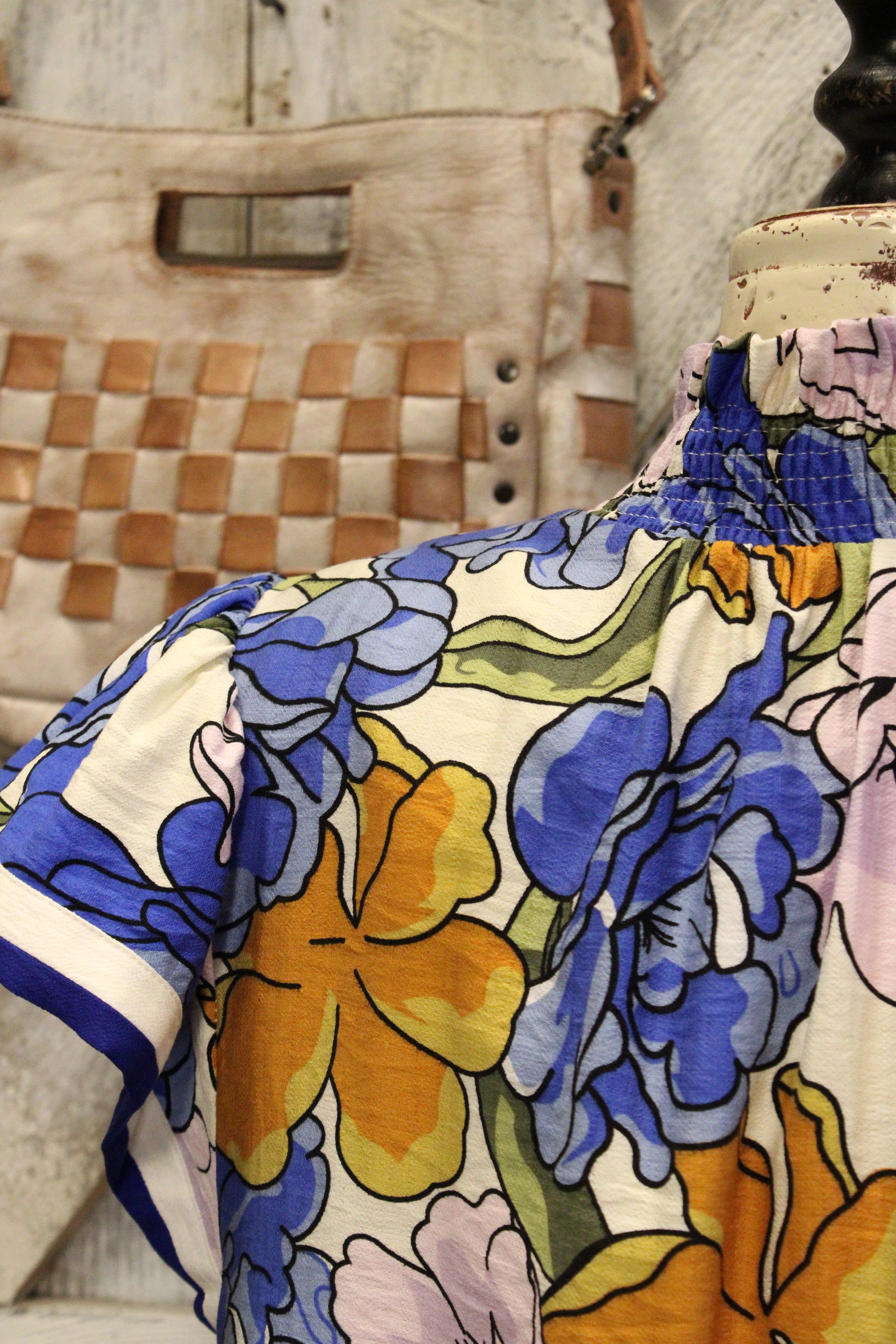 Introducing the Garden Glow Blouse - This charming floral top is the perfect blend of classic and cheerful. Featuring a soft cream base with bold blue, golden yellow, and lavender florals, it brings a fresh pop of color that feels effortless and timeless.