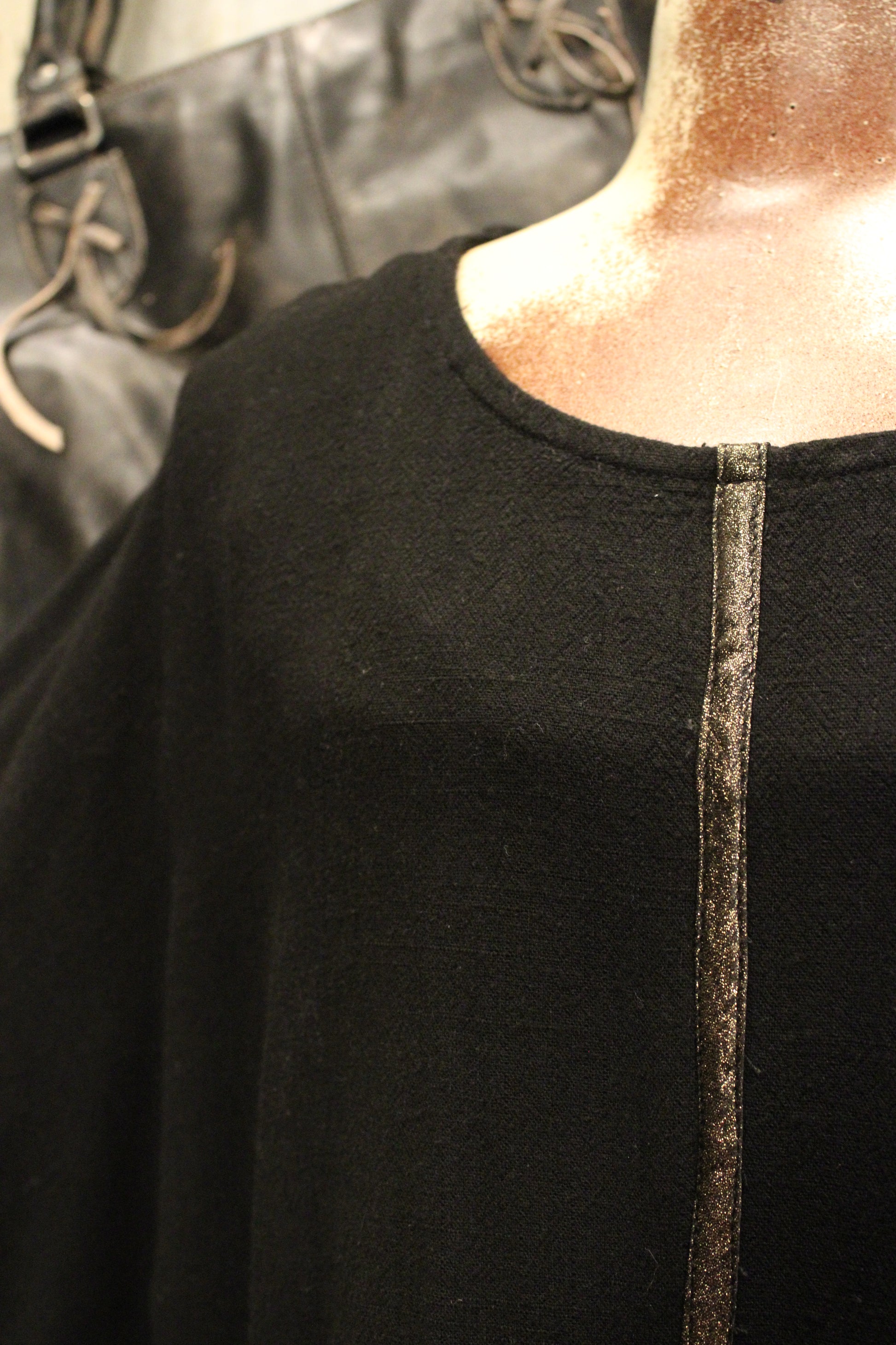 Introducing the Gilded Edge Scallop Top- This black top is a beautiful blend of simplicity and subtle detail. Crafted with a relaxed, airy fit, it features delicate metallic trim that runs vertically down the front and along the edges, adding just the right touch of shimmer. The softly scalloped hem and sleeves create gentle movement and a feminine finish without feeling fussy.