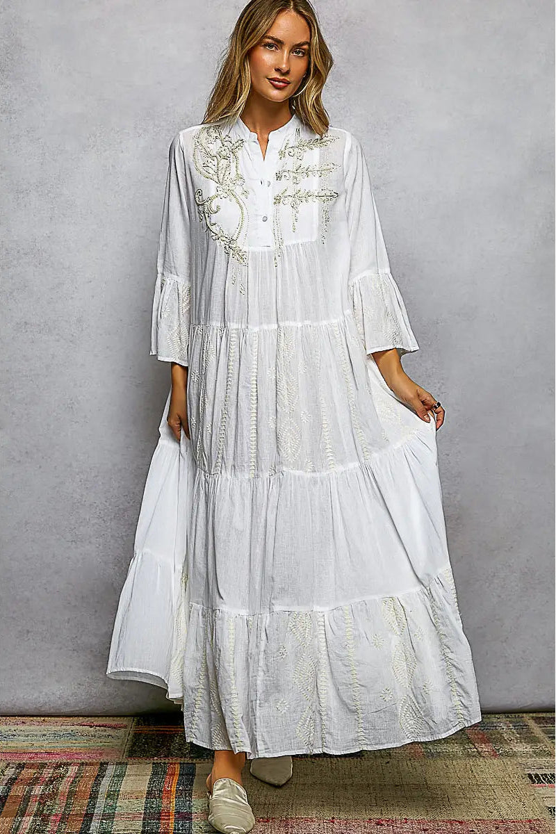 Introducing the stunning Gilded Shoreline Maxi Dress from POL Clothing! This white embroidered tiered maxi dress is effortlessly graceful with timeless boho charm. Designed with delicate tonal embroidery across the bodice and sleeves, this flowy maxi features a soft button-front neckline, relaxed 3/4 sleeves, and cascading tiered panels that create beautiful movement from every angle. The lightweight fabric drapes softly, giving it an airy, feminine silhouette.