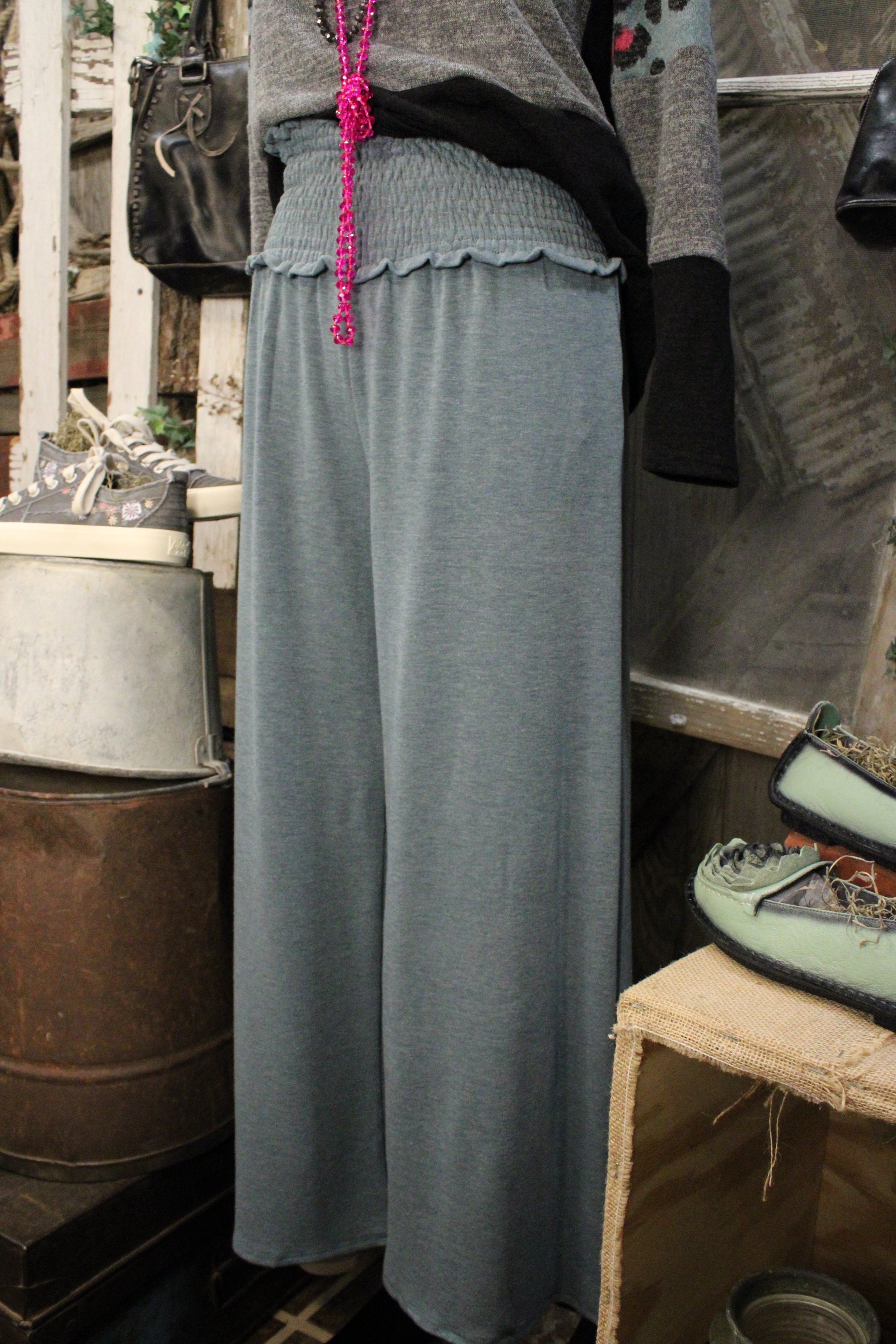 The soft teal color adds a fresh, versatile touch to your wardrobe and pairs effortlessly with neutrals, denim, and cozy layers. Whether you’re heading to the market, running errands, or styling a relaxed boutique outfit, these flowy wide leg pants are a go-to piece you’ll reach for again and again.