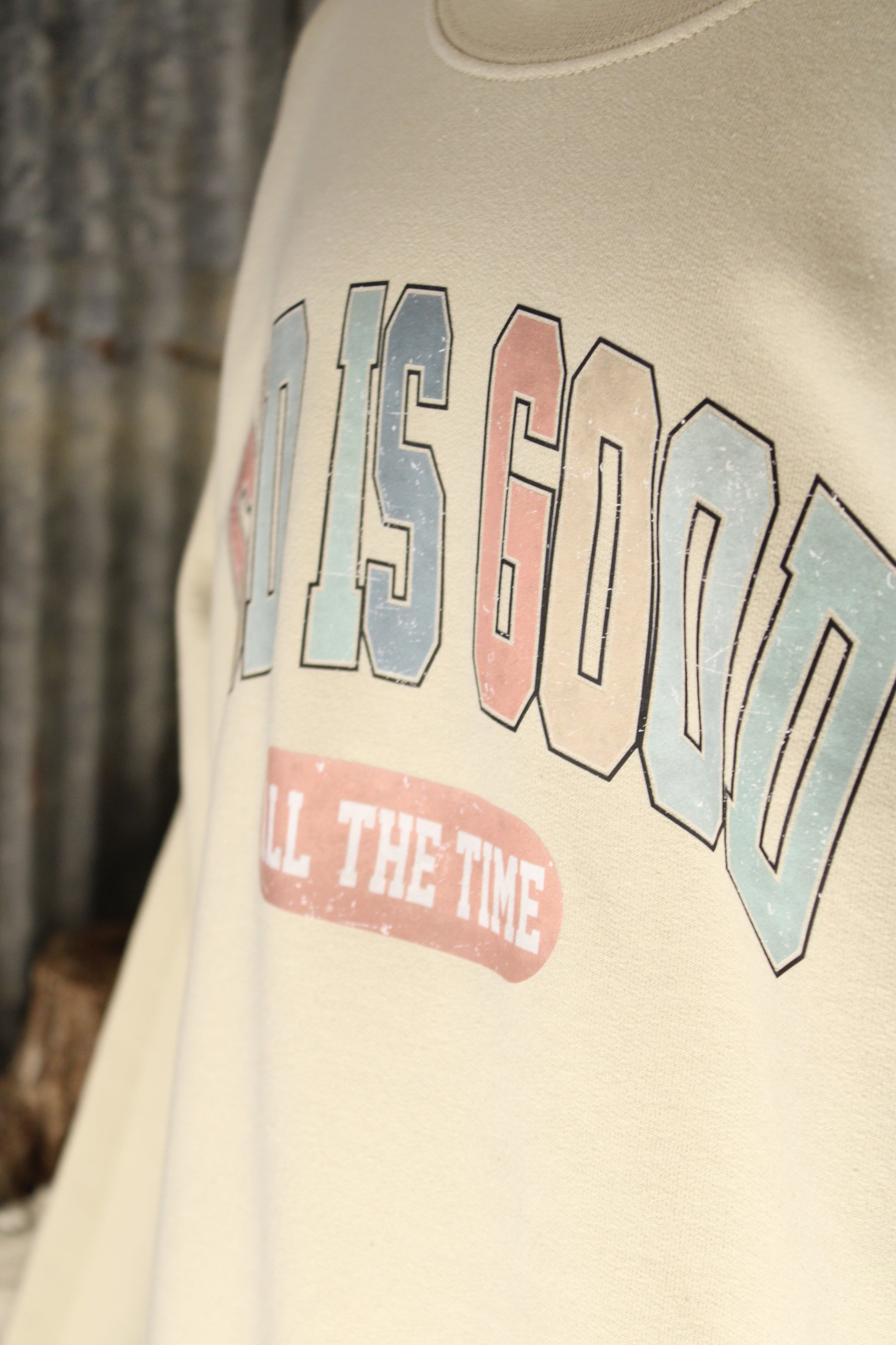 Introducing the "God Is Good Sweatshirt" - a cozy and stylish addition to your wardrobe. This sweatshirt features a classic round neck and comfortable long sleeves, perfect for staying warm during the cooler seasons. A cozy graphic sweatshirt with a message we can all get behind. This soft neutral pullover features a relaxed fit and pastel “God Is Good All The Time” lettering for a sweet, uplifting touch. Easy to pair with denim, leggings, or lounge pants, it’s the kind of throw-on piece you’ll reach for again and again when you want comfort with a little heart.