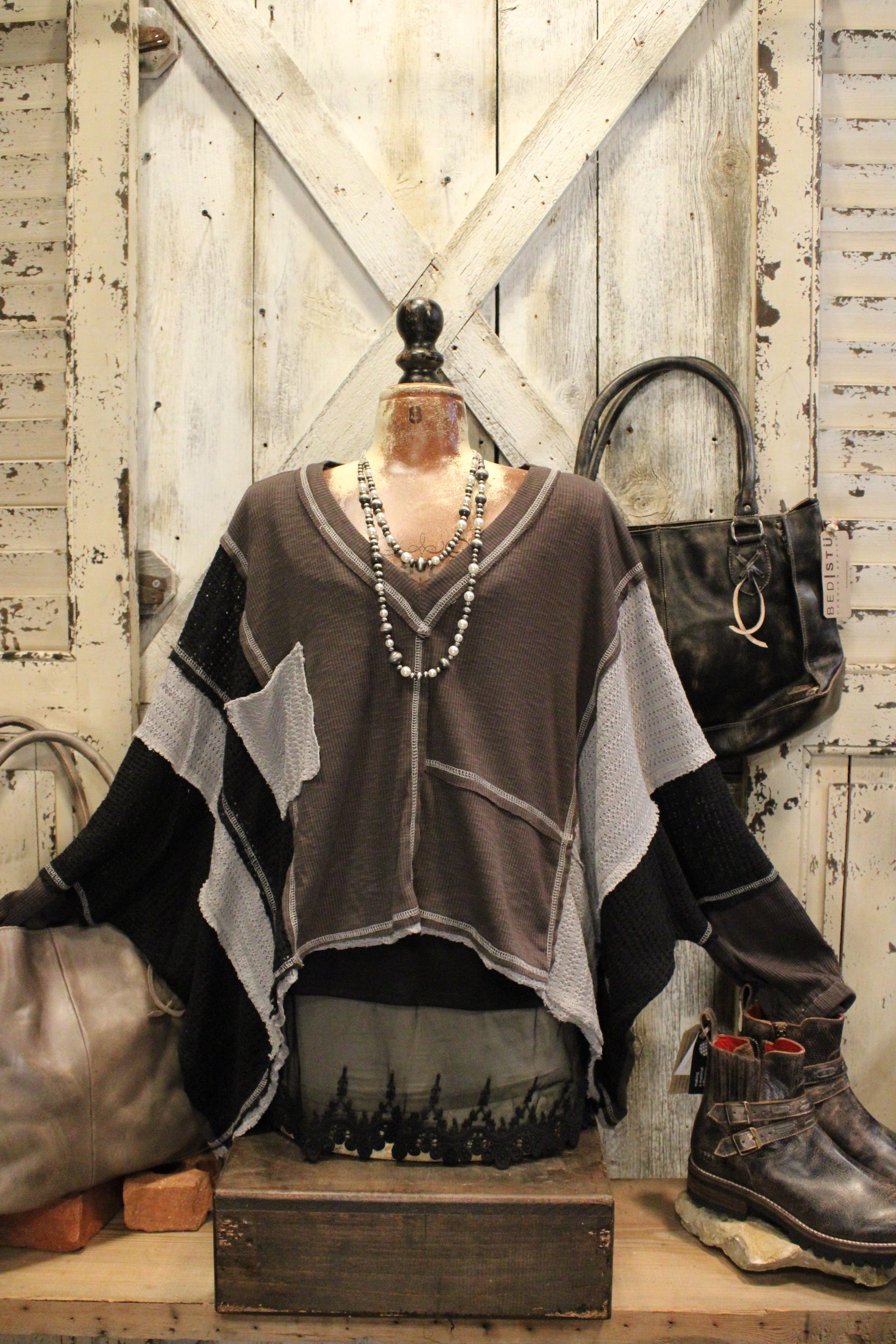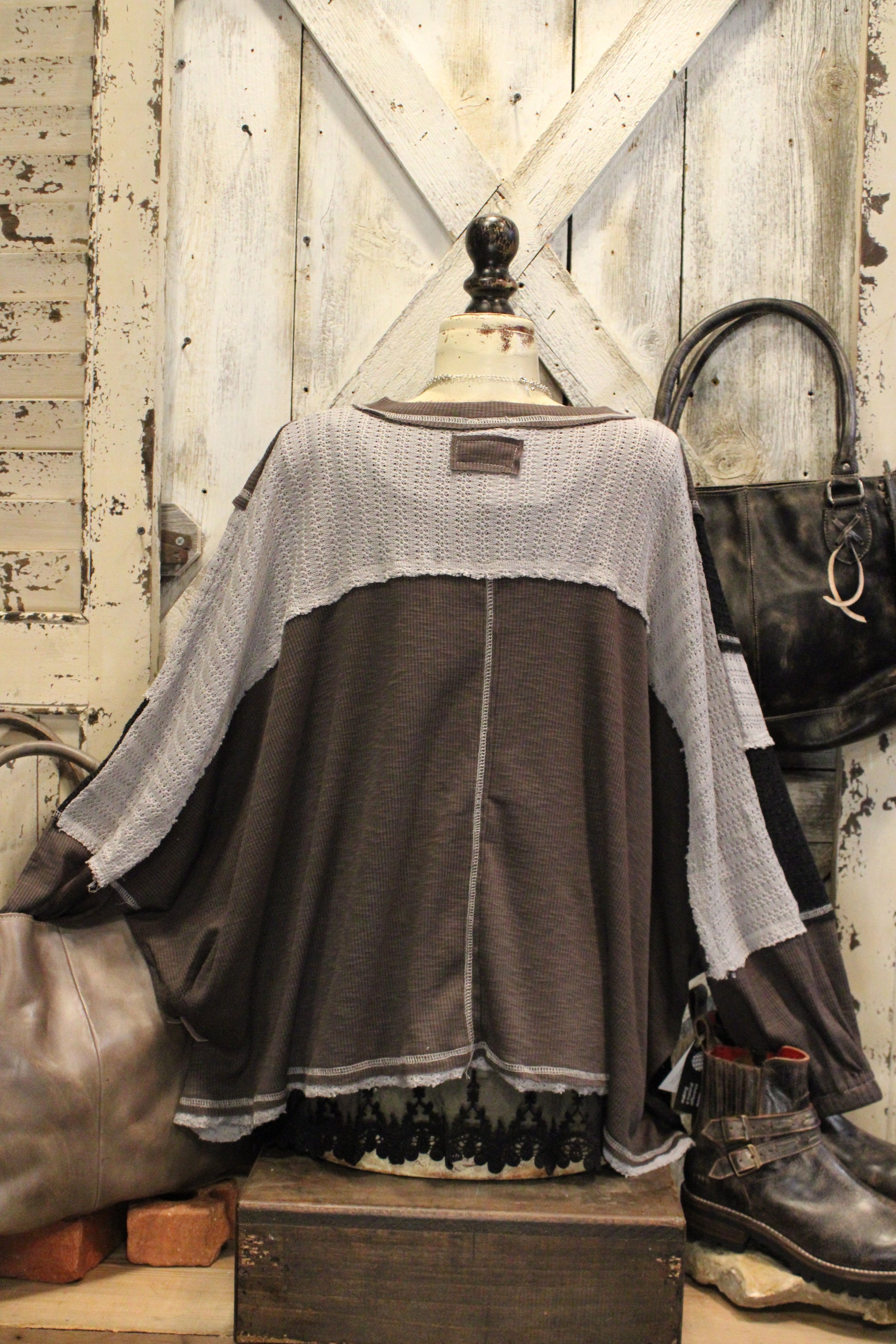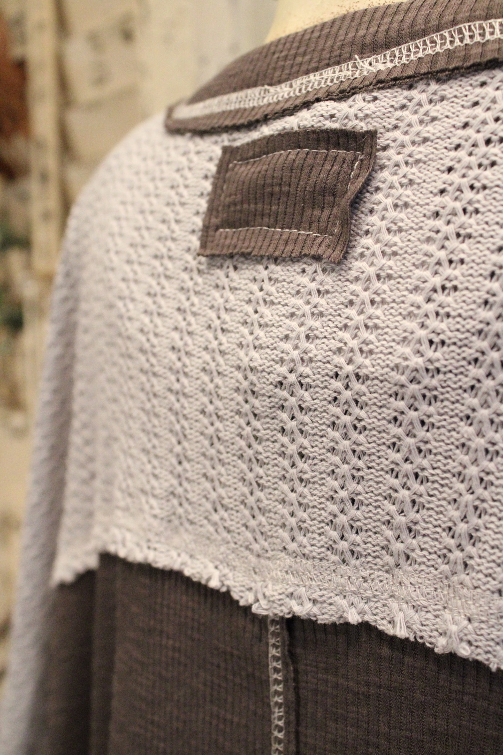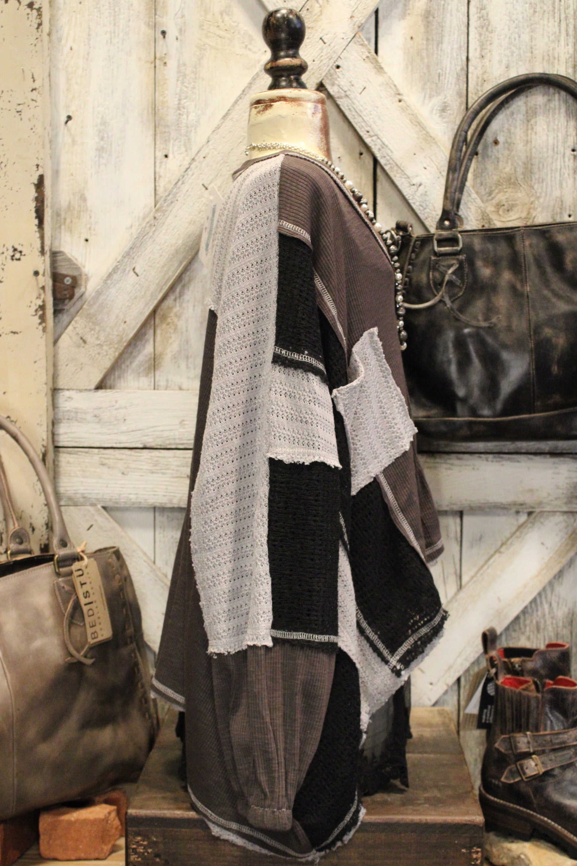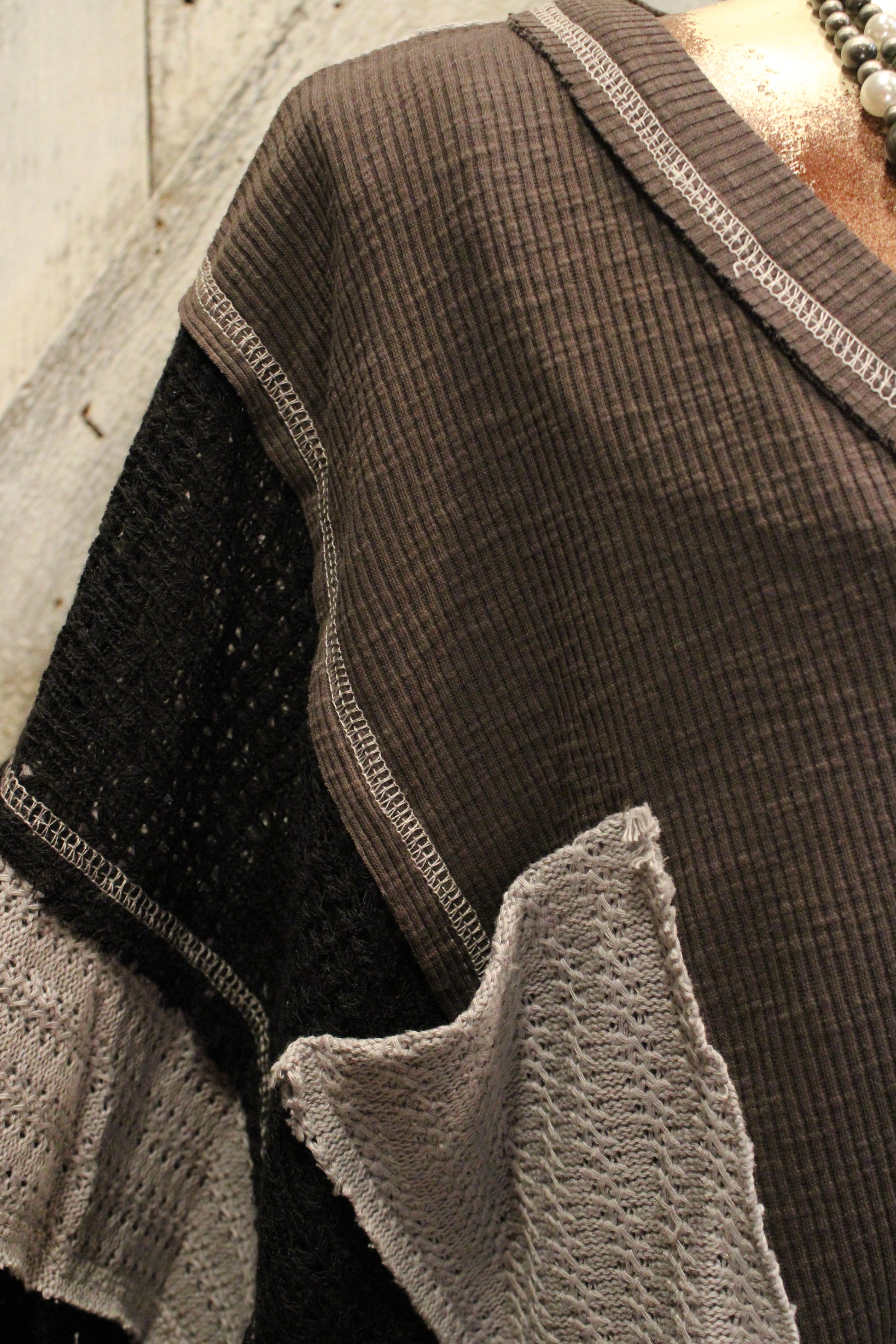 Introducing the Gray Skies Sweater- Add a bold twist to your casual collection with this Patchwork Waffle-Knit V-Neck Sweater. Crafted from soft, textured fabric with a loose, oversized fit, this piece features a rich blend of earthy tones, contrasting knit patterns, and raw edge detailing for a perfectly undone aesthetic. The exposed seams and patchwork construction give it an effortless, artsy vibe that’s equal parts cozy and cool.