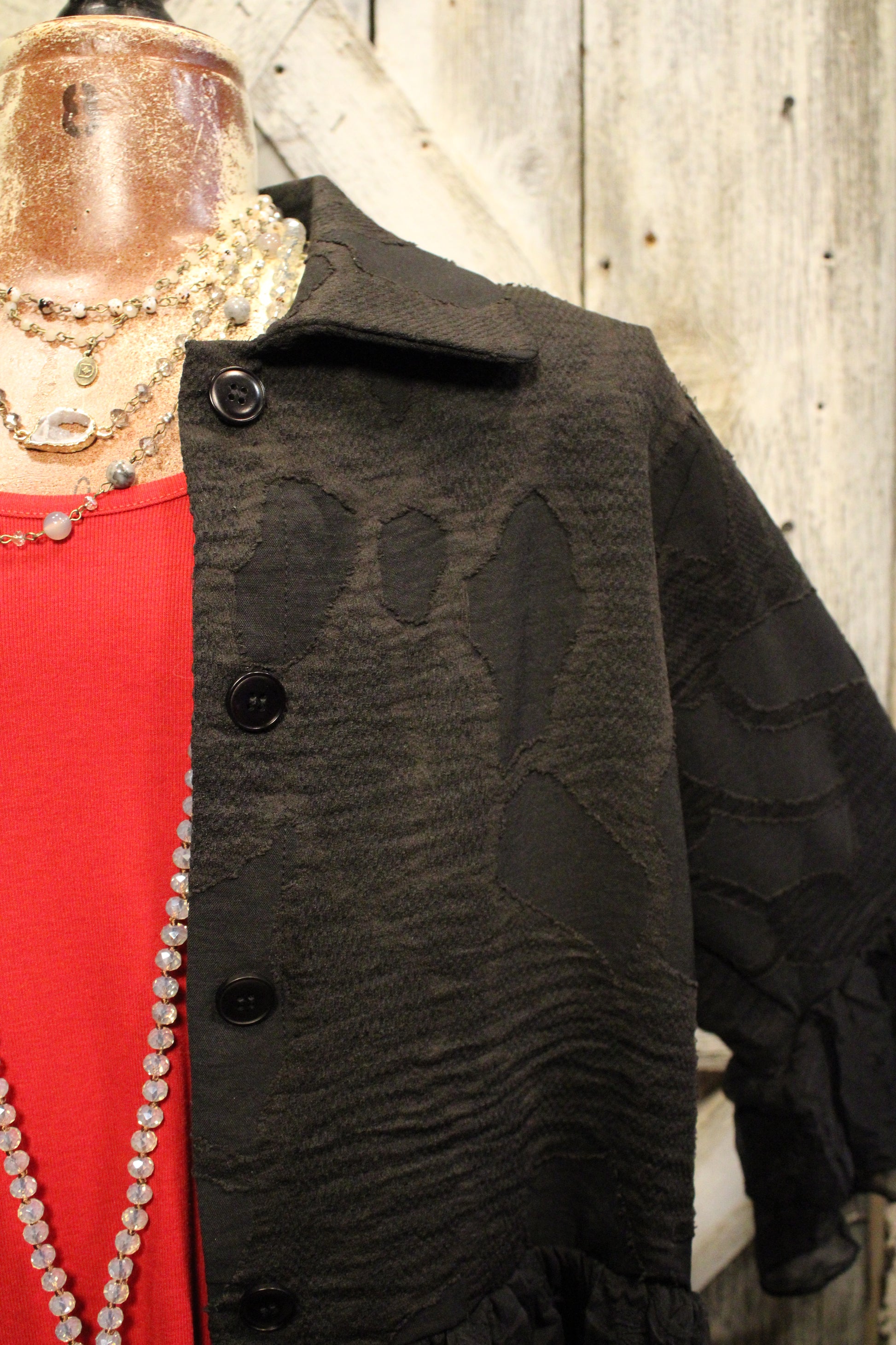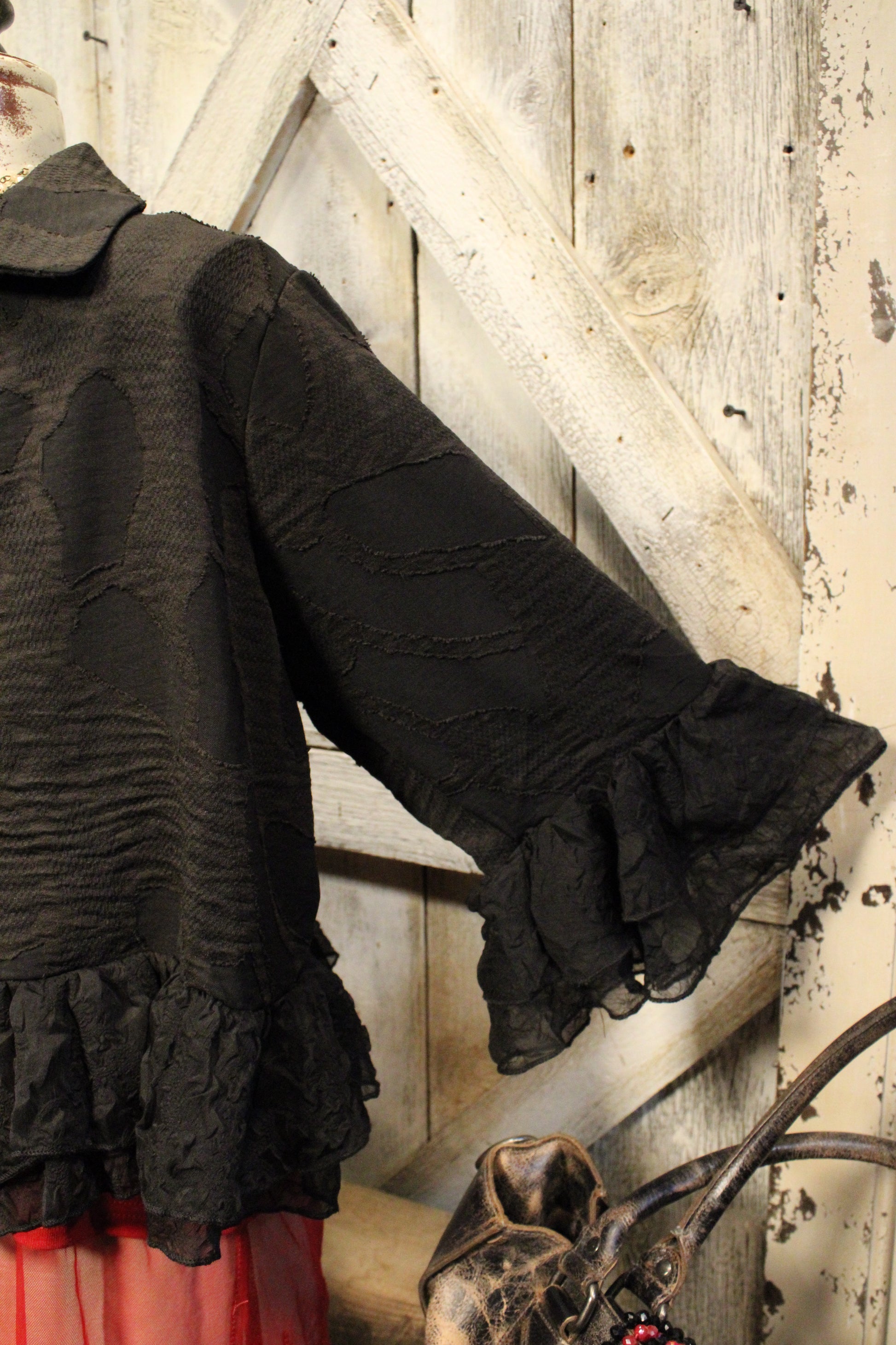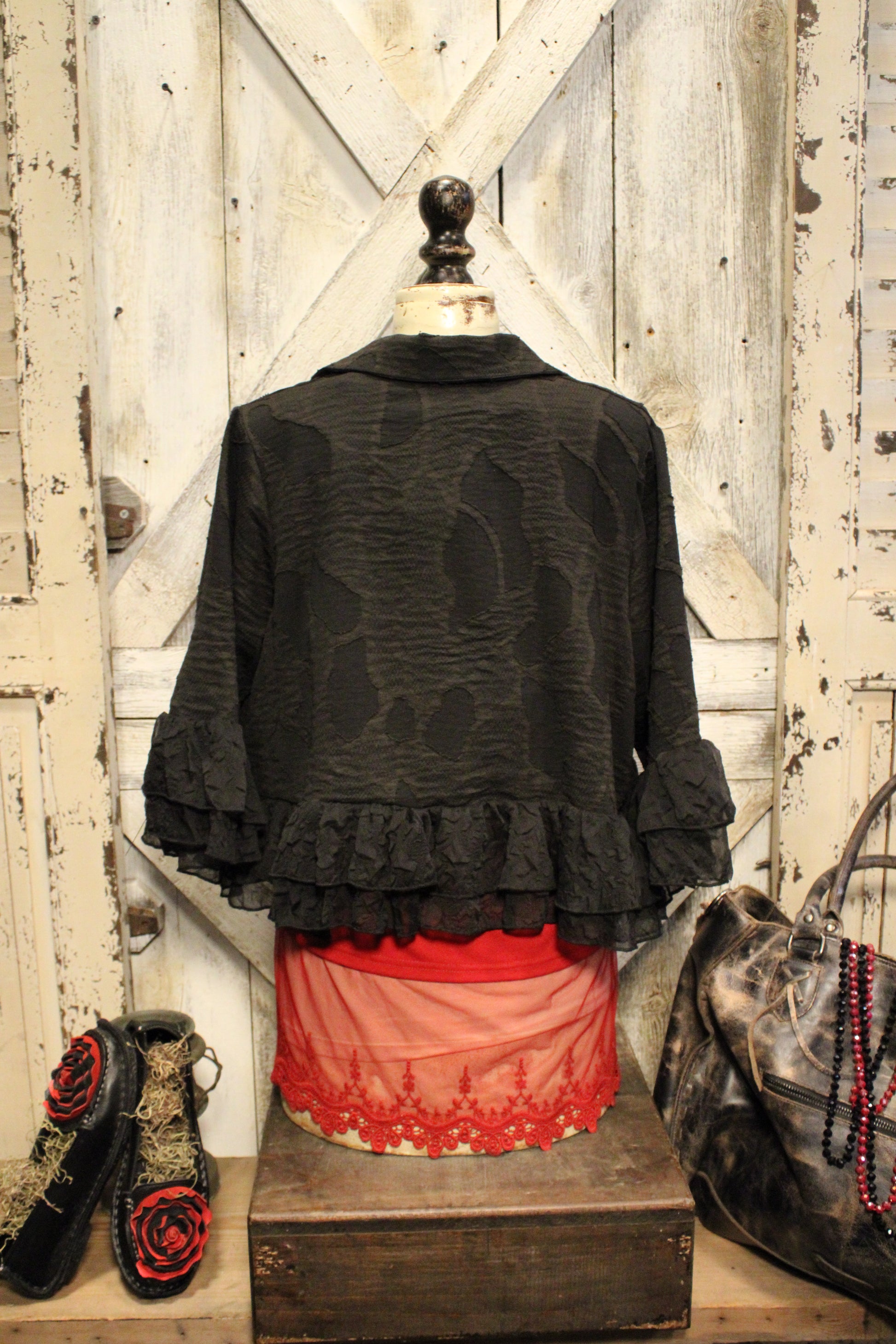 Introducing our Grit & Glam Lightweight Jacket- Make a statement with timeless charm in this fabulous jacket! This vintage-inspired piece features textured black fabric with subtle floral accents and a cropped silhouette that flatters every figure. The wide sleeves are finished with romantic layered ruffle cuffs, adding soft movement and a touch of drama. A classic collar and button-down front keep it structured, while the playful hem and delicate detailing give it a feminine flair.