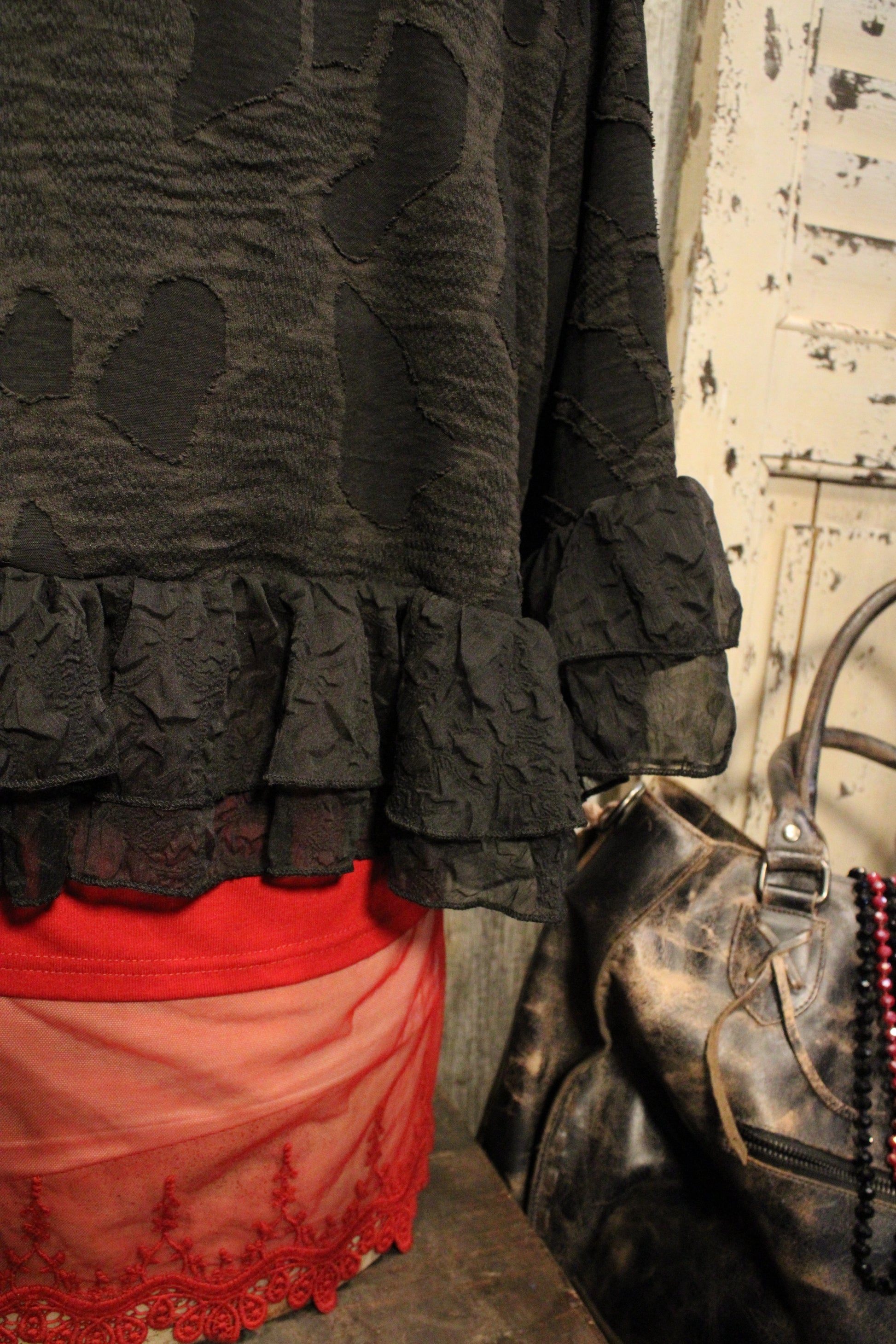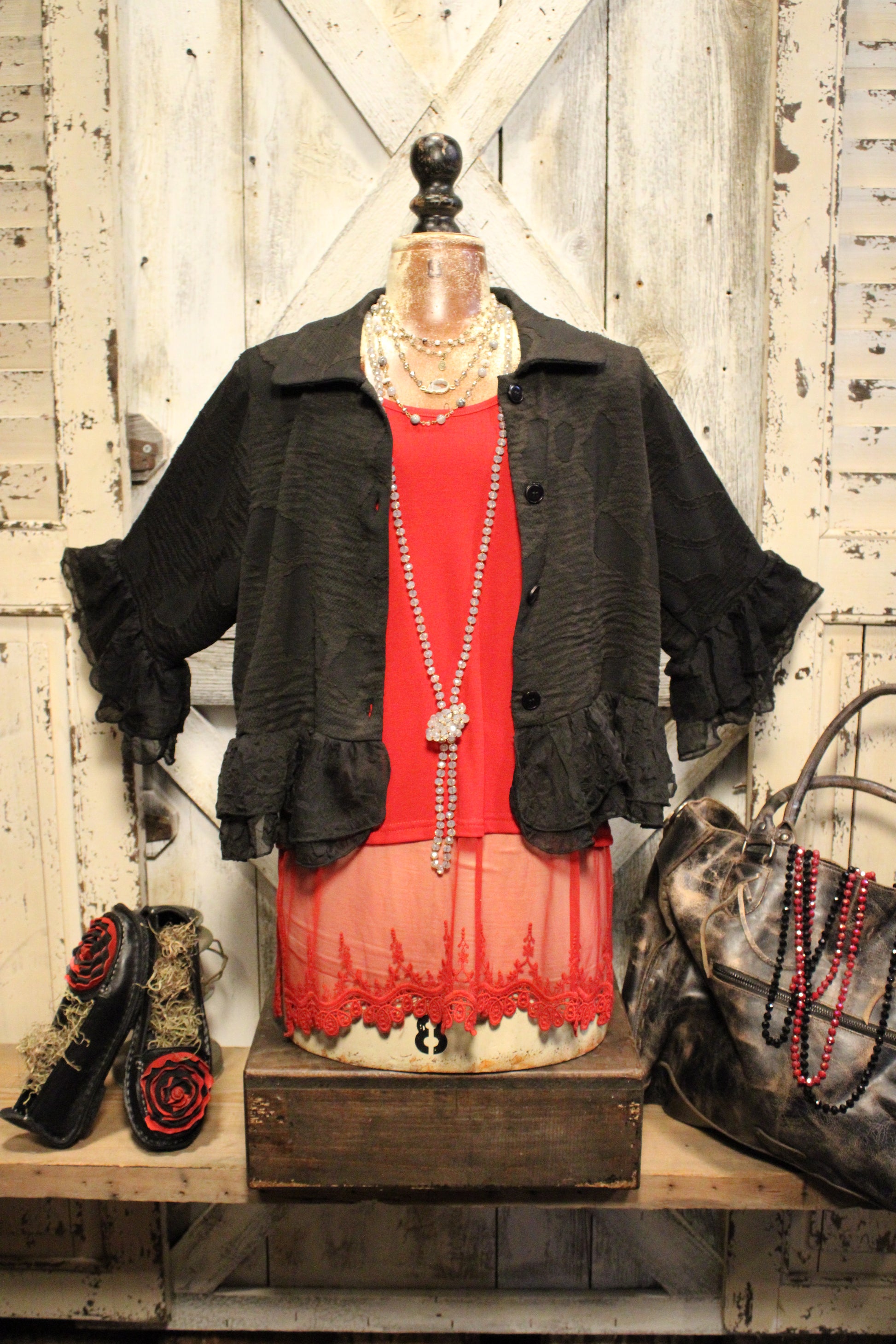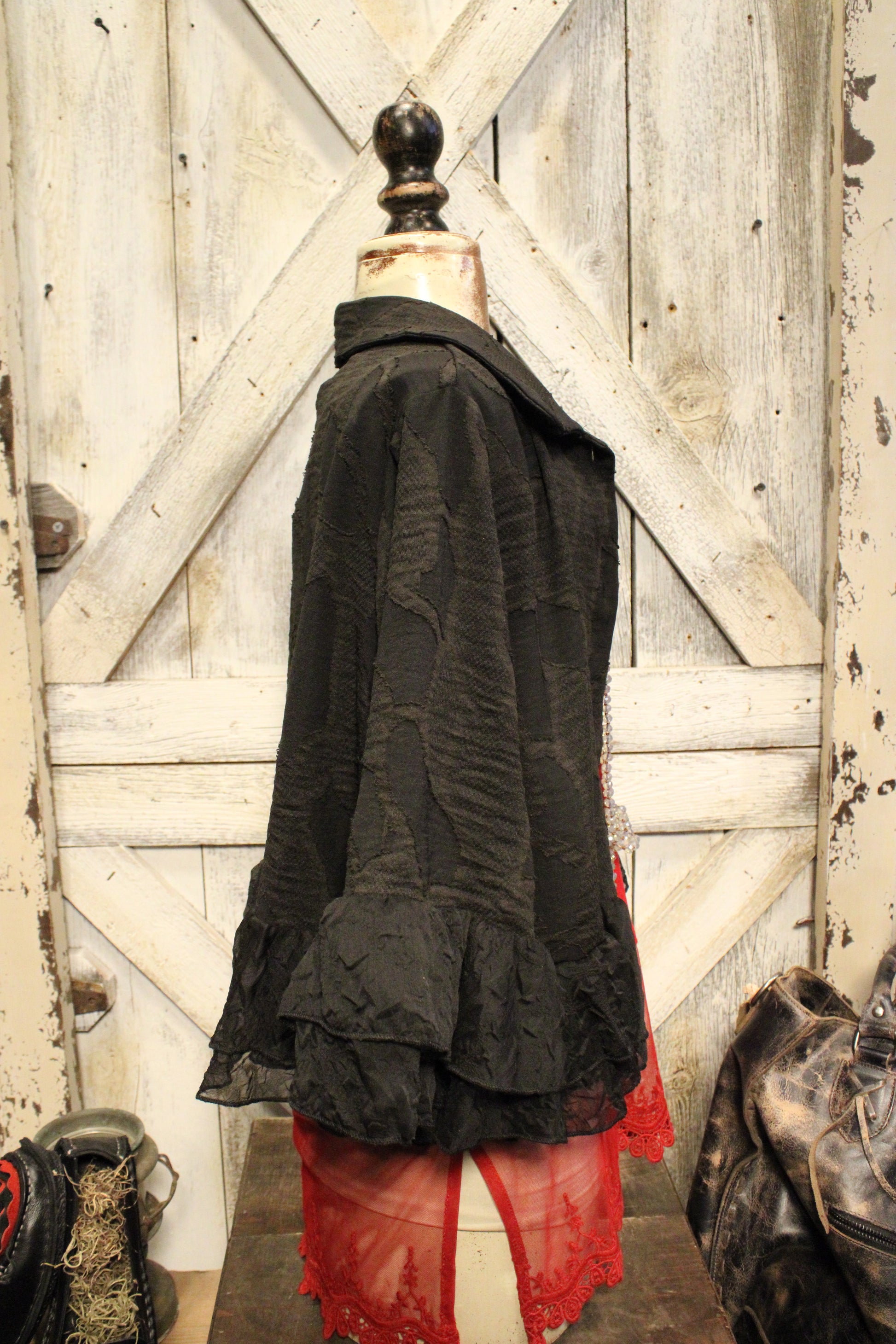 Introducing our Grit & Glam Lightweight Jacket- Make a statement with timeless charm in this fabulous jacket! This vintage-inspired piece features textured black fabric with subtle floral accents and a cropped silhouette that flatters every figure. The wide sleeves are finished with romantic layered ruffle cuffs, adding soft movement and a touch of drama. A classic collar and button-down front keep it structured, while the playful hem and delicate detailing give it a feminine flair.