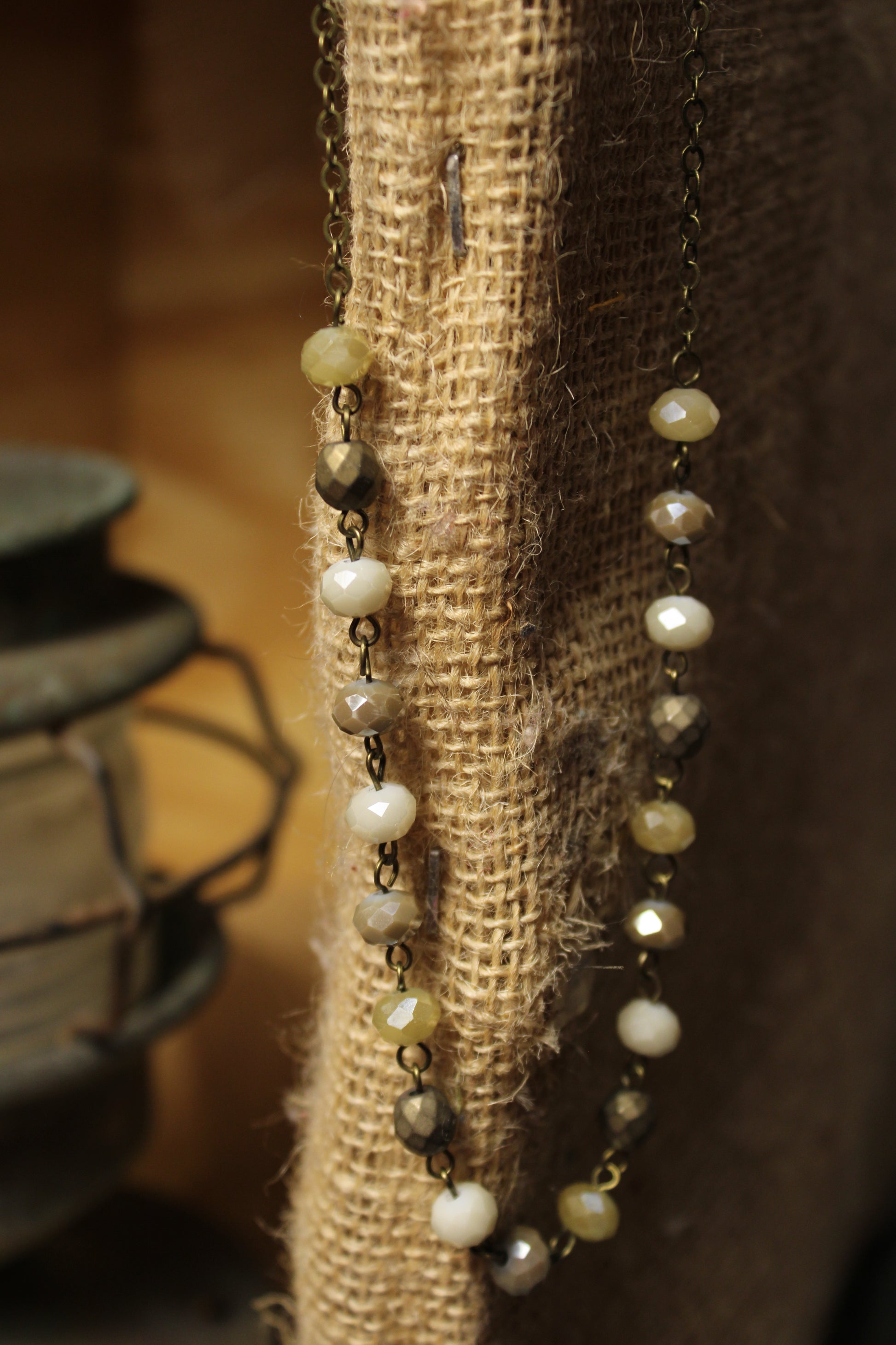Introducing the elegant Gwyneth Necklace, a dazzling accessory that adds a touch of glamour to any outfit. A beautifully neutral beaded necklace that adds effortless earthy charm to any outfit. This long strand features faceted glass beads in soft cream, taupe, and warm stone tones on an antique brass chain for a perfectly vintage-inspired finish. Lightweight and easy to layer, it pairs beautifully with denim, dresses, and cozy knits for everyday wear.