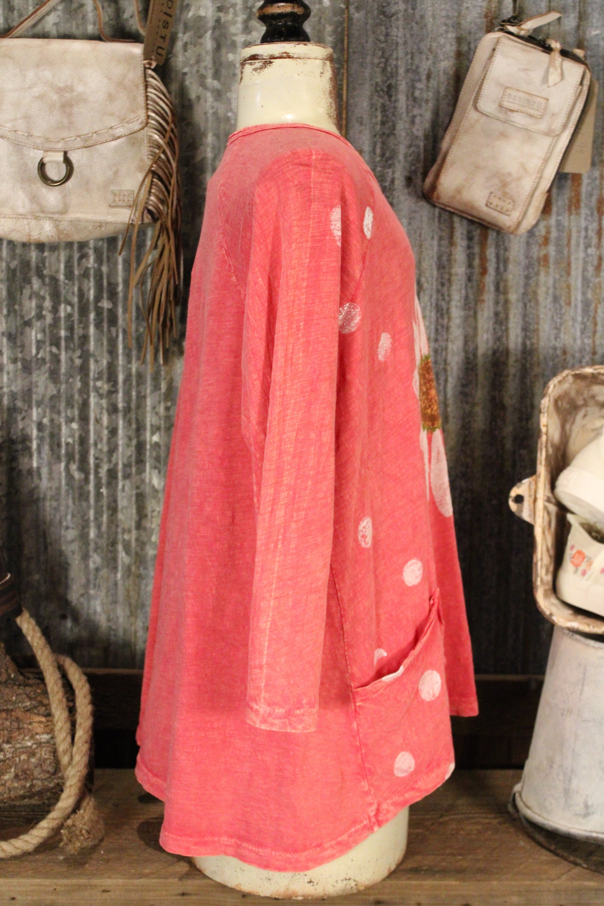 Introducing the Happy Days Tunic- This cheerful daisy graphic top brings effortless comfort and everyday style to your wardrobe. Designed with a soft washed finish, it features a playful oversized daisy print, subtle polka dot accents, and a relaxed silhouette with front patch pockets for easy wear. The lightweight fabric and easy fit make it perfect for pairing with denim, leggings, or layered looks. A fun, feel-good piece that adds a pop of color and casual charm to any outfit.