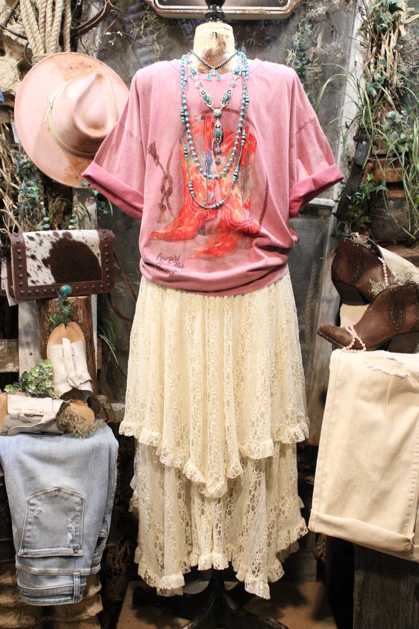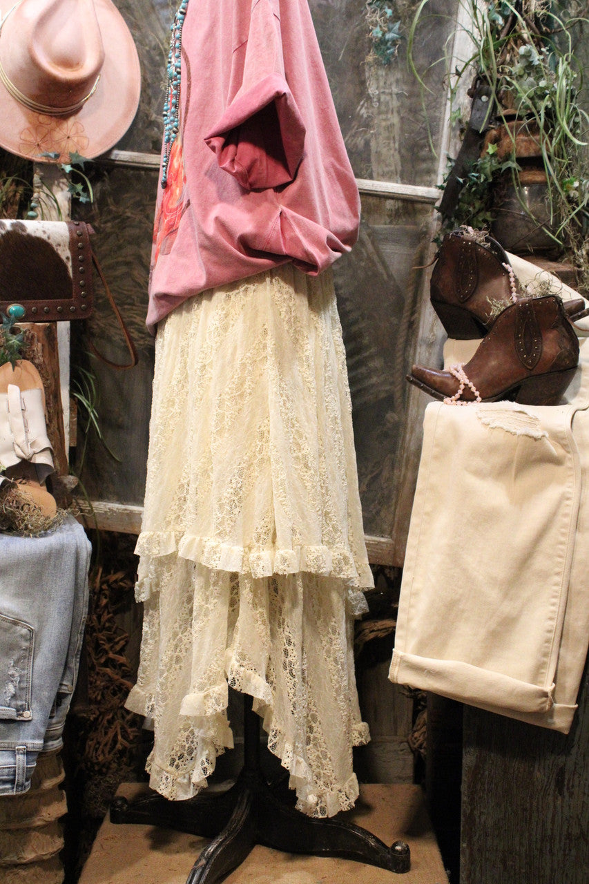 Get ready to hit the trails in style with the Easel Happy Trails Lace Skirt. This western-inspired skirt is all about laid-back charm with a bohemian twist. Slip into this versatile piece for a casual date or a day at church. Effortlessly on-trend and easy to wear, the Happy Trails Lace Skirt brings a touch of free-spirited flair to any occasion.