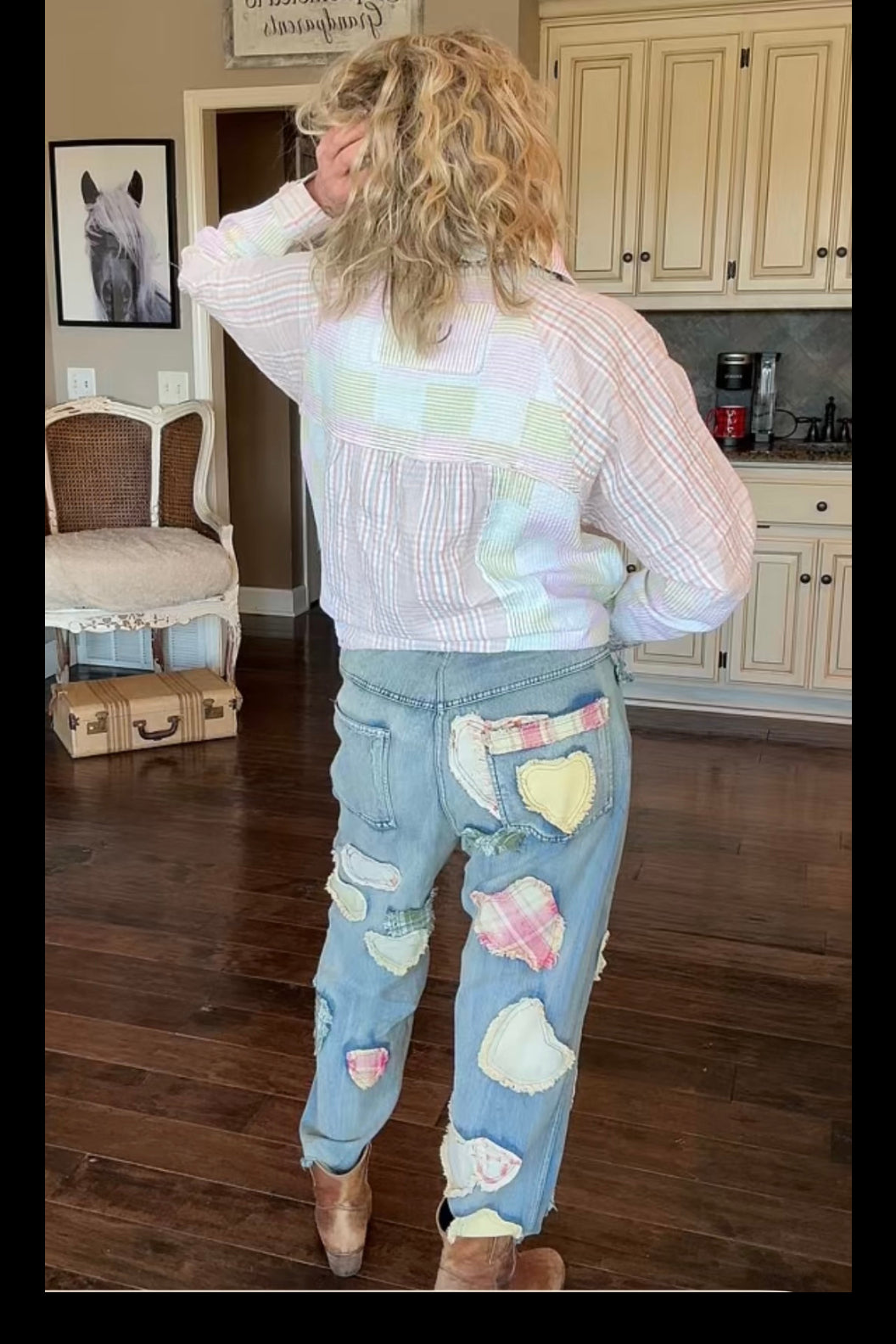 Explore your free-spirited side with BLUEVELVET's Hattie Hearts Patchwork Jeans. These bohemian-inspired jeans in a delightful multi-color pattern add a playful touch to your look. Perfect for Gypsy Fun and Girls Day Shopping, these jeans are your go-to companion for carefree days out. Available in regular sizes, these jeans are as comfy as they are stylish. Embrace the fun and quirky vibes these patchwork jeans bring to your wardrobe and step out in colorful confidence.