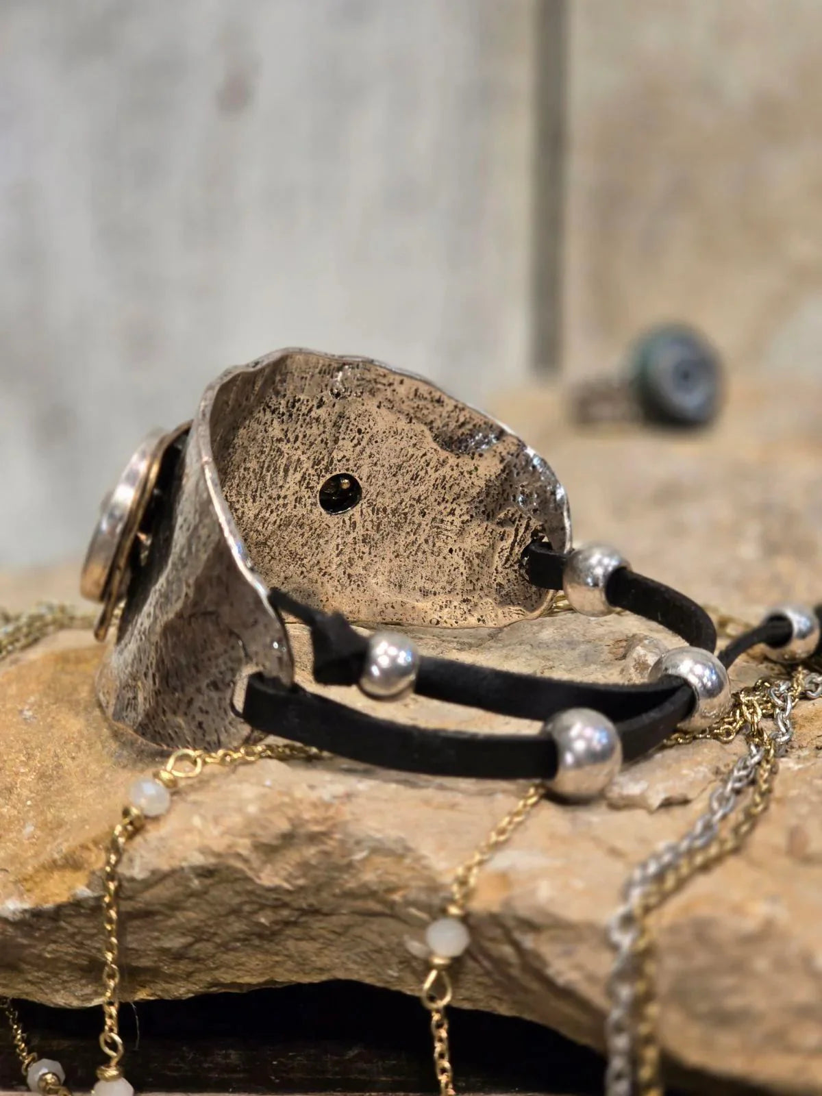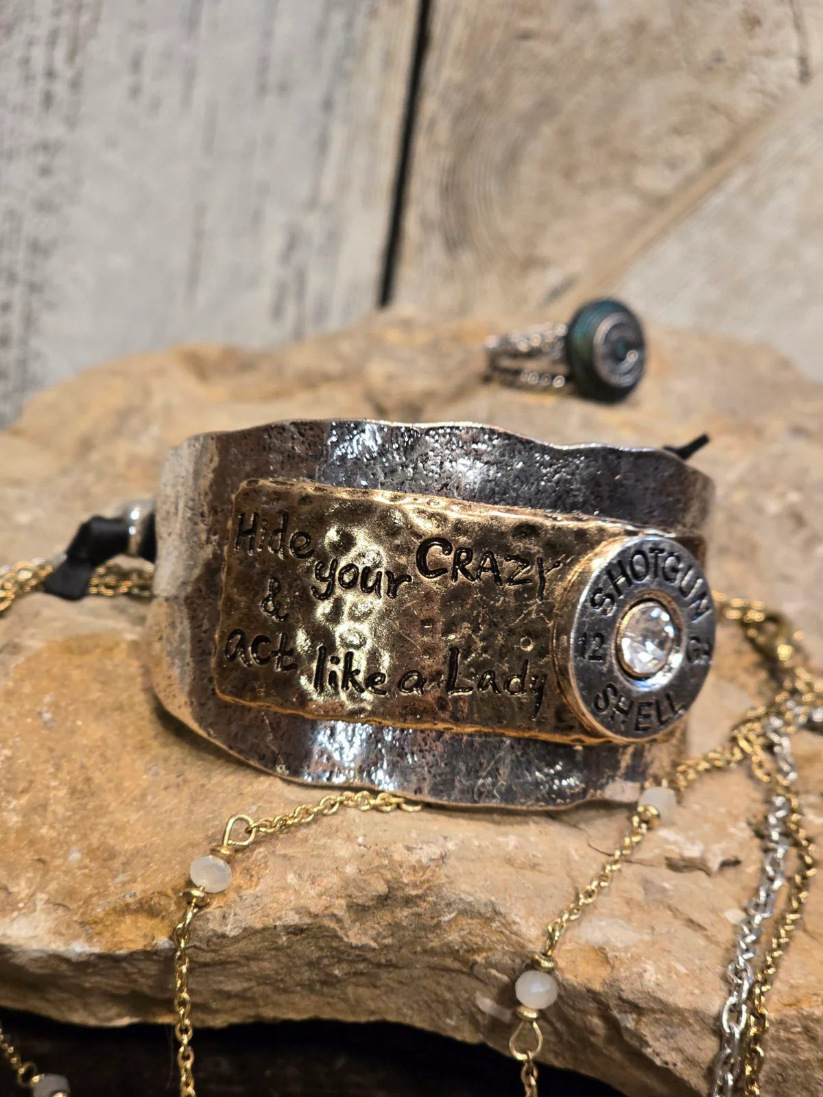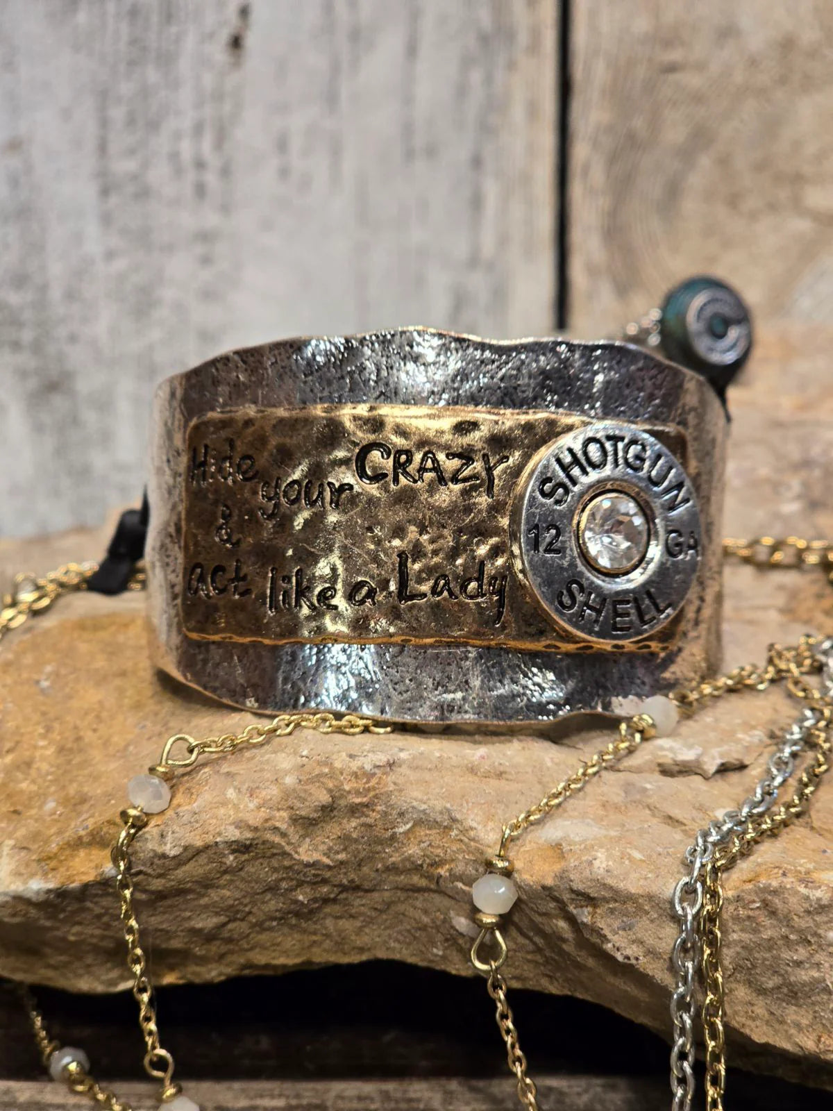 For the sass queen who owns her wild side but knows when to rein it in—meet the "Hide Your Crazy Silver Cuff Bracelet. This edgy mixed-metal piece features a hammered copper plate stamped with the playful saying, “Hide your crazy & act like a lady,” paired with a repurposed 12-gauge shotgun shell accent, complete with a rhinestone center for a touch of sparkle.