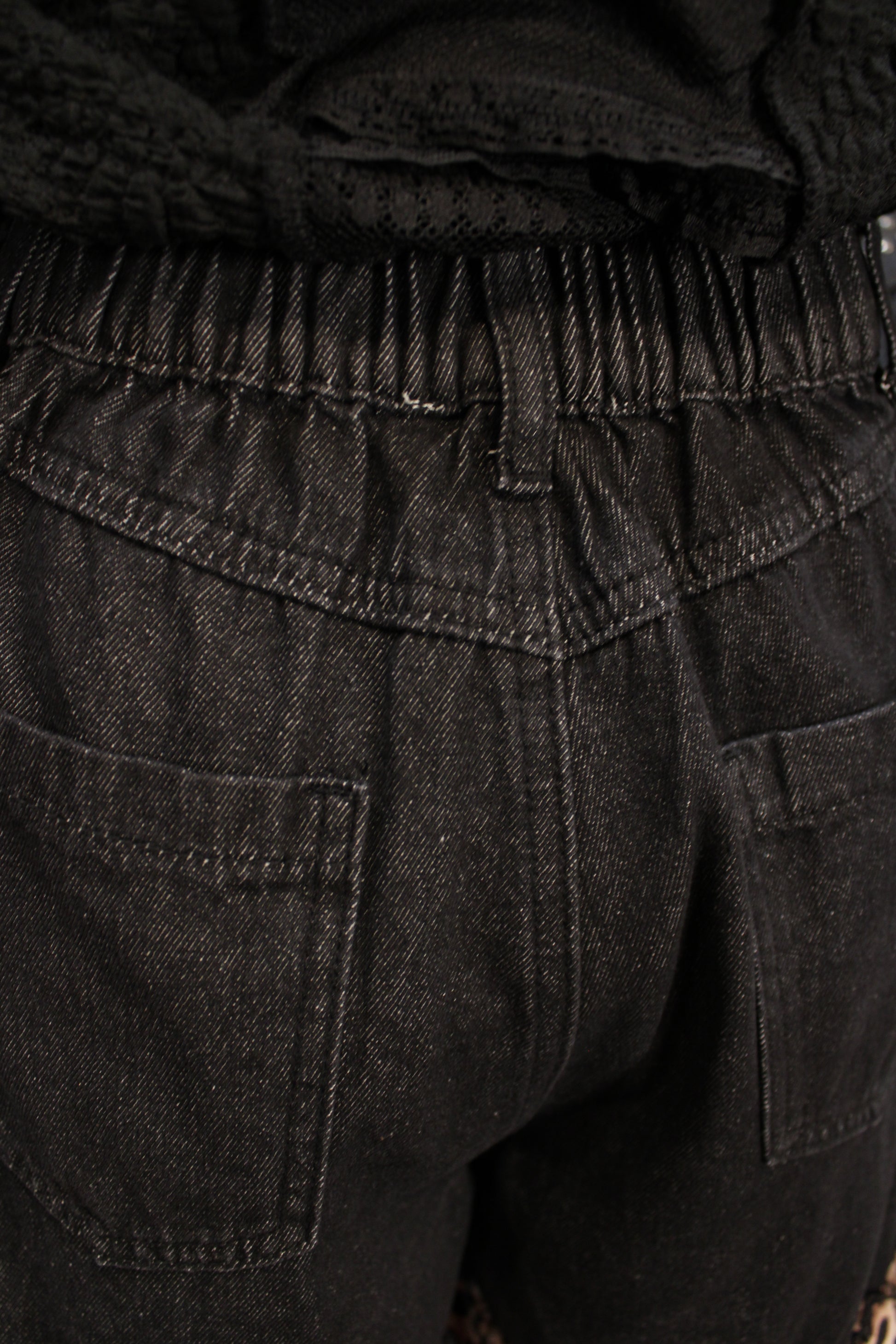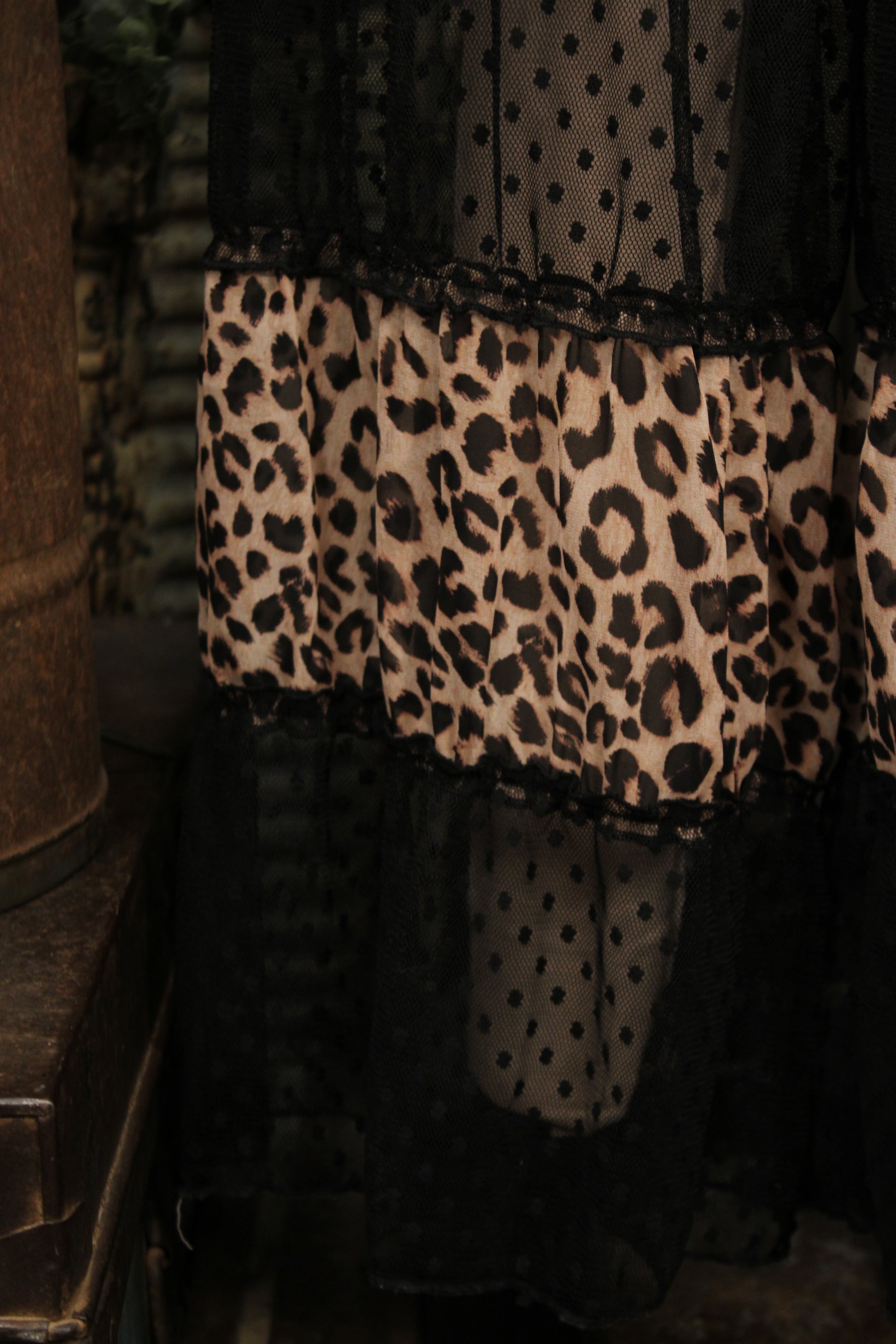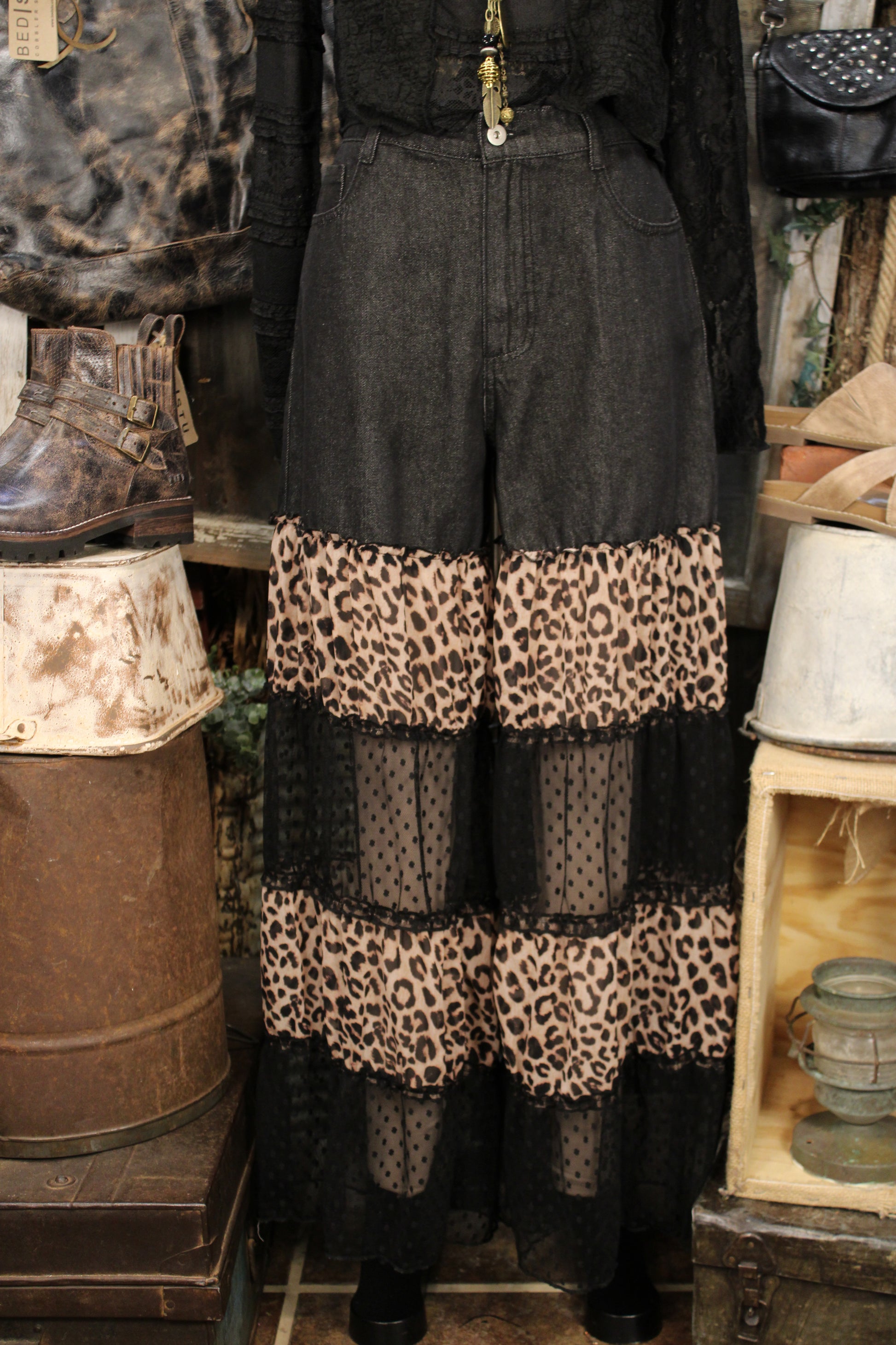 Step into the spotlight with these adorable High Noon Leopard Lace Jeans- Soft meets bold in these statement wide-leg pants that bring a little western drama to your everyday lineup. The high-rise black denim top flows into tiered leopard panels and sheer dotted mesh, creating movement and texture with every step. An elastic back waistband keeps the fit comfortable while front pockets add an easy, practical touch. These leopard tiered pants are made for pairing with simple tees, lace tops, or chunky knits when you want your outfit to do the talking.