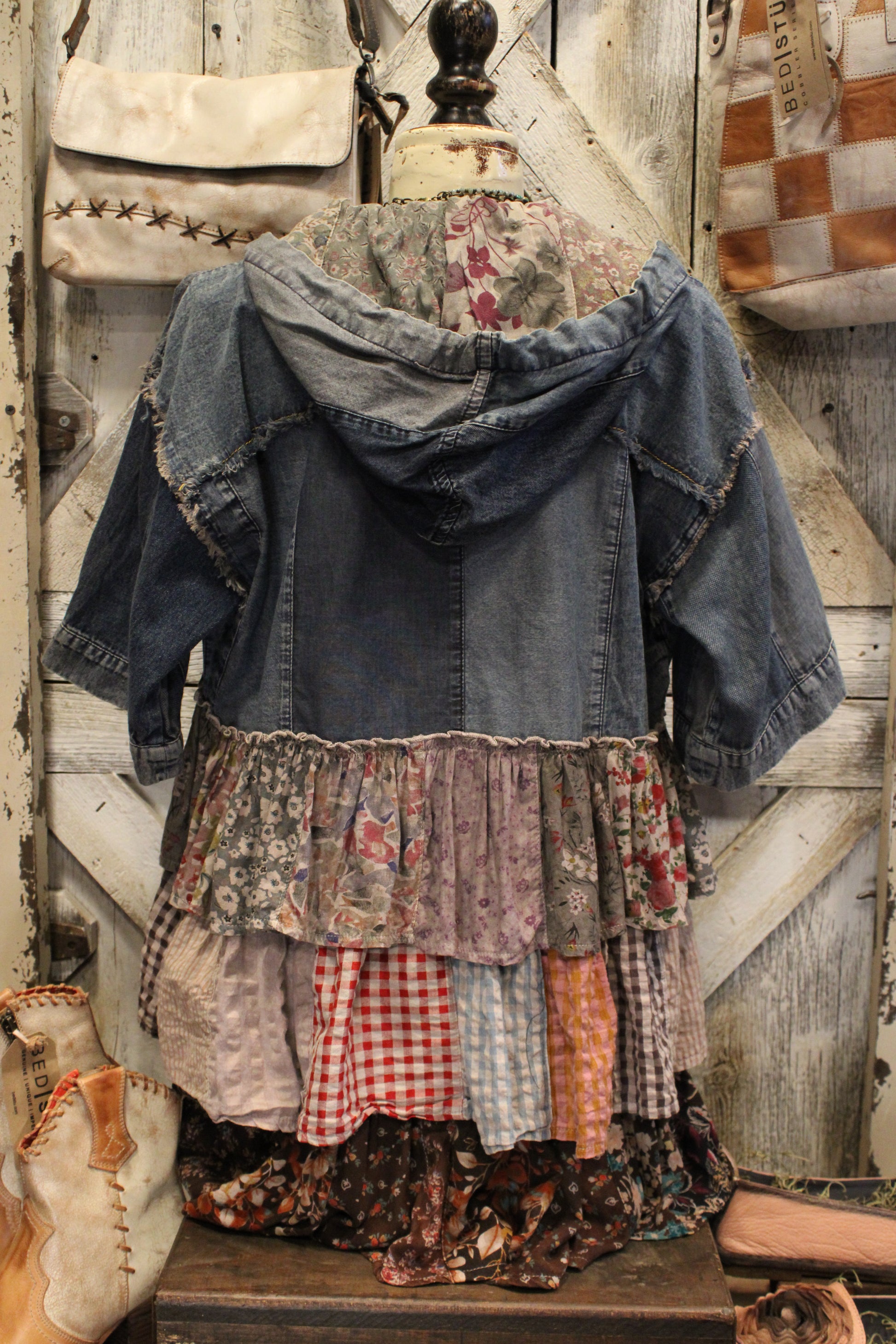 Introducing the Country Charm Hooded Patchwork Top- Meet your new favorite statement layer—this denim + patchwork hoodie is farmhouse chic with a boho twist. The structured denim top half, complete with chest pockets and a hood, gives it a casual, laid-back feel, while the tiered ruffle patchwork bottom adds flowy movement and pops of earthy florals and textures.