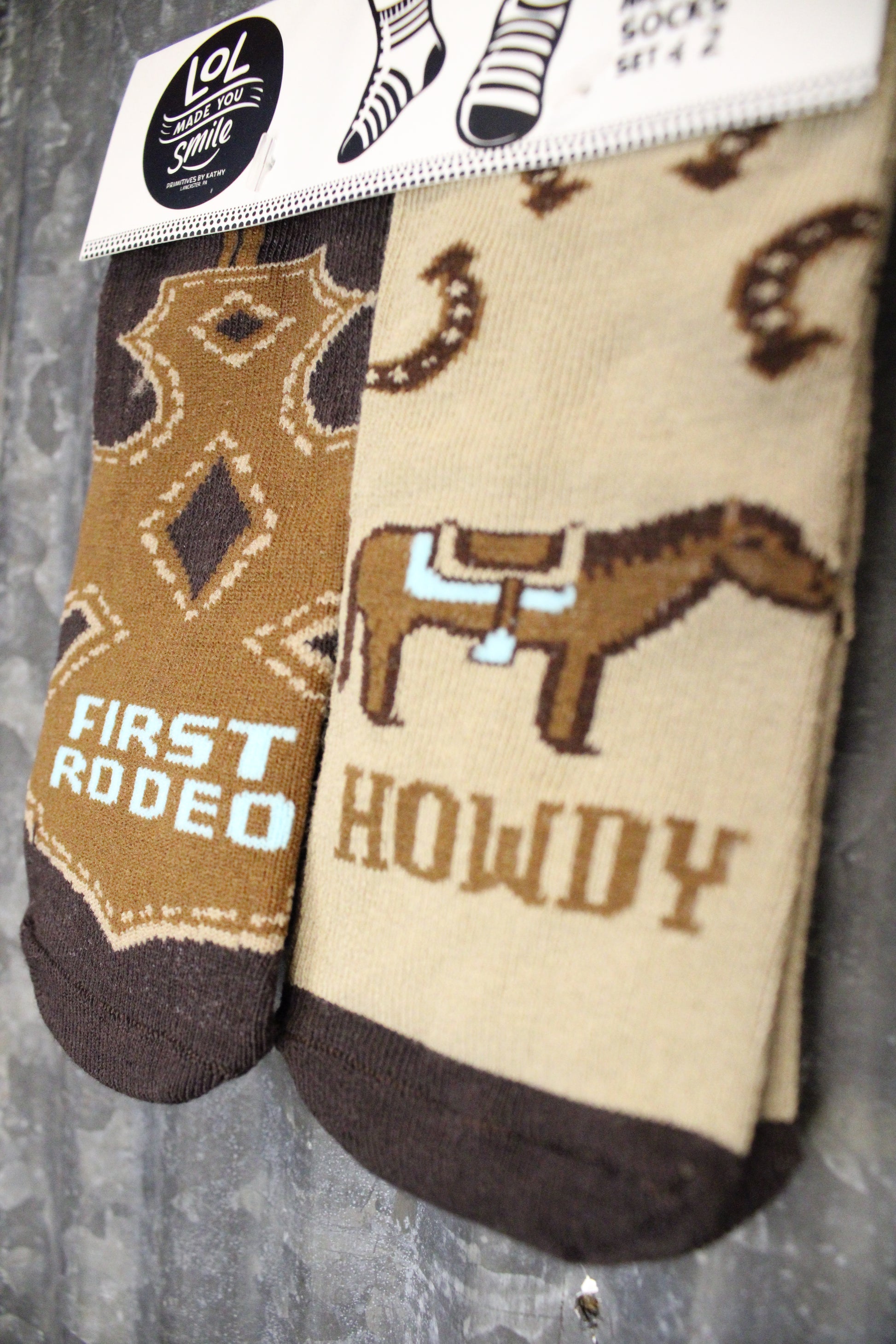 Introducing the Howdy Baby Sock Set, These adorable western-themed baby socks are perfect for your little cowpoke’s very first rodeo! This two-pair set features one boot-inspired design that says “First Rodeo” and another with a cute horse and the word “Howdy.”