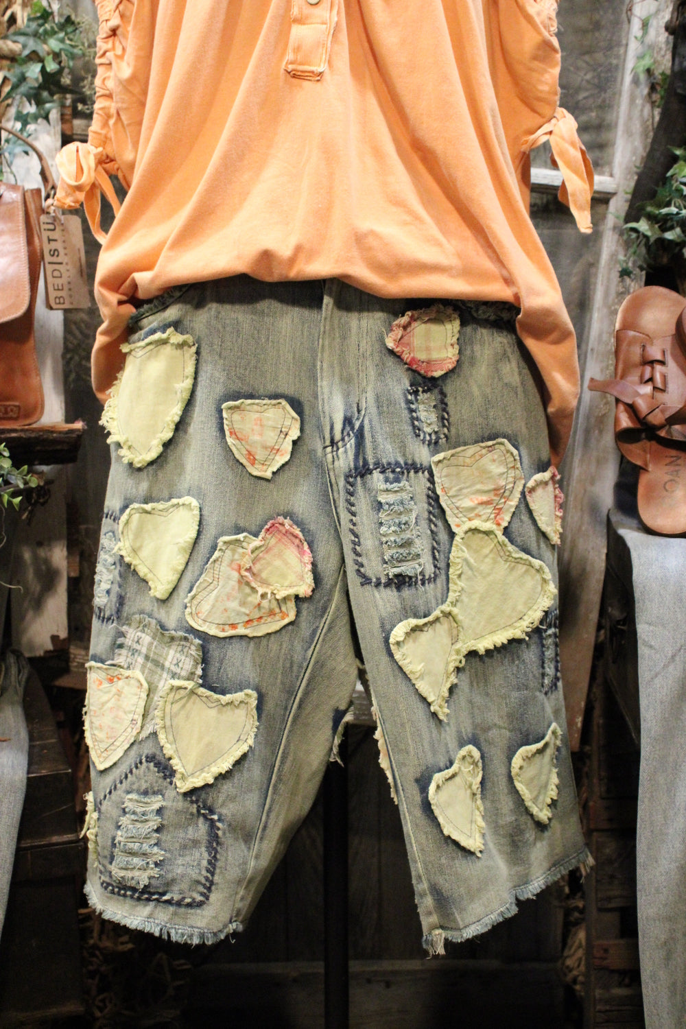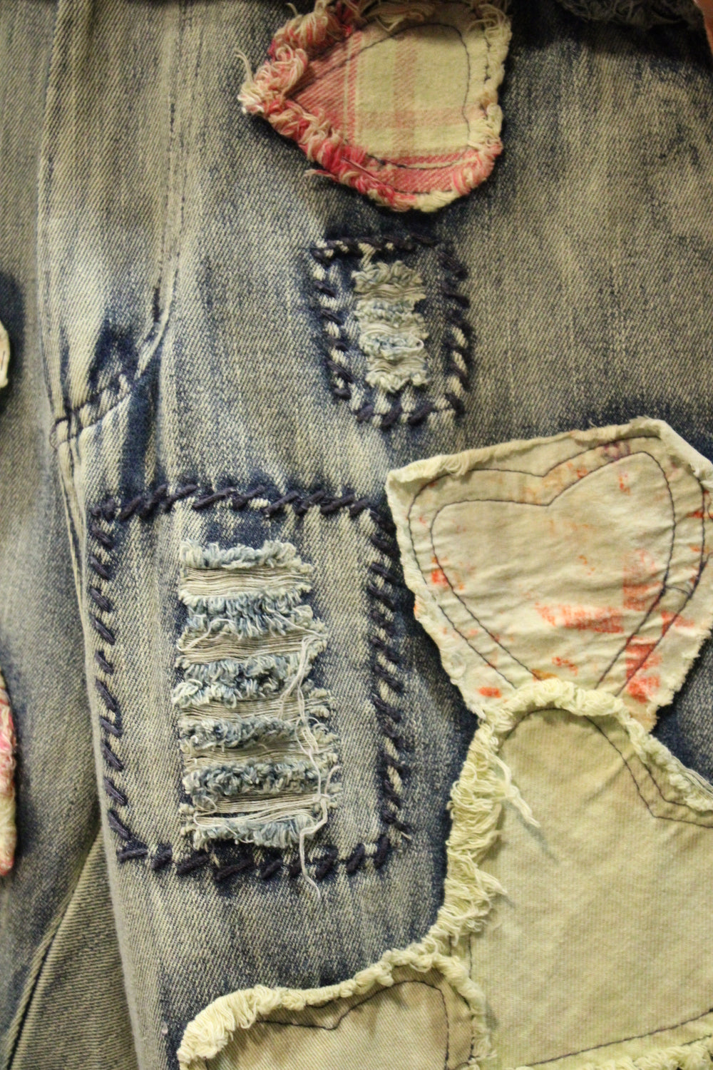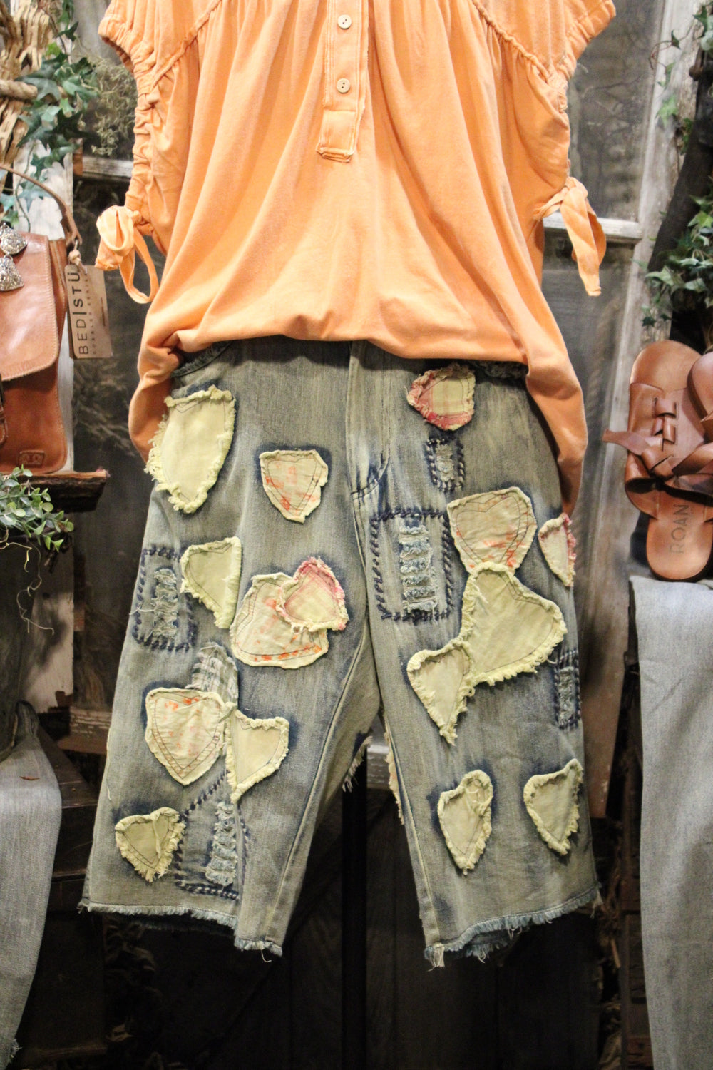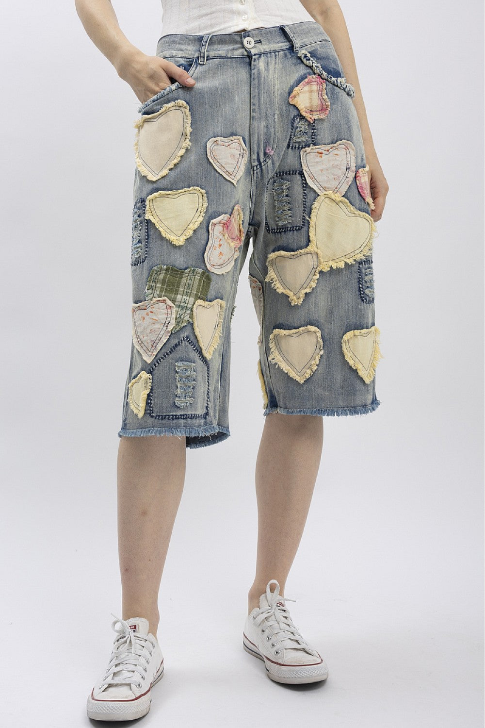 Introducing the Hugs & Stitches Shorts- Make a statement without saying a word in these standout patchwork heart denim shorts. Designed for the trendsetter with a love for vintage flair, these relaxed-fit, mid-rise shorts feature soft, washed denim and eye-catching heart-shaped patchwork in mixed pastel and plaid fabrics. The raw edges and visible stitching give just the right amount of edge, while the unique handcrafted feel keeps things fresh and fashion-forward.