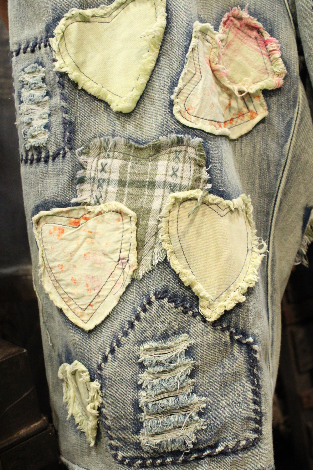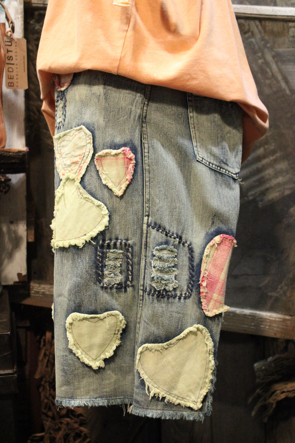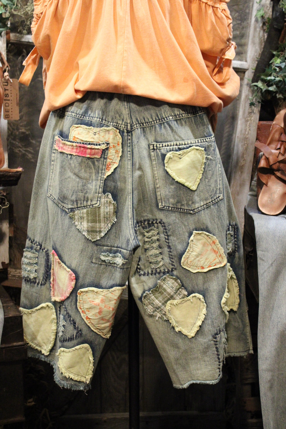 Introducing the Hugs & Stitches Shorts- Make a statement without saying a word in these standout patchwork heart denim shorts. Designed for the trendsetter with a love for vintage flair, these relaxed-fit, mid-rise shorts feature soft, washed denim and eye-catching heart-shaped patchwork in mixed pastel and plaid fabrics. The raw edges and visible stitching give just the right amount of edge, while the unique handcrafted feel keeps things fresh and fashion-forward.