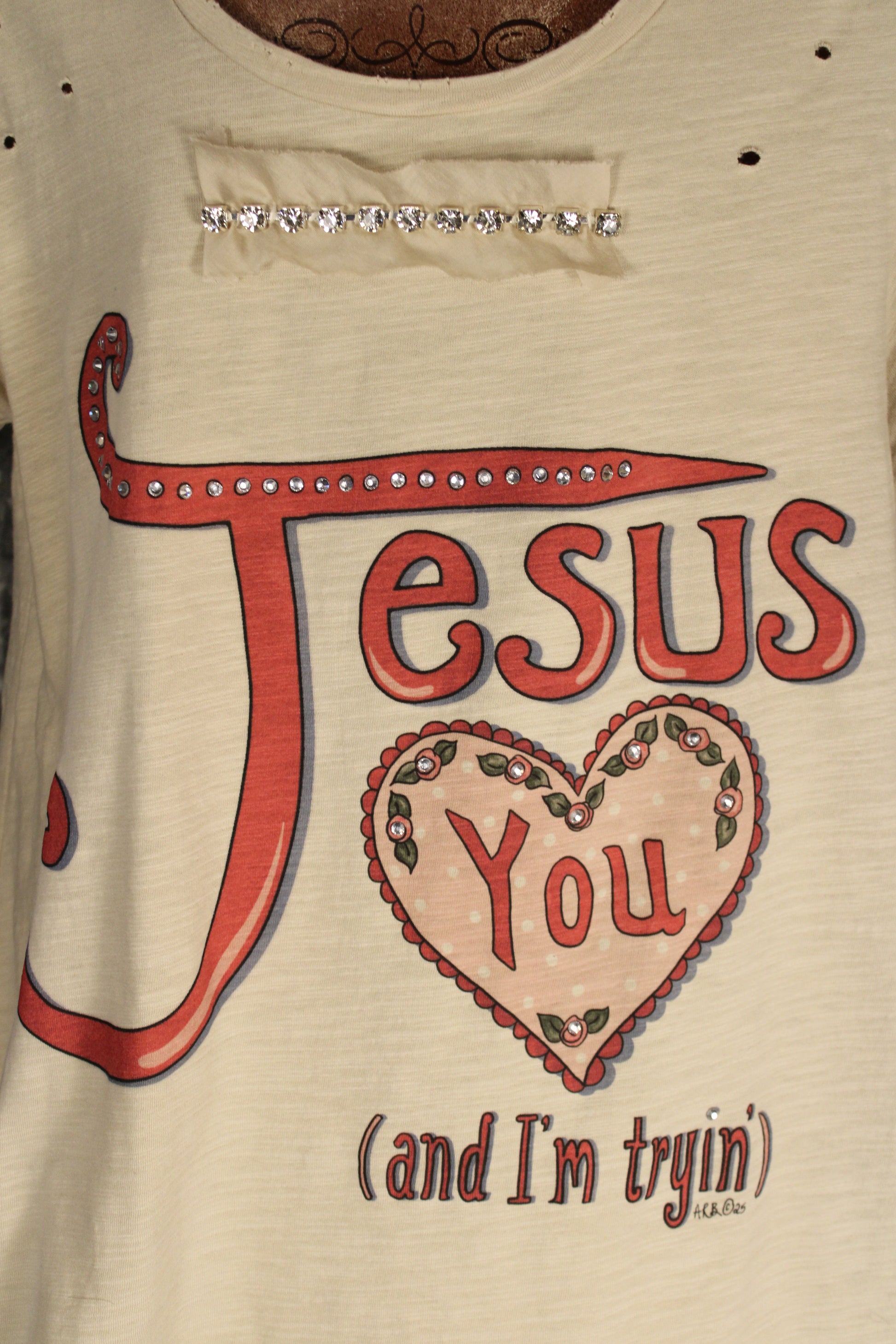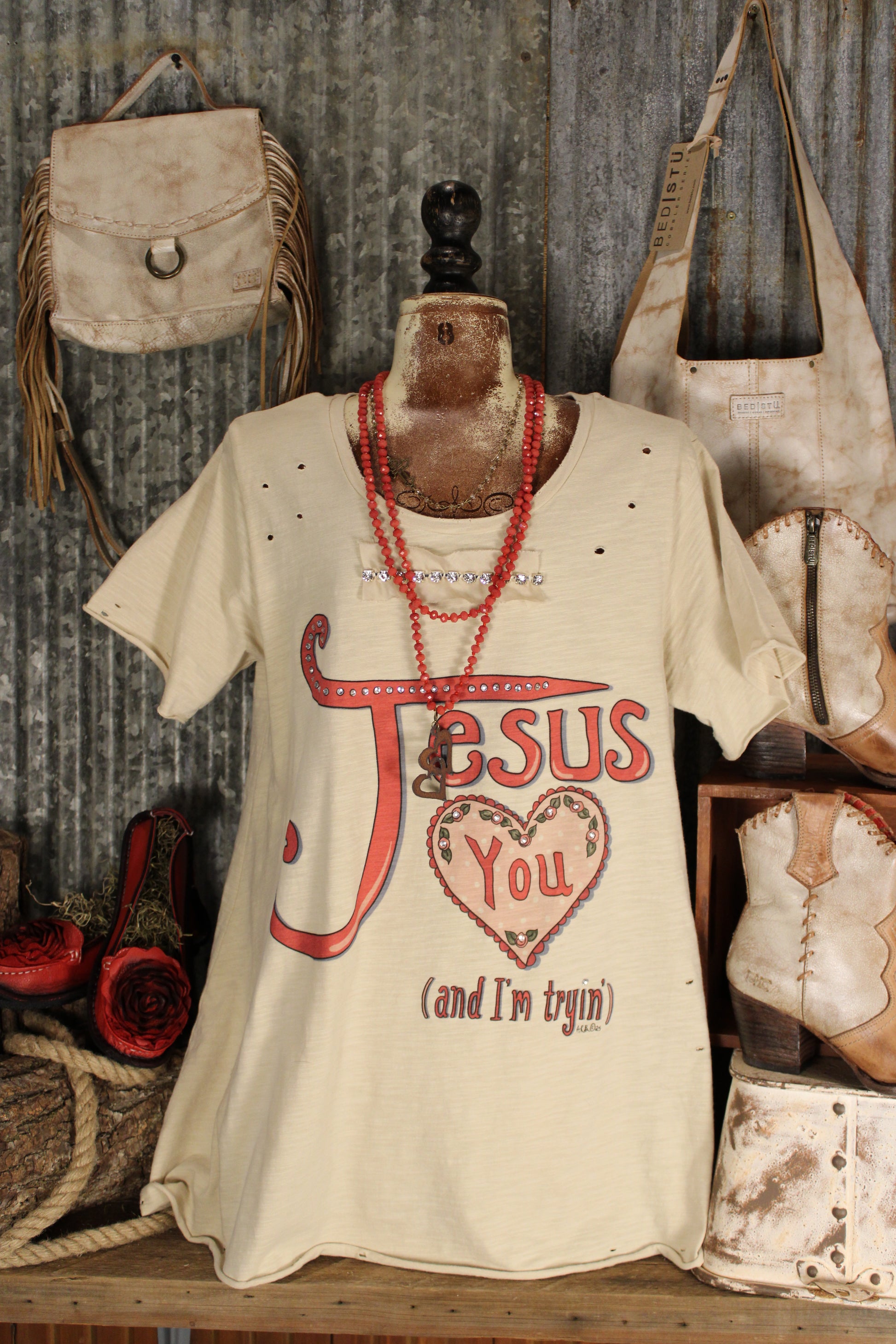 Introducing our Jesus Loves You Tunic, A soulful blend of vintage style and western charm, this A Rare Bird tunic makes a bold statement with its drawn “Jesus Loves You (and I’m tryin’)” design. Crafted in a soft neutral tone with intentional distressing and scattered stud details, this top has that perfectly worn, artistic feel A Rare Bird is known for. The relaxed fit drapes effortlessly for everyday comfort, whether you style it with denim, skirts, or layered under your favorite jacket. A meaningful graphic piece that adds heart, personality, and signature boho flair to your wardrobe.