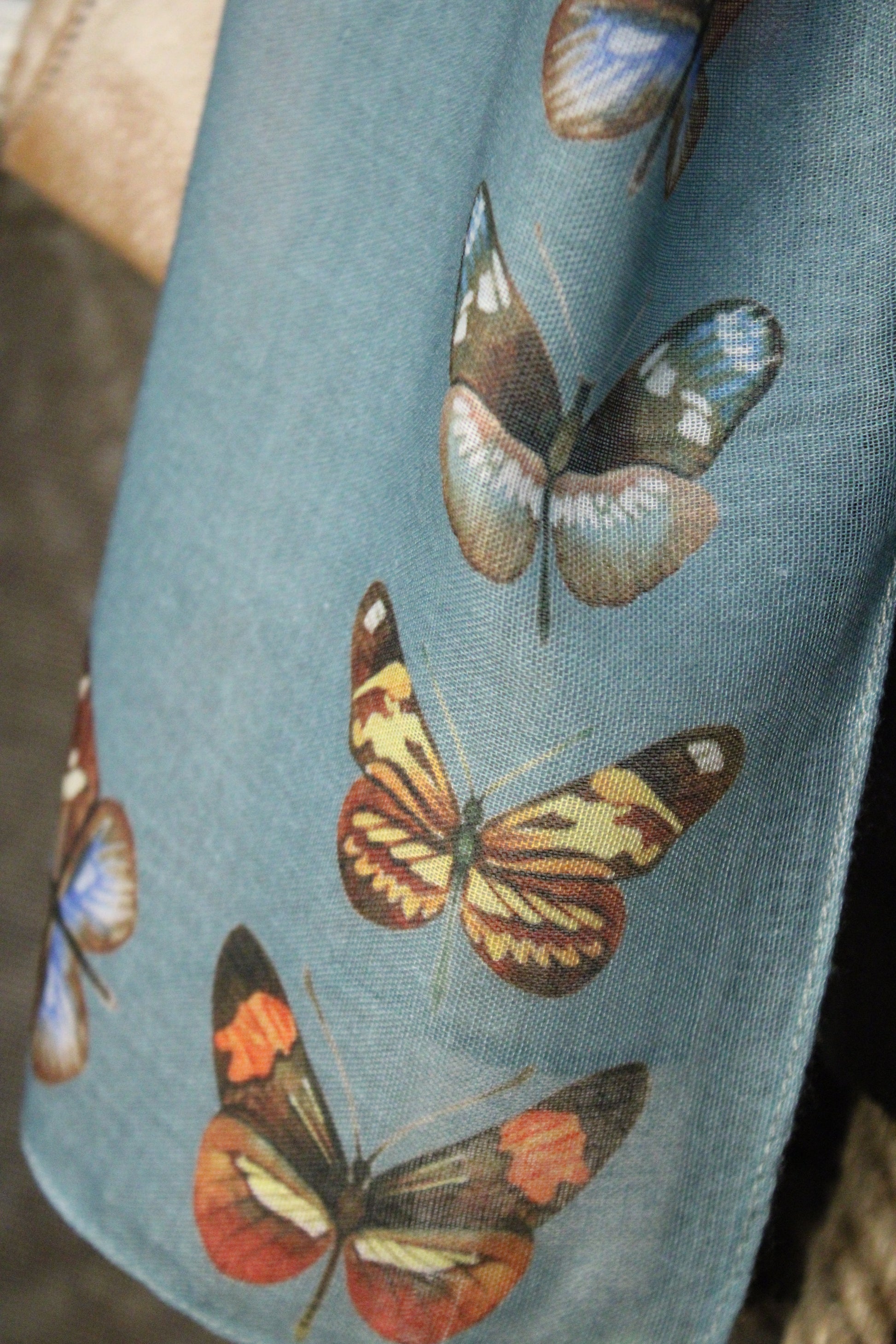 Introducing our Kaleidoscope Wings Scarf, Add a touch of farm-girl magic to your outfit with this beautifully lightweight butterfly scarf. Featuring soft teal tones with warm, earthy accents and fluttering butterfly details, this piece feels playful, free-spirited, and effortlessly charming. The airy fabric drapes just right, giving you that easy, lived-around-the-farm feel without being heavy or fussy.