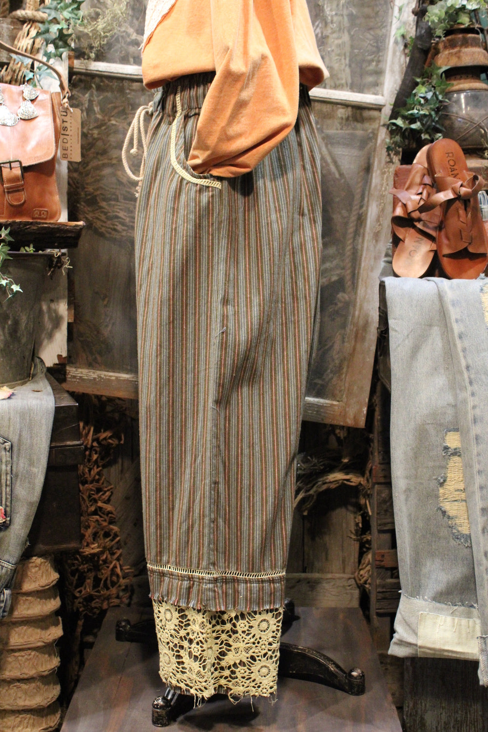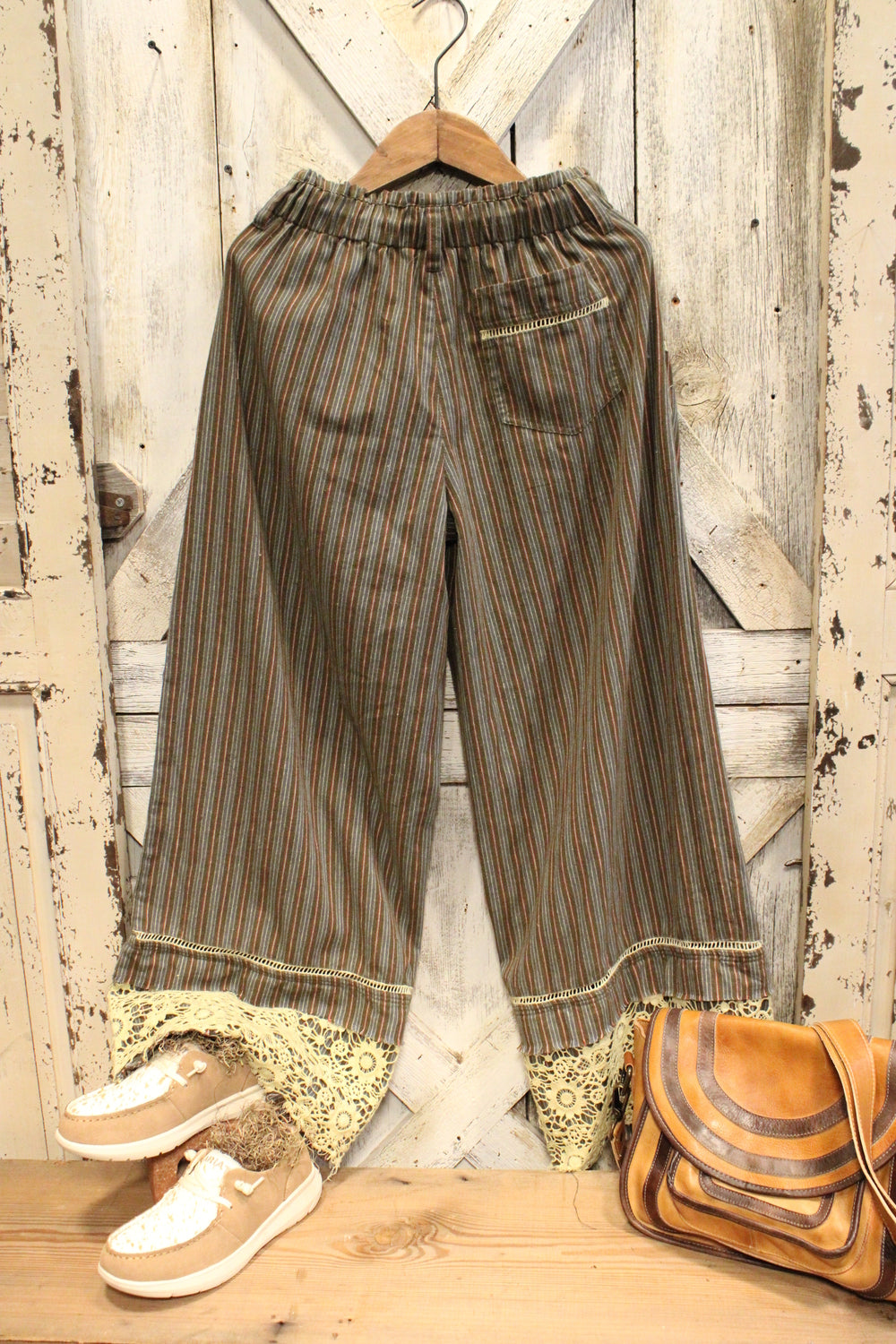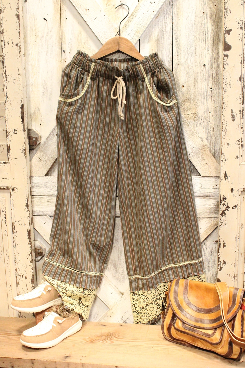 Lasso Lace Pants- Add a touch of vintage charm to your everyday style with our Lasso Lace Pants. Featuring a relaxed, flowy silhouette and a subtle vertical stripe pattern, these pants are both flattering and effortlessly comfortable. The soft drawstring waist offers an adjustable fit, perfect for casual days or creative outings.