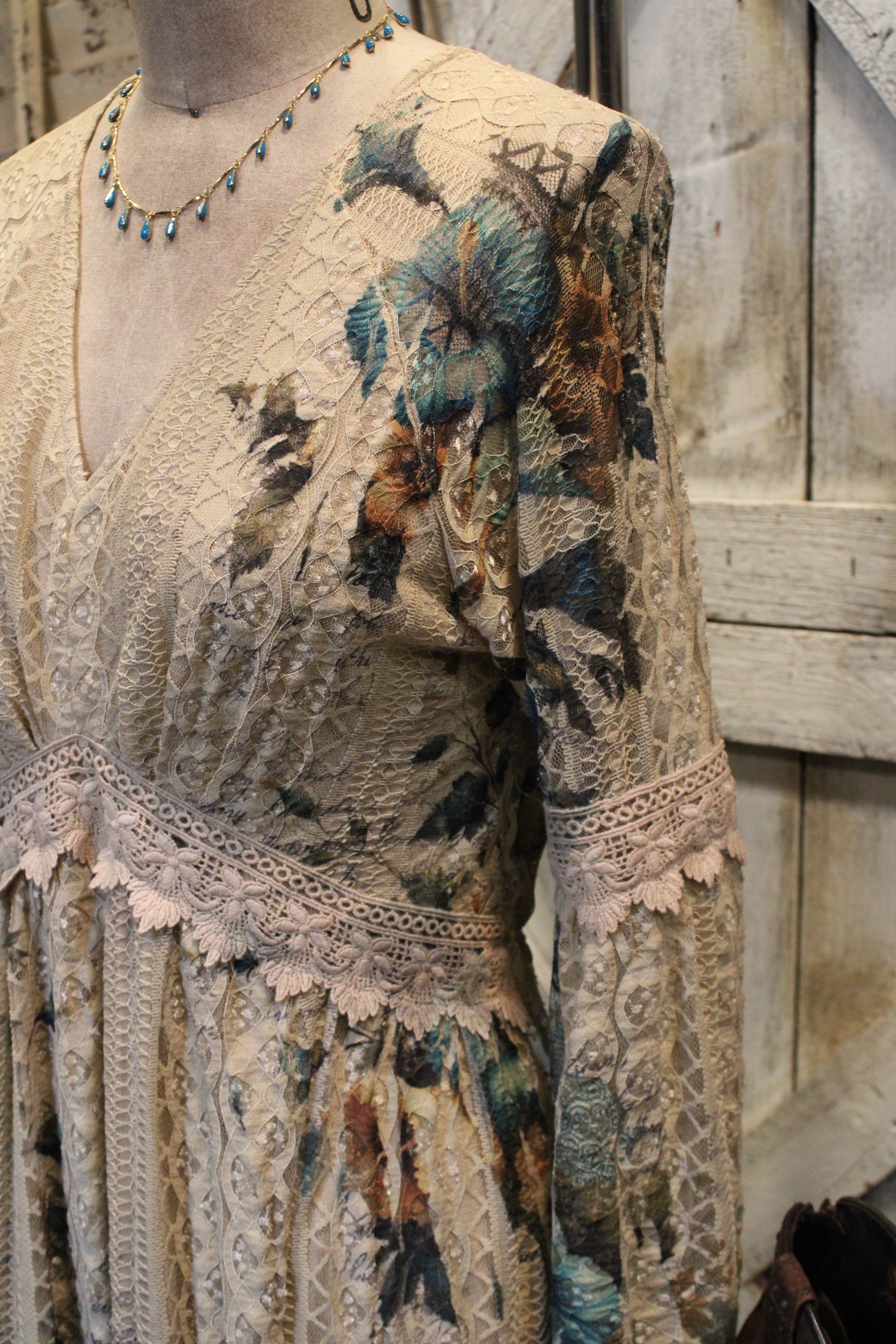 Crafted with intricate lace panels and vintage-inspired florals, this dress is perfect for free spirits, farm girls at heart, or anyone drawn to a rustic bohemian lifestyle. Whether you're strolling through a country fair or twirling at a barn wedding, this dress moves with effortless beauty.