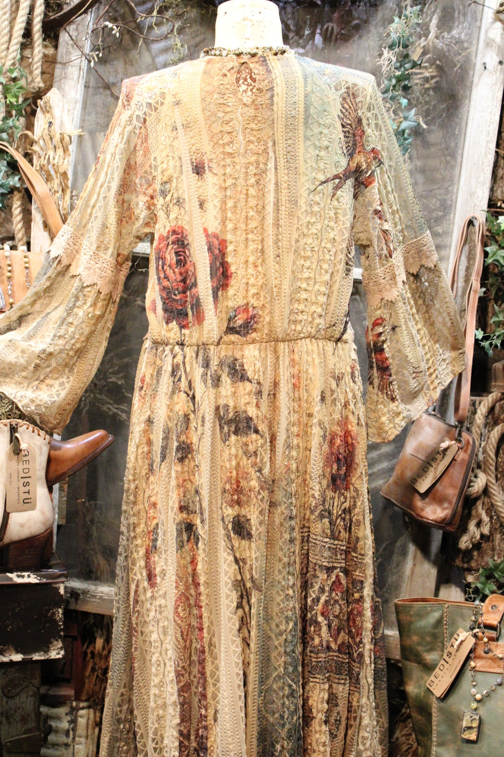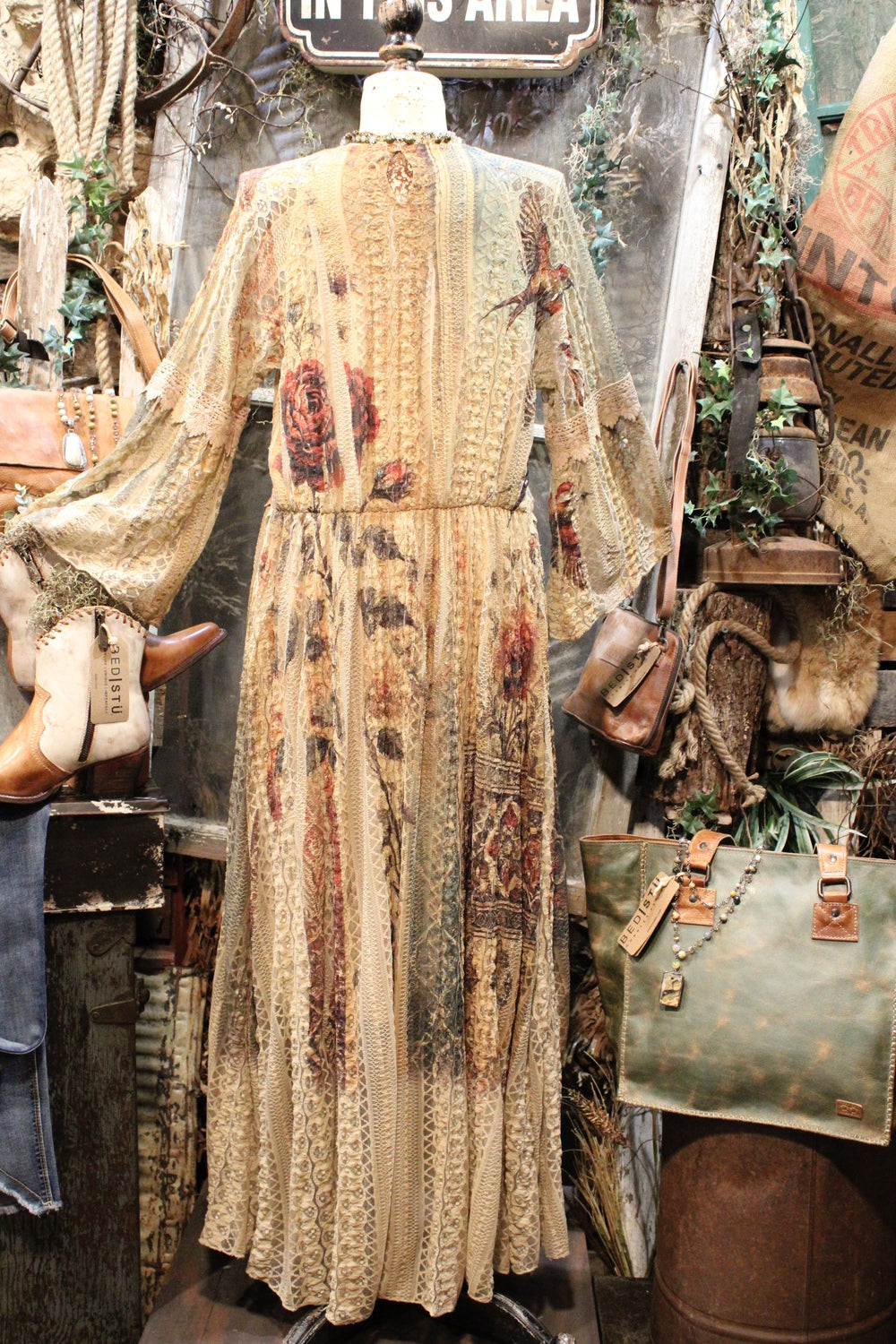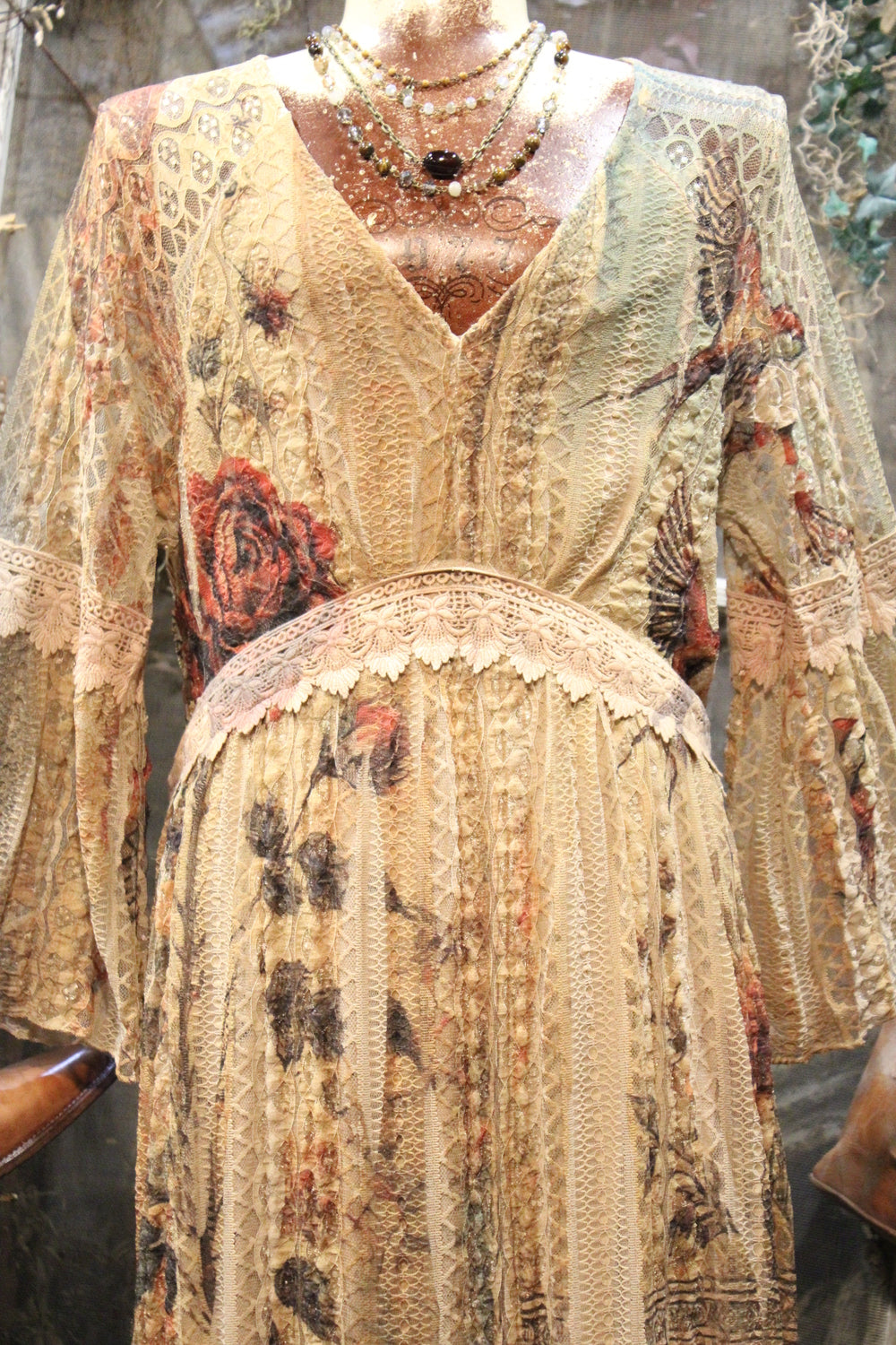 Crafted with intricate lace panels and vintage-inspired florals, this dress is perfect for free spirits, farm girls at heart, or anyone drawn to a rustic bohemian lifestyle. Whether you're strolling through a country fair or twirling at a barn wedding, this dress moves with effortless beauty.