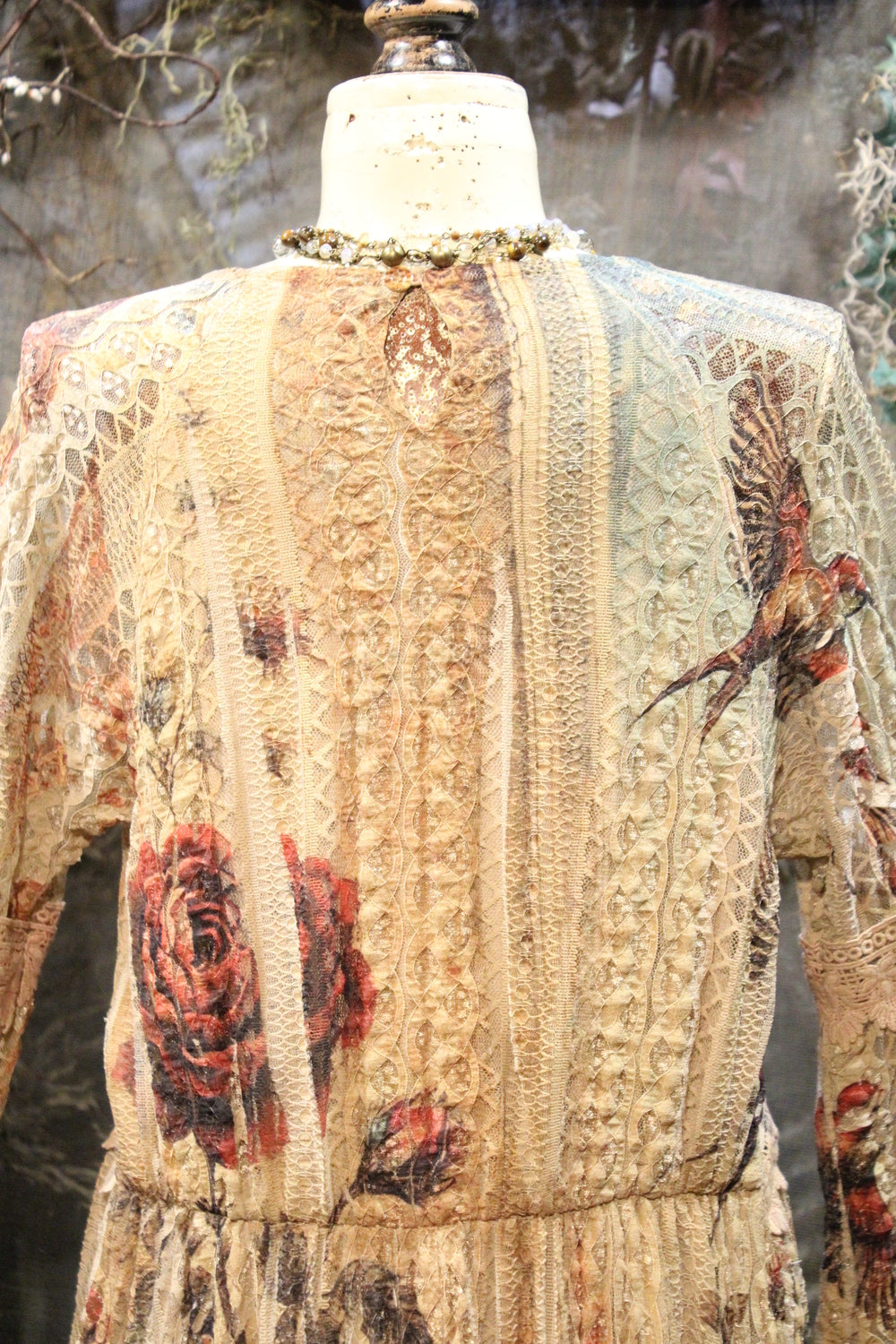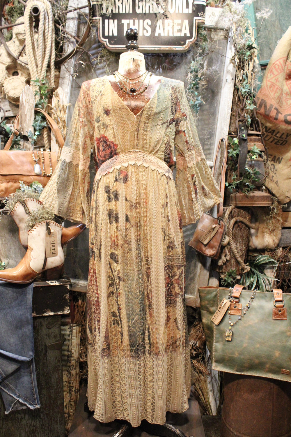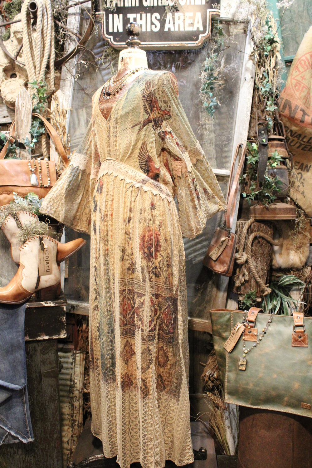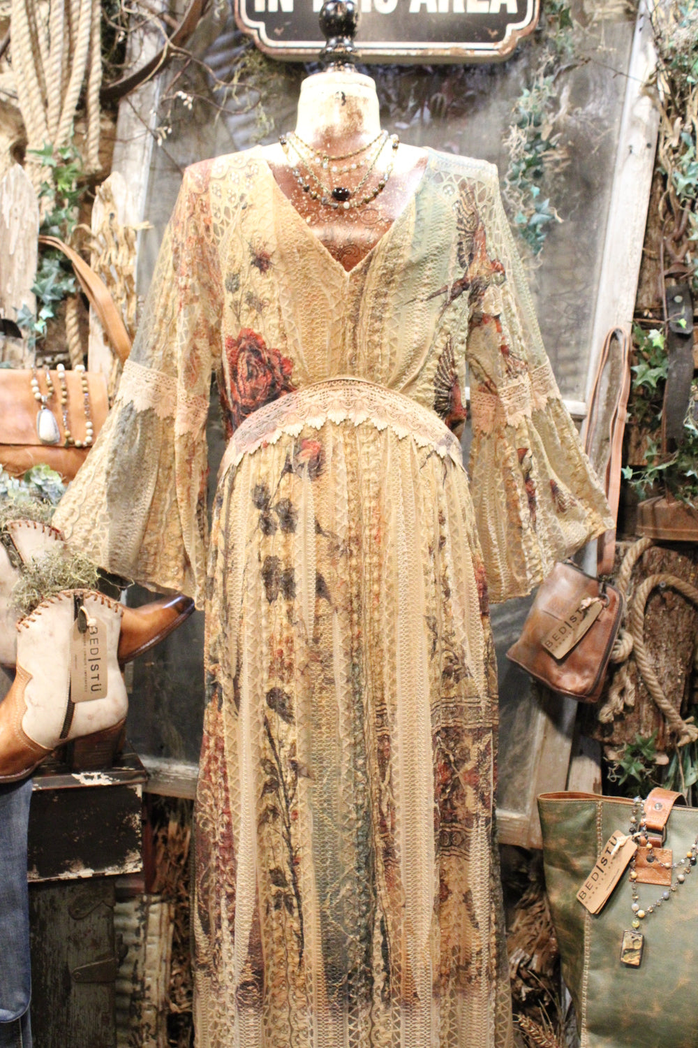 Crafted with intricate lace panels and vintage-inspired florals, this dress is perfect for free spirits, farm girls at heart, or anyone drawn to a rustic bohemian lifestyle. Whether you're strolling through a country fair or twirling at a barn wedding, this dress moves with effortless beauty.