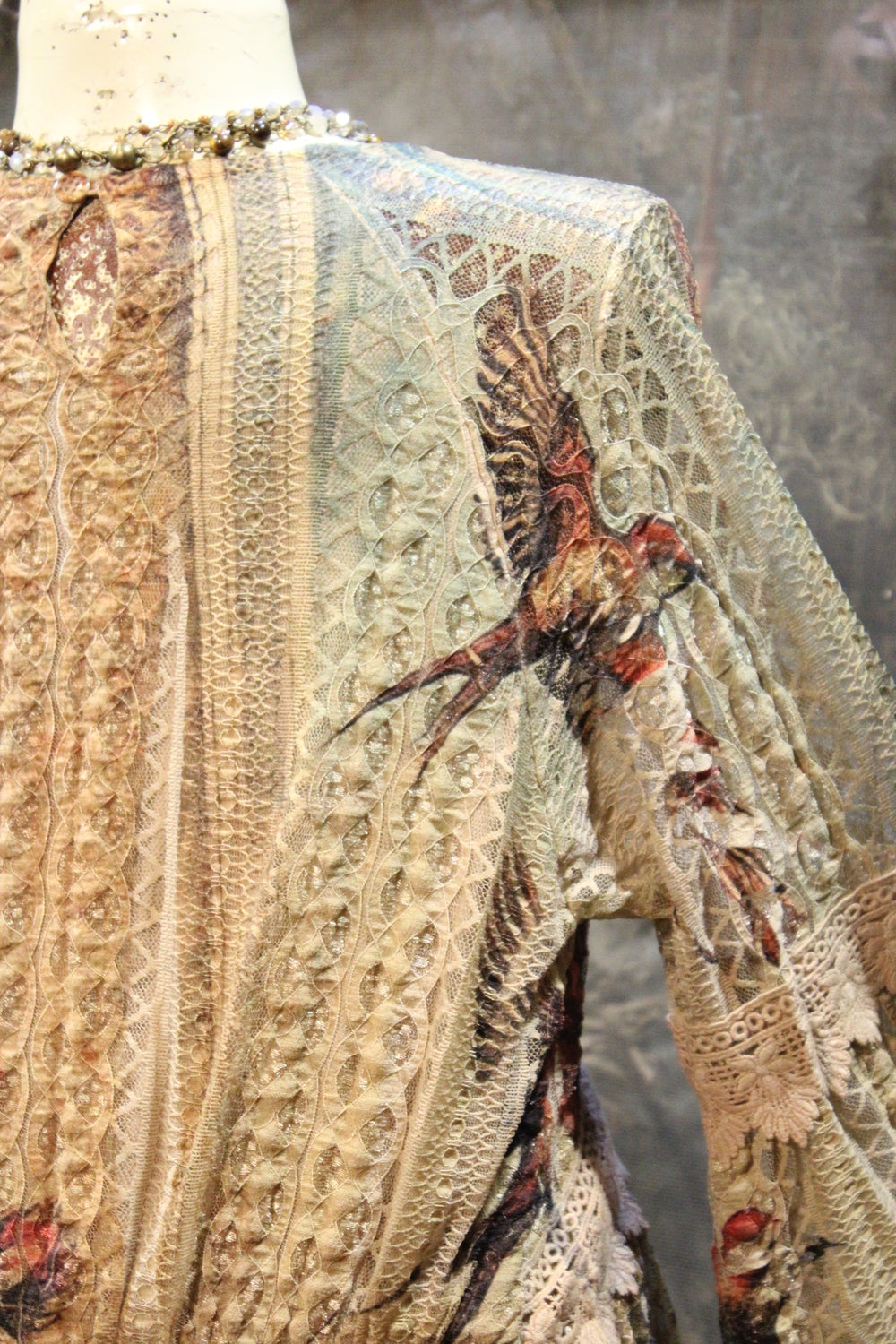Introducing the Lead Singer Vintage Bird Taupe Maxi Dress- Step into timeless elegance with this gorgeous maxi dress. This enchanting piece blends rustic charm with feminine grace, featuring delicate lace, floral prints, and soft earthy tones. The flattering V-neckline and empire waist accentuate the silhouette, while the sheer, bell sleeves add a touch of whimsy and romantic flair.