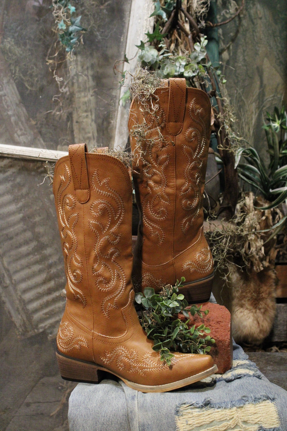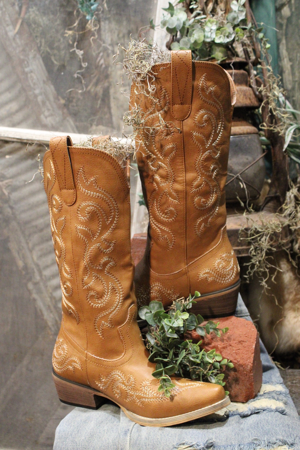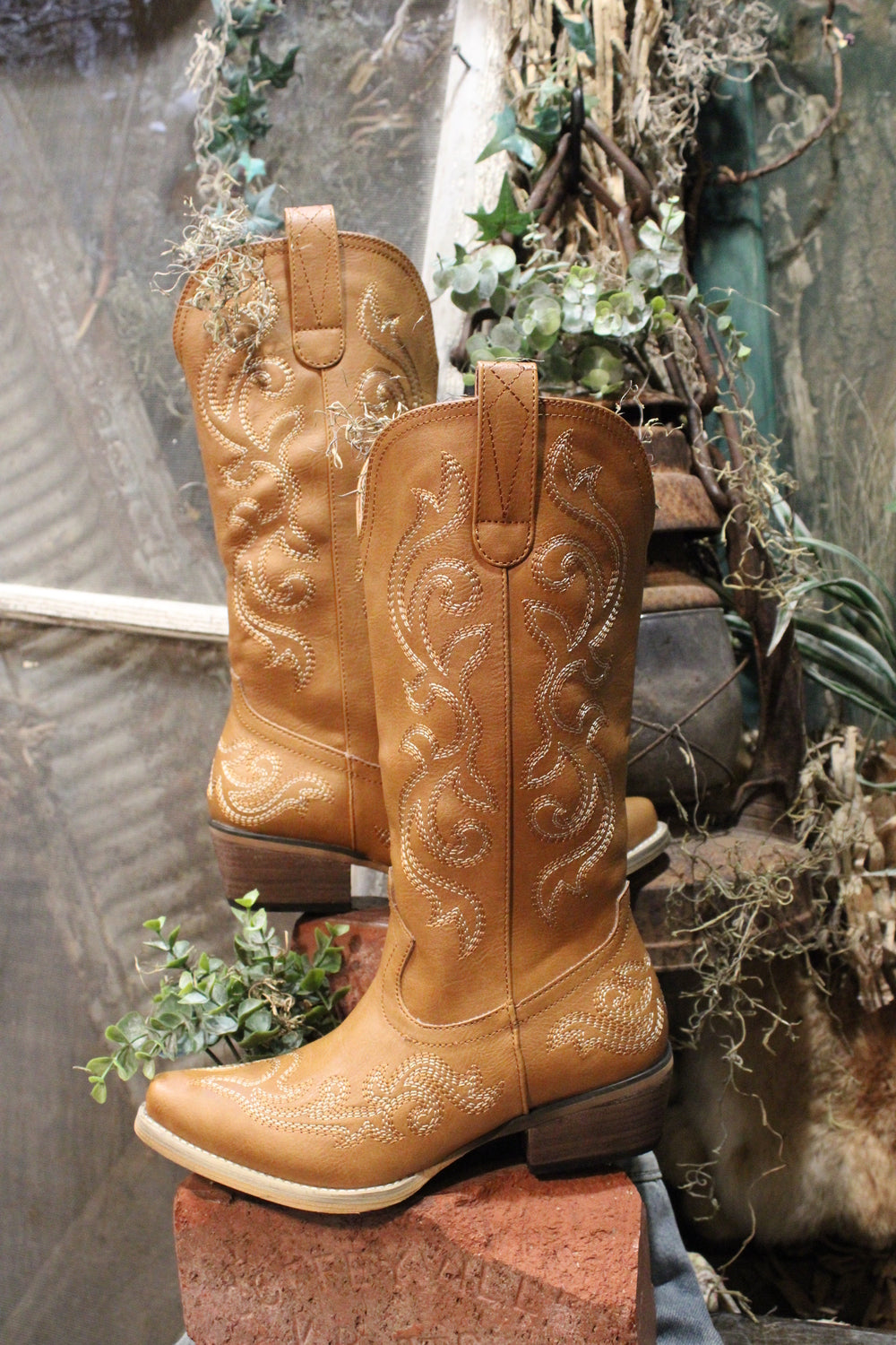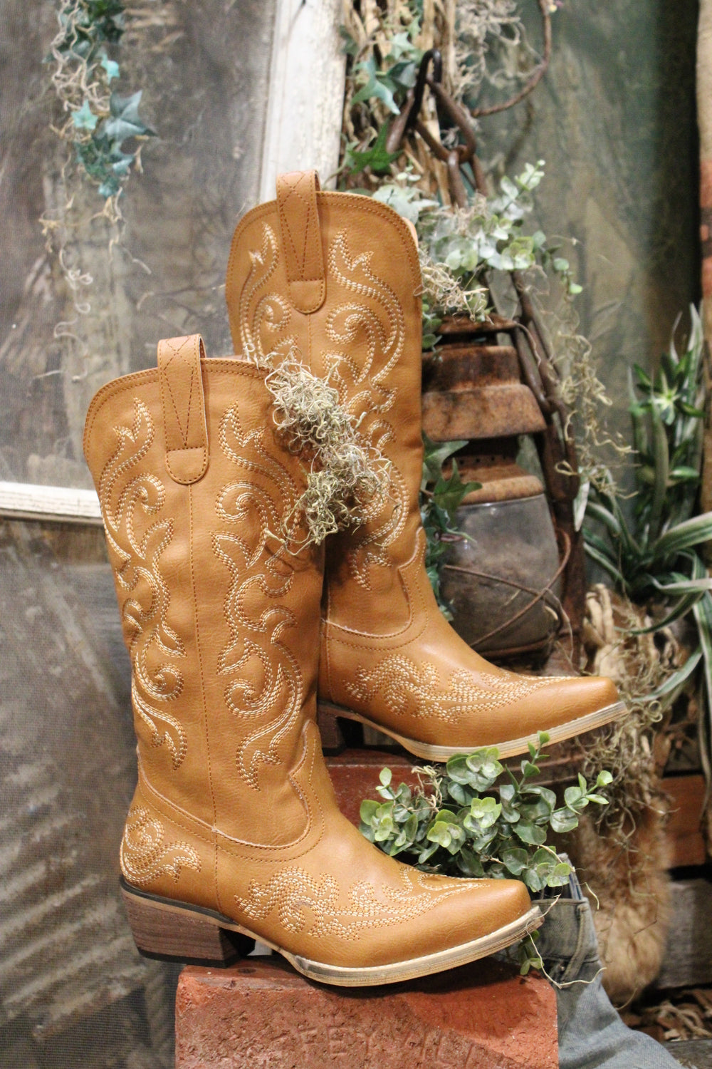 Introducing the Lily Pearl Cowgirl Boots - Saddle up in timeless Western style with these stunning tan cowboy boots. These boots feature intricate embroidery that swirls along the shaft and toe, offering an elegant twist on classic cowgirl charm. The stacked heel and pointed toe provide a flattering look and all-day comfort, while pull tabs make them easy to slip on and off. Whether you're heading to the rodeo or just rocking everyday country flair, these boots were made for walking—and turning heads.