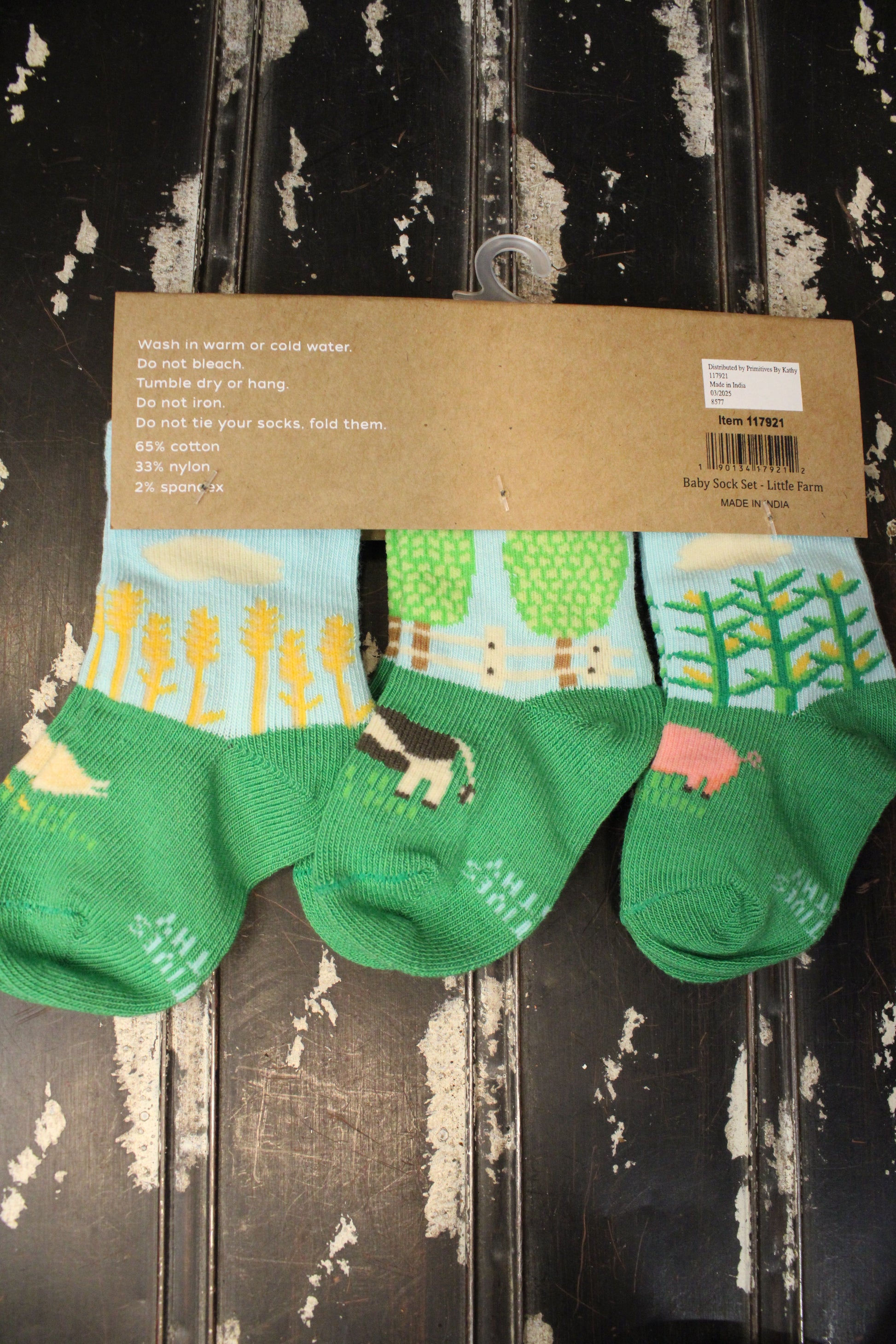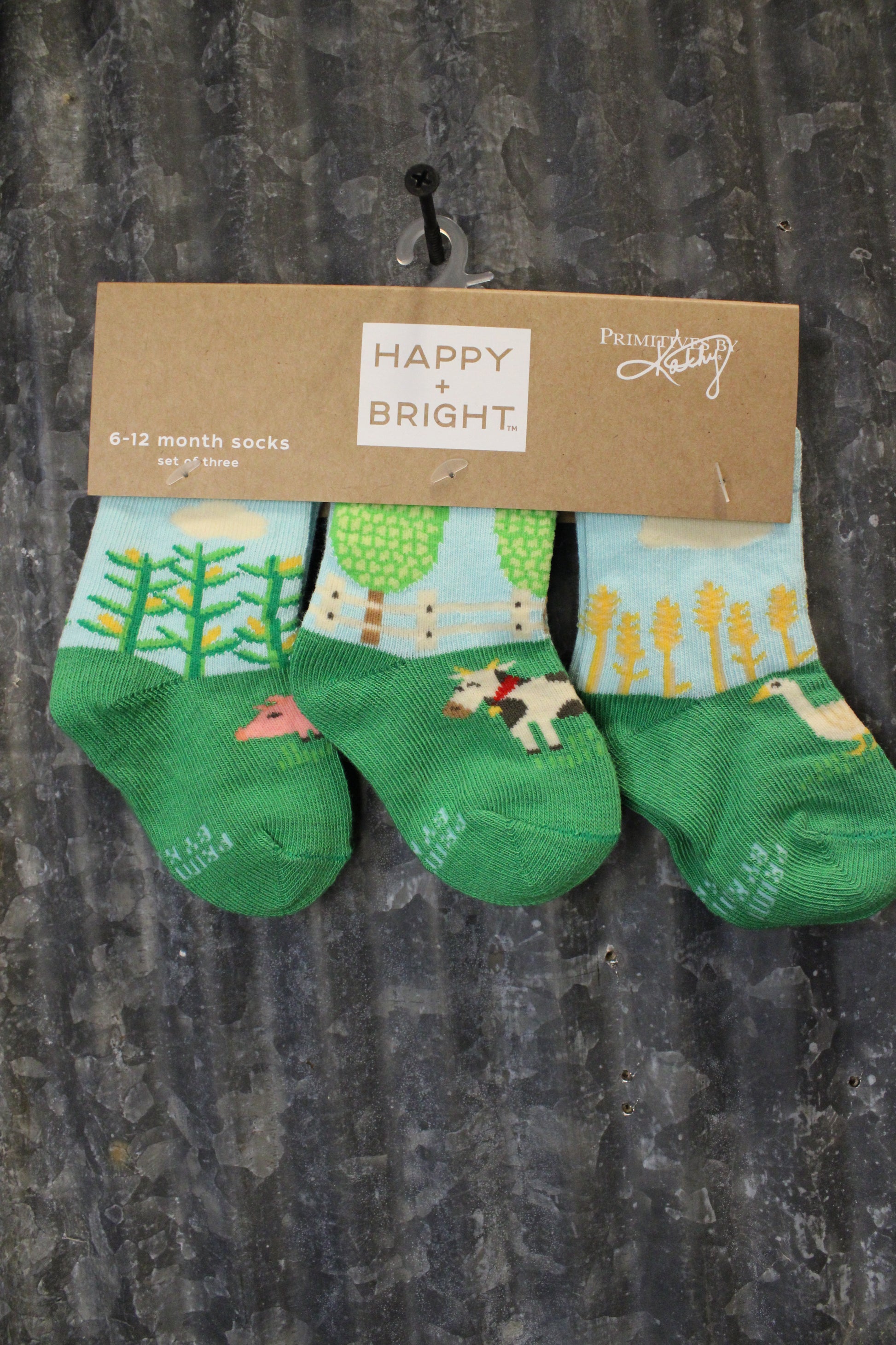 Introducing our adorable Little Farm Baby Sock Set, Your little farmhand will be the cutest thing in the barnyard with these Happy + Bright baby socks by Primitives by Kathy! This adorable 3-pair set features cheerful farm friends — a pig, a cow, and a duck — surrounded by colorful pastures and sunshine.