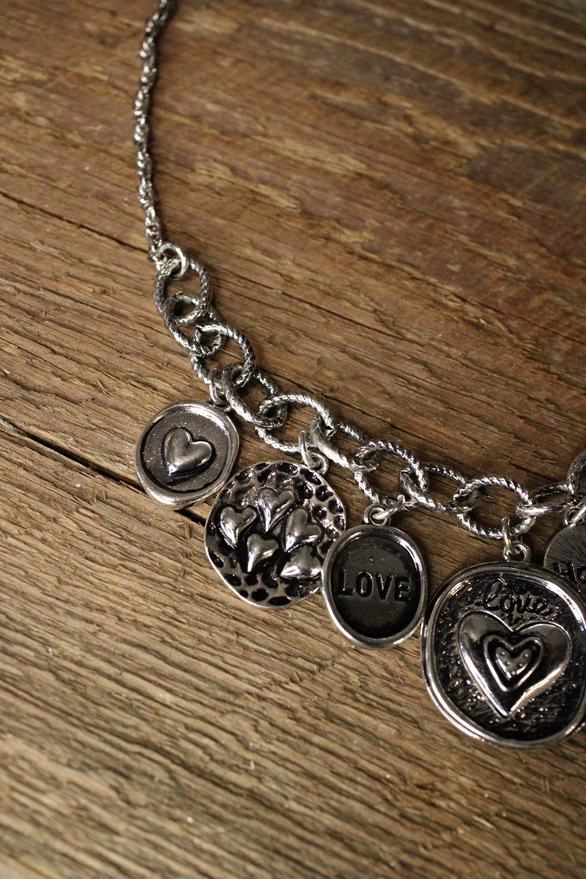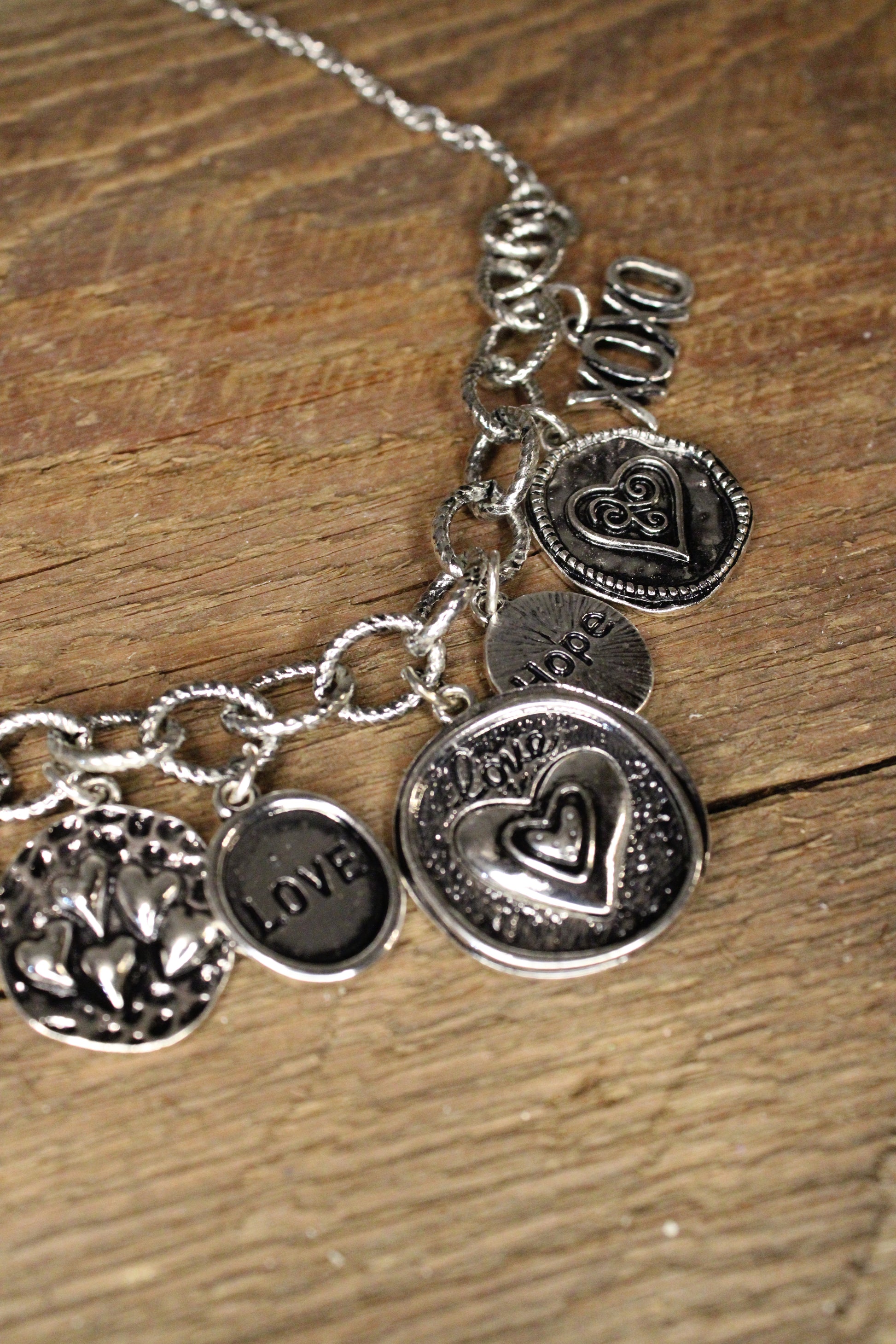 Introducing our charming Love And Hope Charm Necklace, This charm necklace is full of sweet sentiment and timeless style. Designed with a silver-tone chain, it features a collection of heart-inspired charms, including meaningful words like love and hope, along with delicate textures and playful details that add depth and personality.