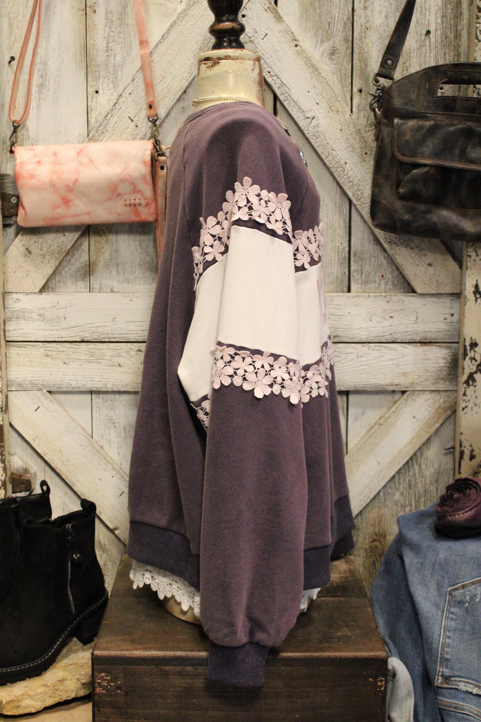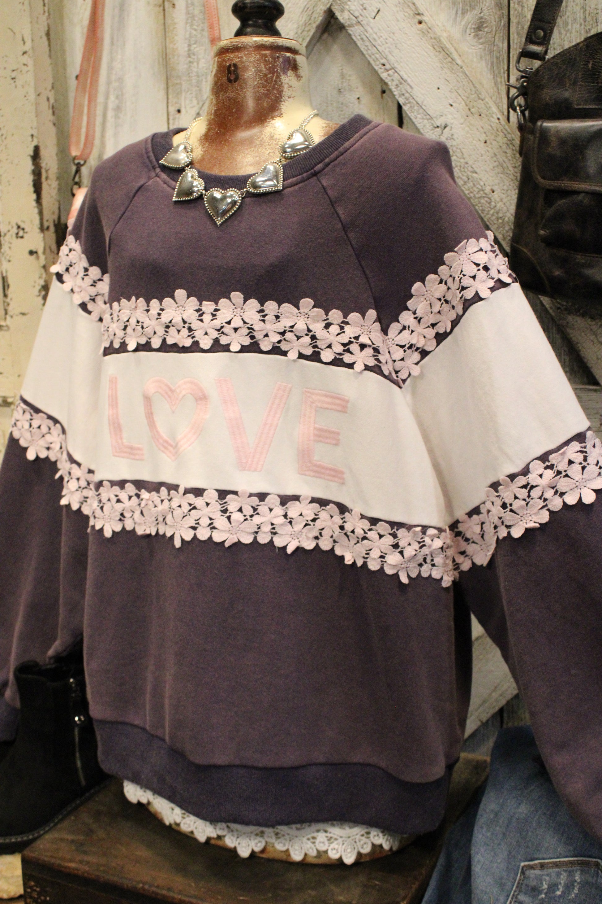 Introducing the Love Blooms Cotton Sweatshirt - the softest little reminder to lead with LOVE. This cozy sweatshirt blends vintage charm with sweet feminine details — featuring dusty-purple mineral wash fabric, creamy color-blocking, and rows of delicate pink daisy lace. The appliqué “LOVE” lettering (with the cutest heart in place of the O!) adds the perfect touch of whimsy.