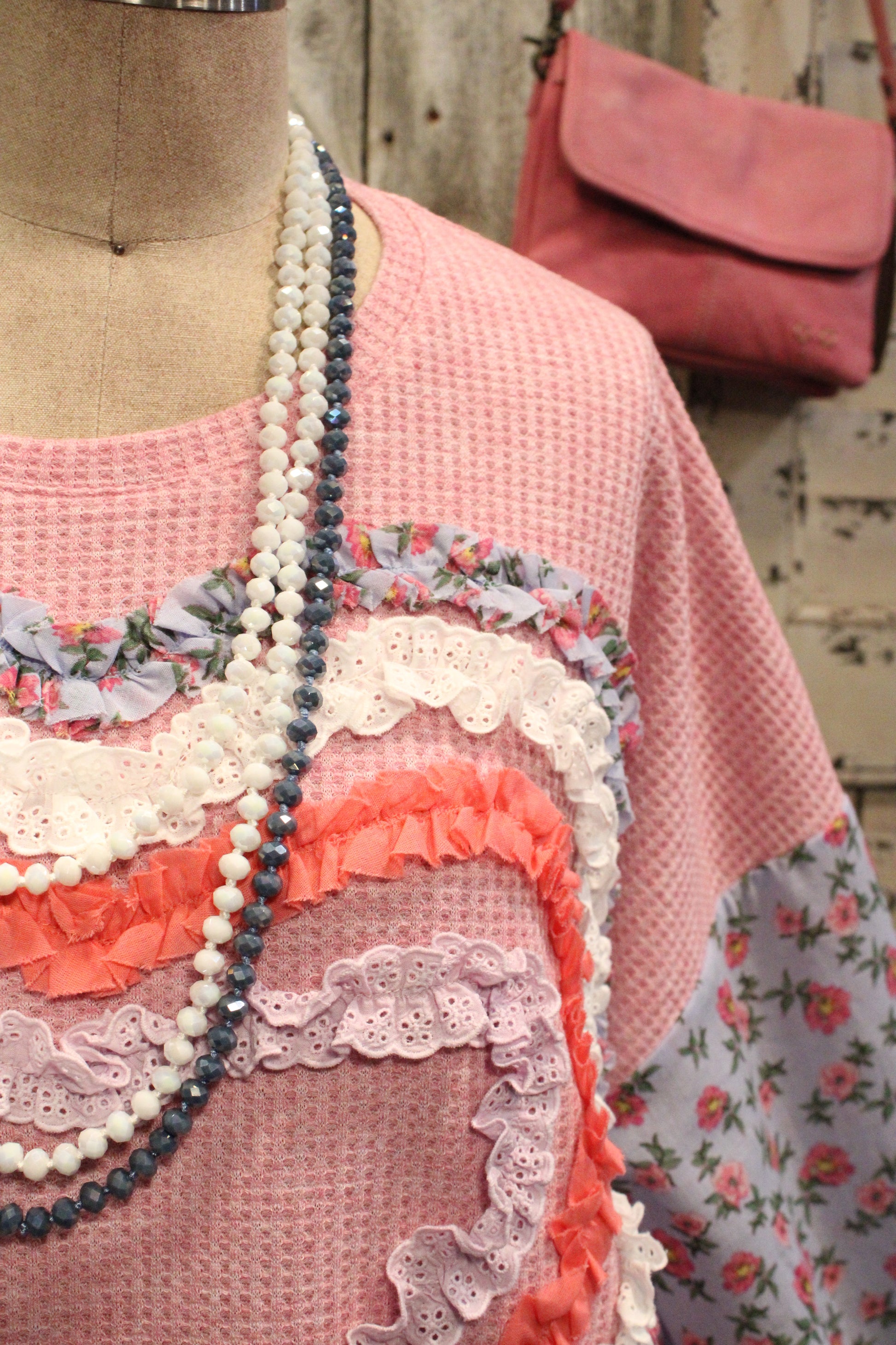 Introducing the Love In Bloom Waffle-Knit Top- Sweet, cozy, and full of charm, this pink patchwork top is made to steal hearts. Featuring a soft waffle-knit base, it’s detailed with a statement heart applique at the front layered in coordinating fabrics for a beautifully textured, handcrafted look. The floral contrast sleeves add a playful pop, while the relaxed fit keeps it comfortable and easy to wear.